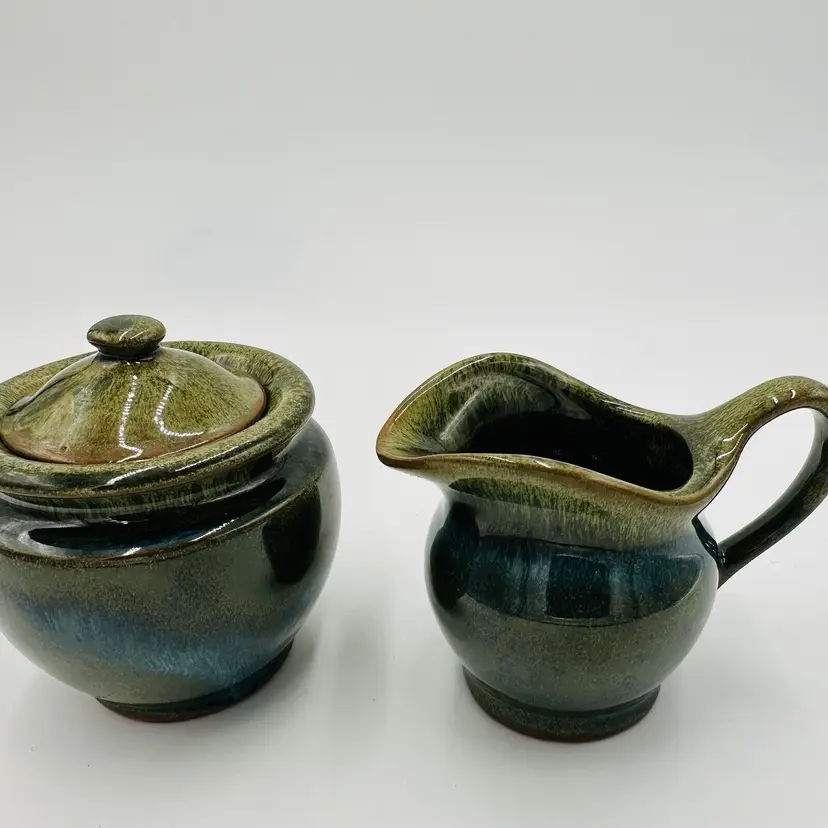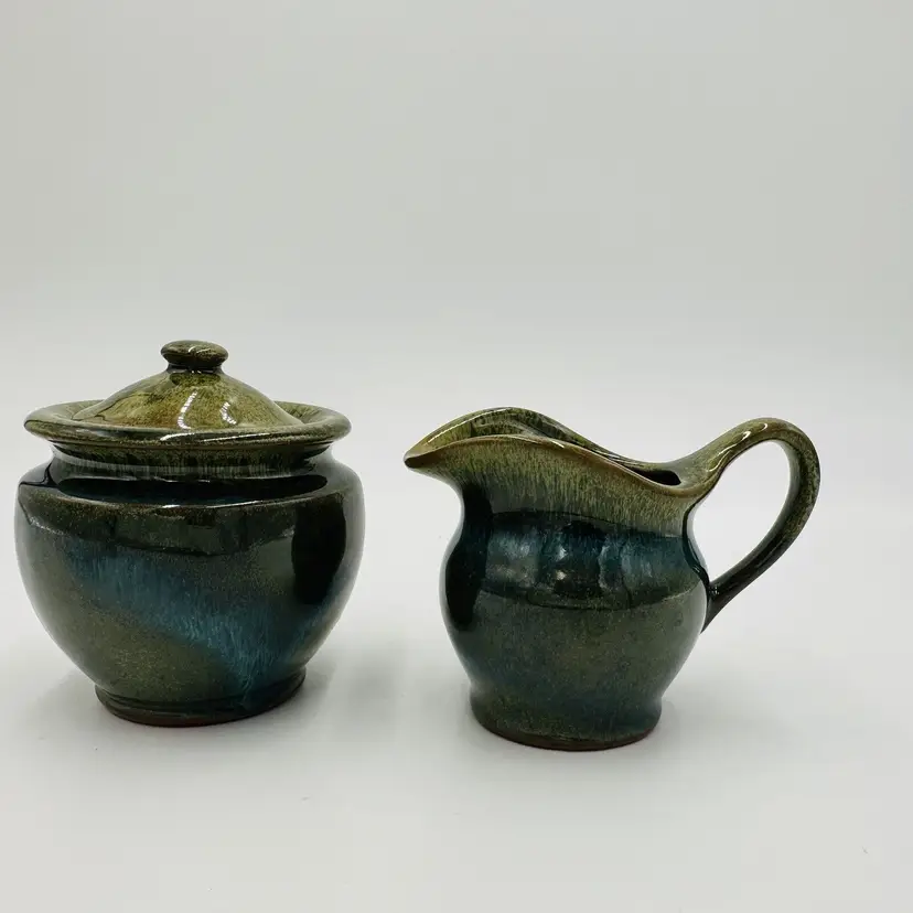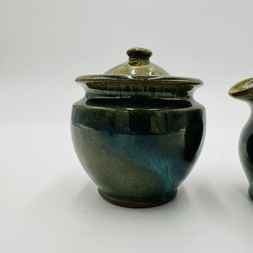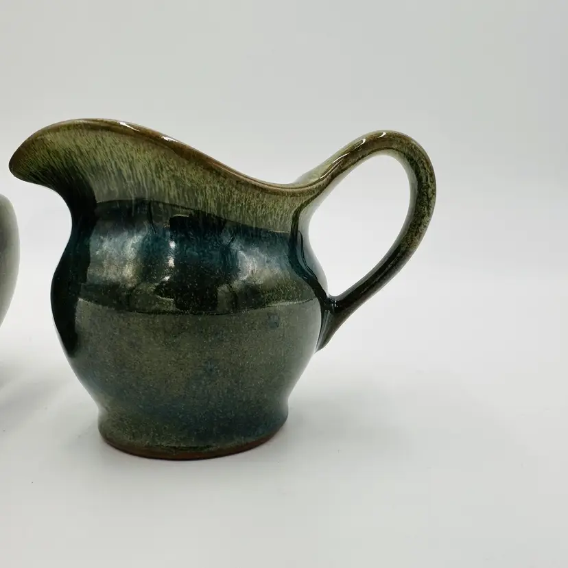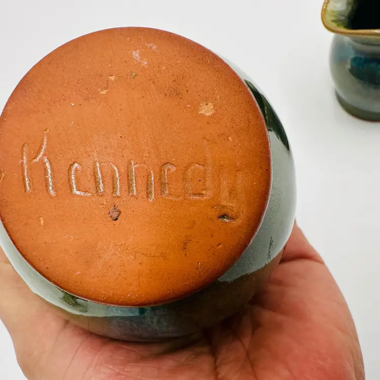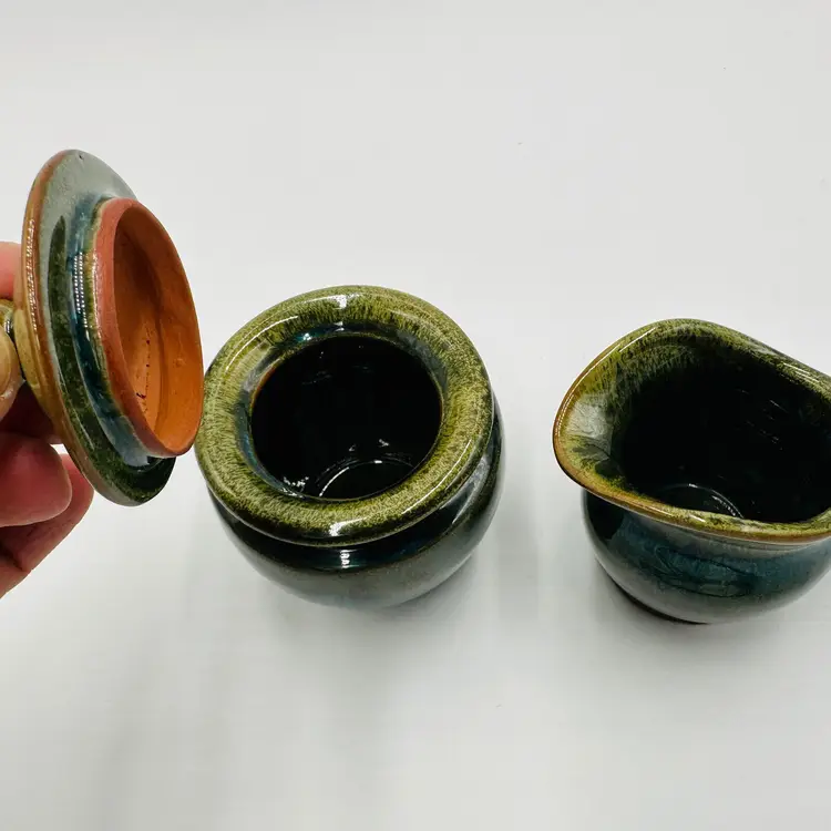 Features: Lidded Handmade: Yes Item Width: 3 in Pattern: Botanical Time Period Manufactured: 1990-1999 Production Technique: Pottery Item Length: 3 in Item Height: 3 in Number of Items in Set: 2 Vintage: Yes Country/Region of Manufacture: United States Origin: United States Material: Terracotta, Stoneware Product Line: Art Pottery Shape: Abstract Packaging: Unboxed Item Weight: 1 lb Finish: Glossy Production Style: Art Pottery Brand: Kennedy Pottery Style: American Empire Antique: No Color: Green Original/Licensed Reproduction: Original Backstamp: Incised Item Depth: 3 in Item Diameter: 3 in Type: Creamer & Sugar Set