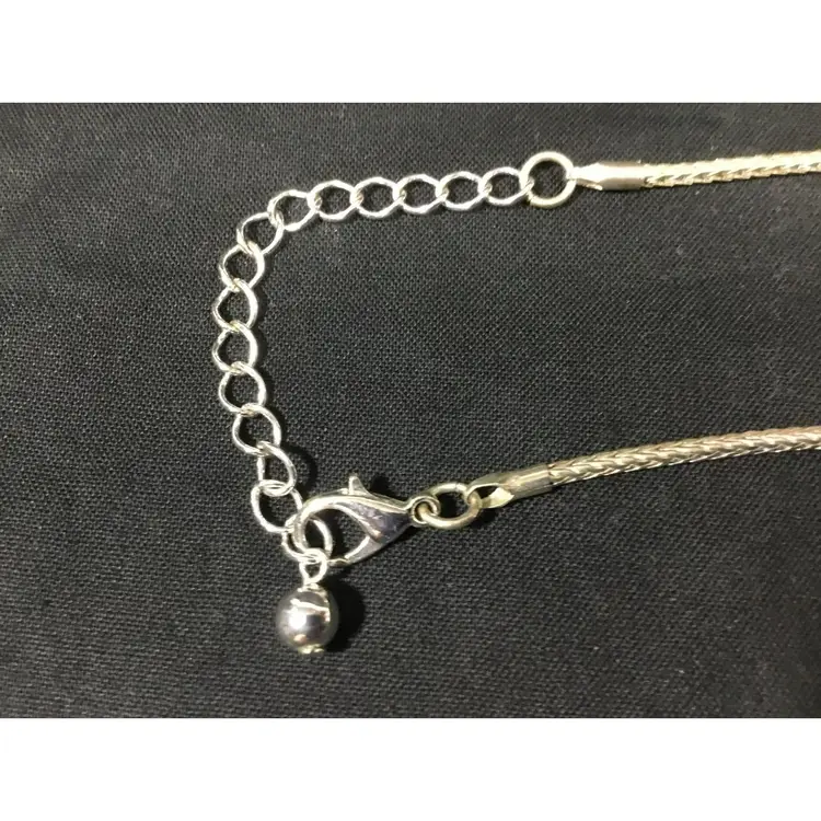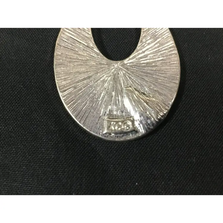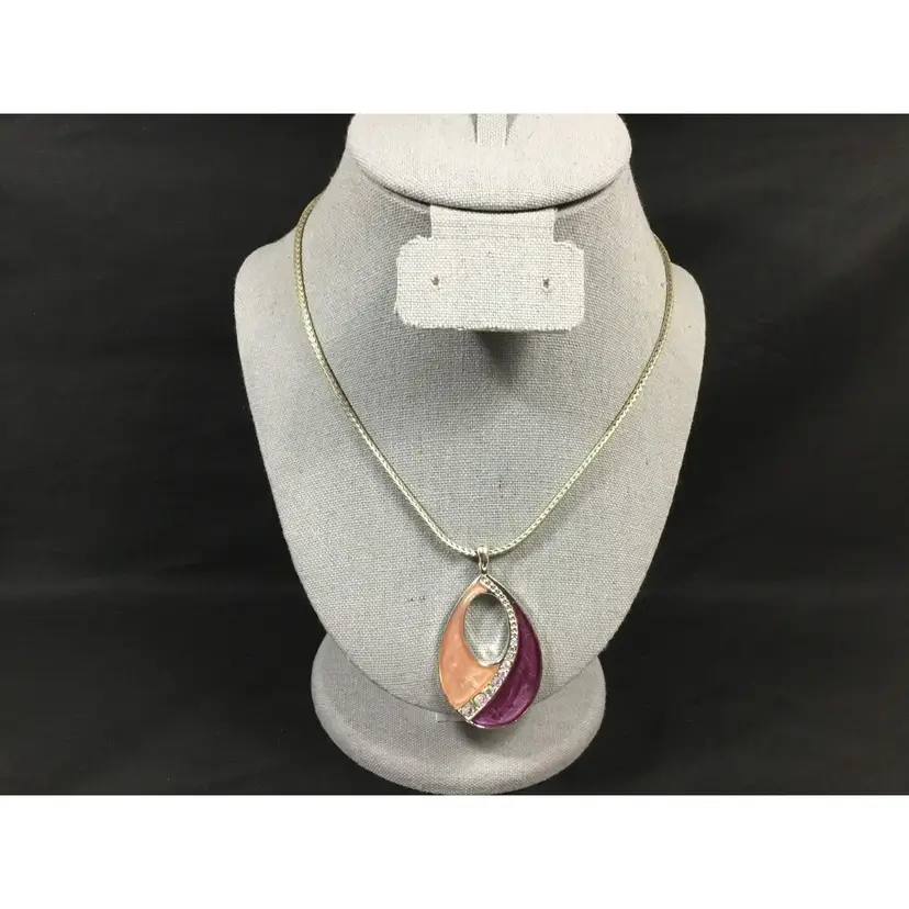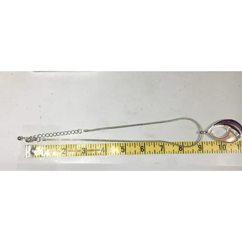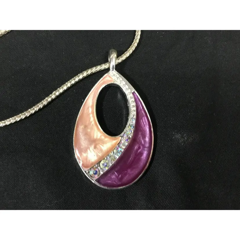 15" silver tone fox chain, with 3" silver tone extension chain, 2" oval pendant with .75" oval opening in the center. 2-tone, pearlescent enamel in pink and purple, divided by AB coated rhinestones, KC copyright on the back of the pendant. Very good condition, extender chain is a brighter silver tone than the main chain