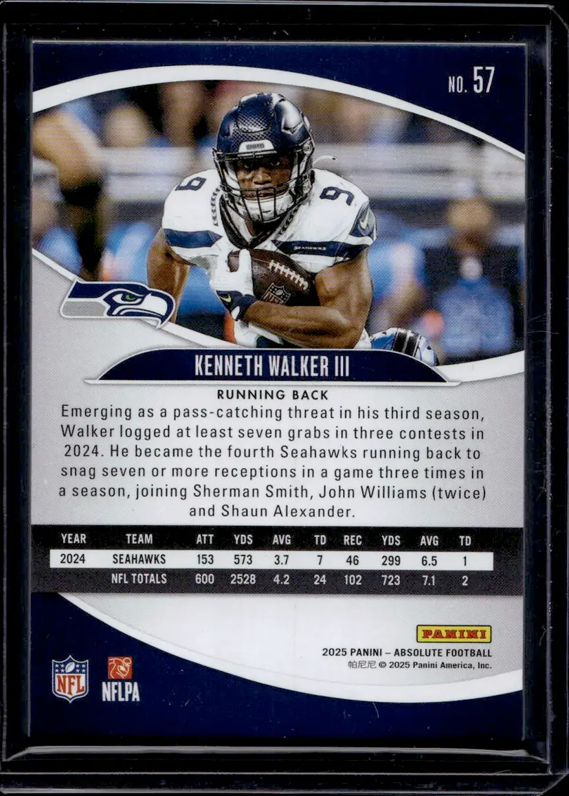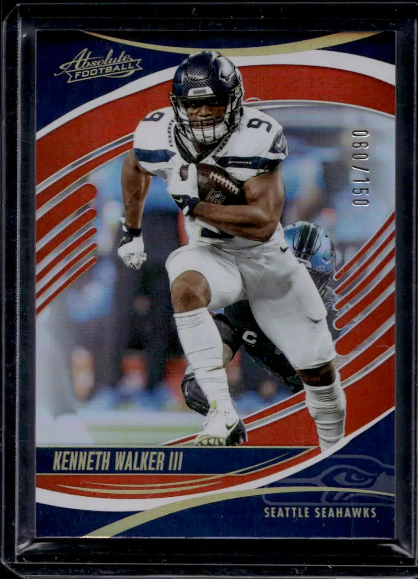 Snag this limited edition Kenneth Walker III card from the Absolute Football series. Numbered 060 out of 150, it's a must-have for Seattle Seahawks fans and collectors.