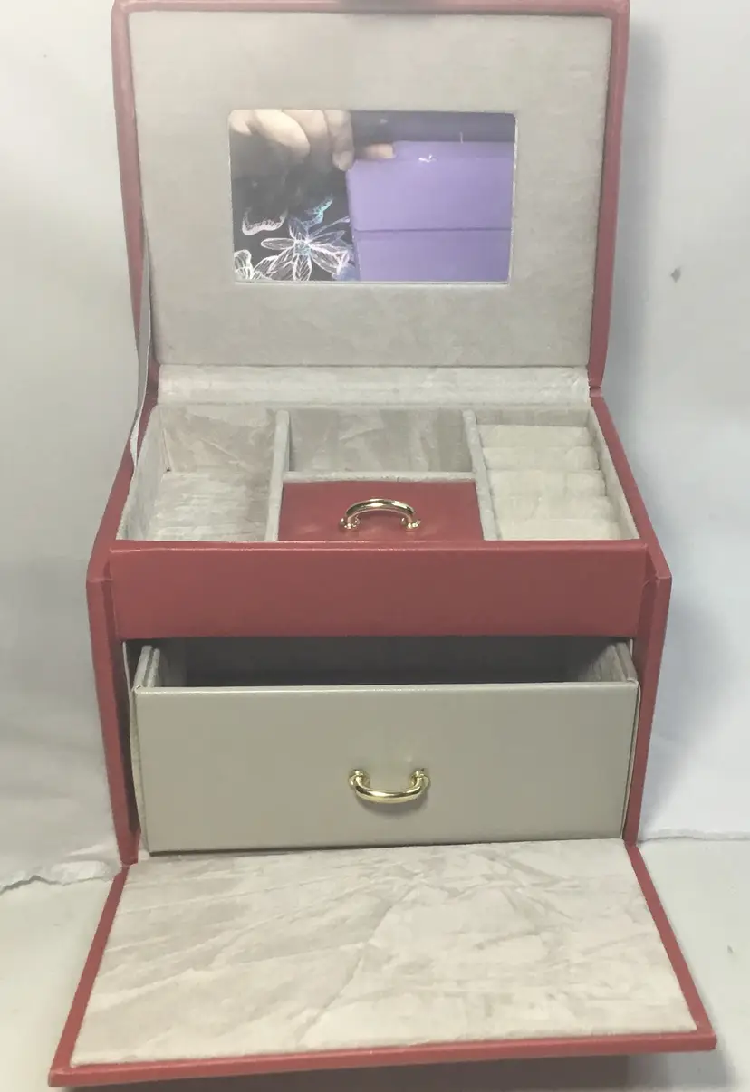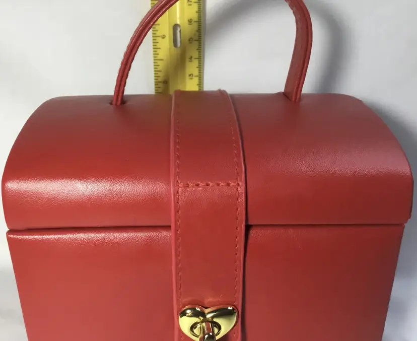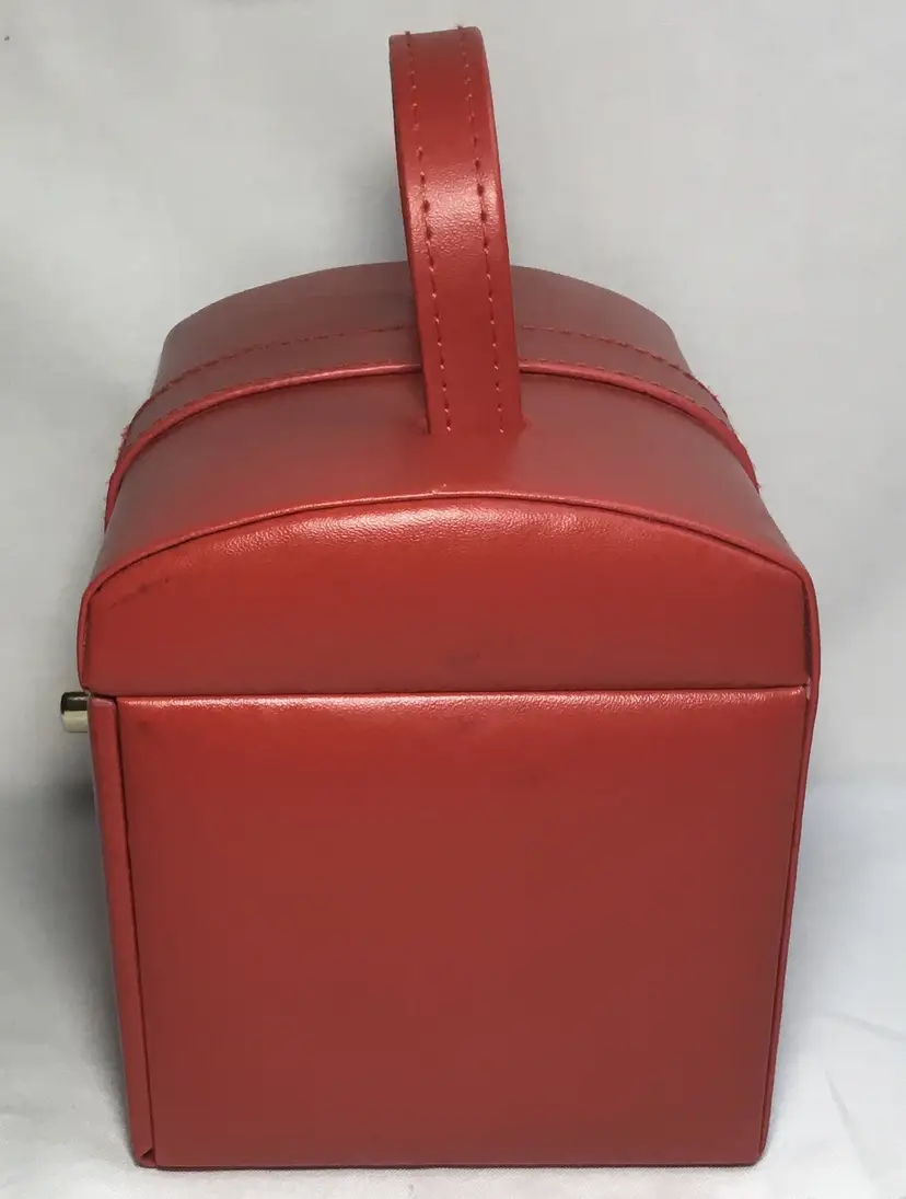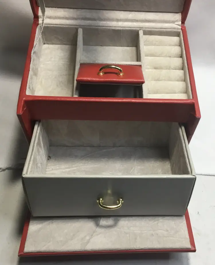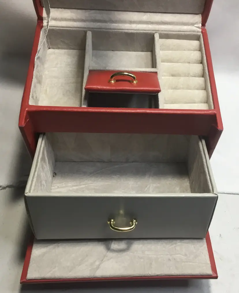 Approx. 5 inches tall by 5.75 inches wide by 4.5 inches front to back, more than 60 cubic inches of capacity. Gold tone twist latch in front, opens to top compartment with 5 ring holders, one rectangular open compartment, 2 smaller compartments, one has red, padded cover with gold tone handle. Cover fits snuggly. One large bottom drawer slides out. Small dark marks on the back.