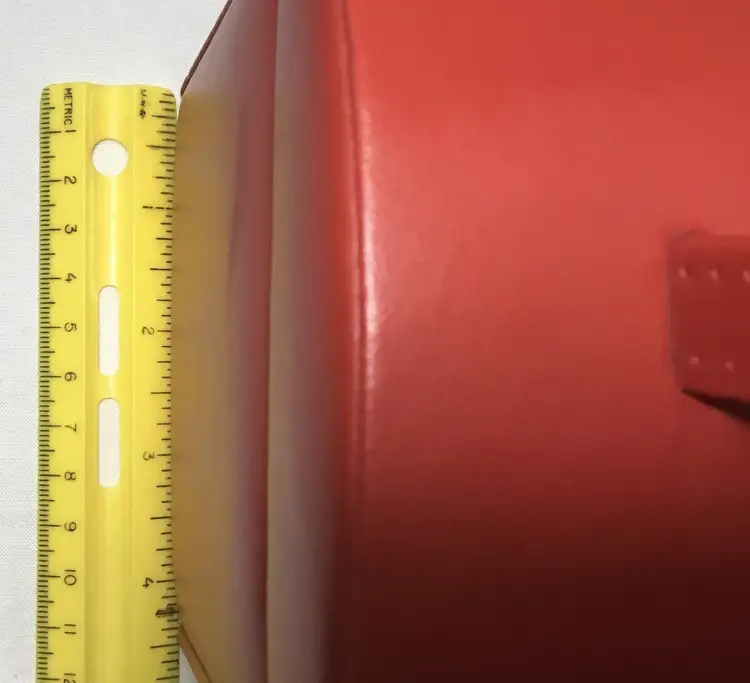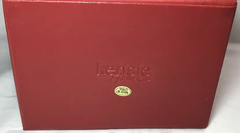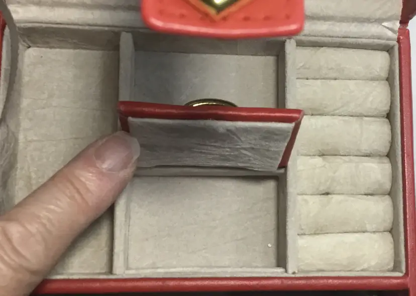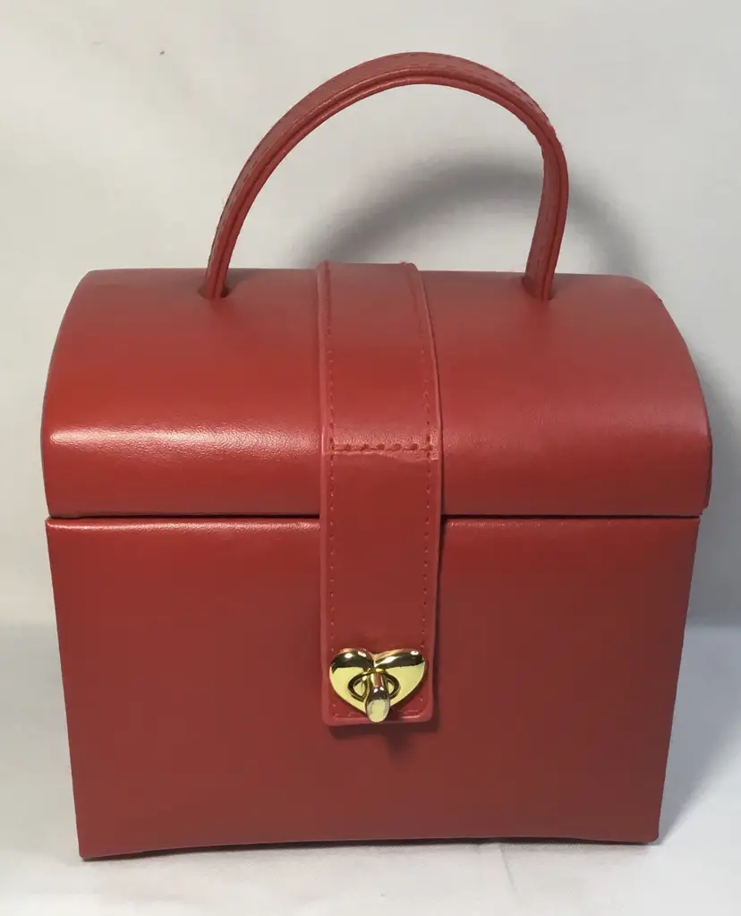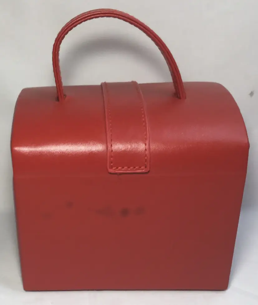 Approx. 5 inches tall by 5.75 inches wide by 4.5 inches front to back, more than 60 cubic inches of capacity. Gold tone twist latch in front, opens to top compartment with 5 ring holders, one rectangular open compartment, 2 smaller compartments, one has red, padded cover with gold tone handle. Cover fits snuggly. One large bottom drawer slides out. Small dark marks on the back.