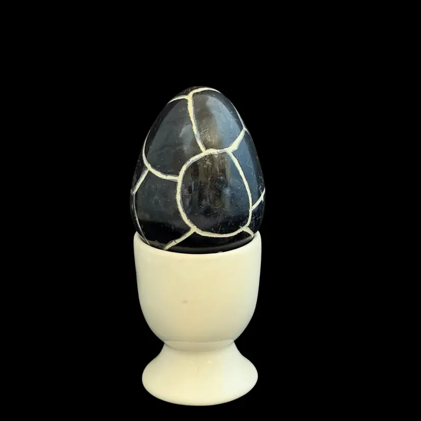 Kenya Stone Egg Hand Carved Etched Stone Tortoise Shell Design Black & White. Egg cup not included.