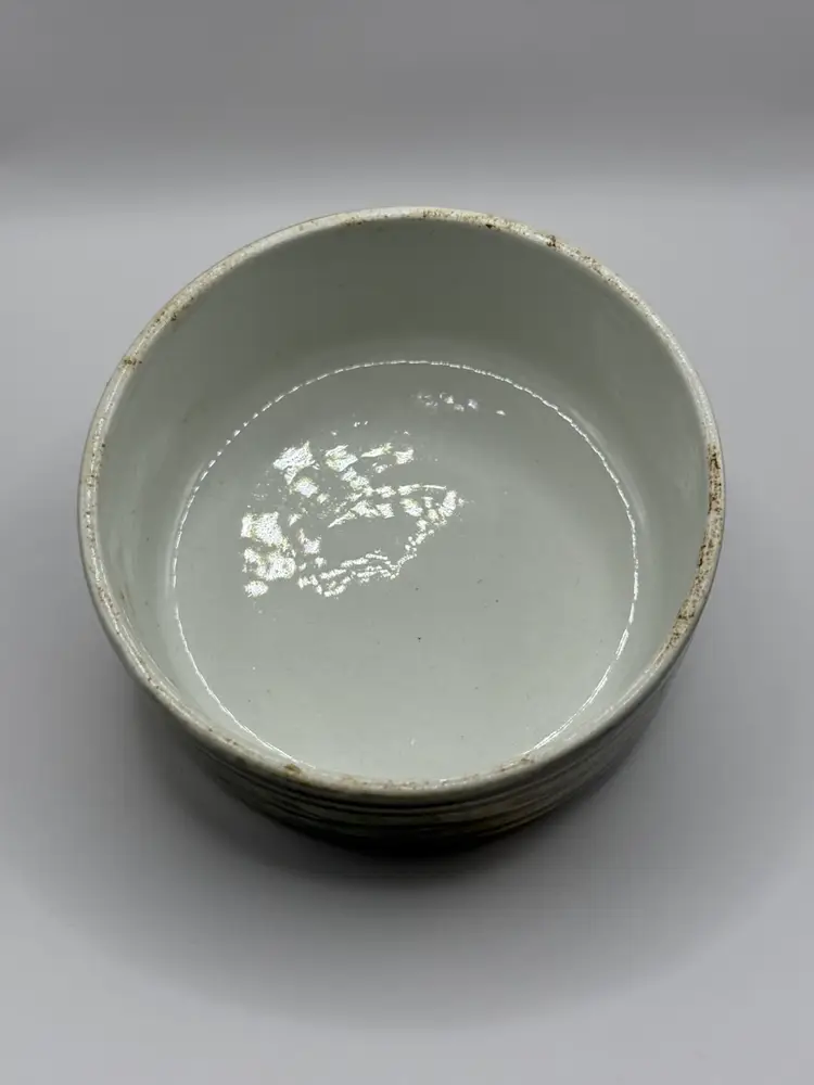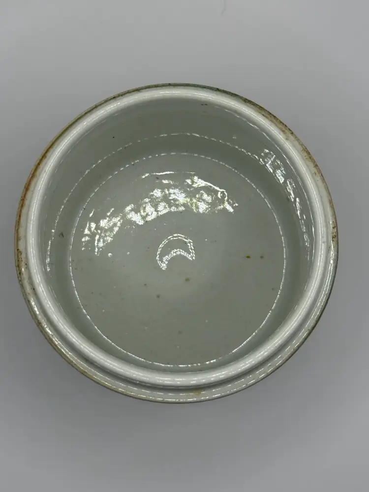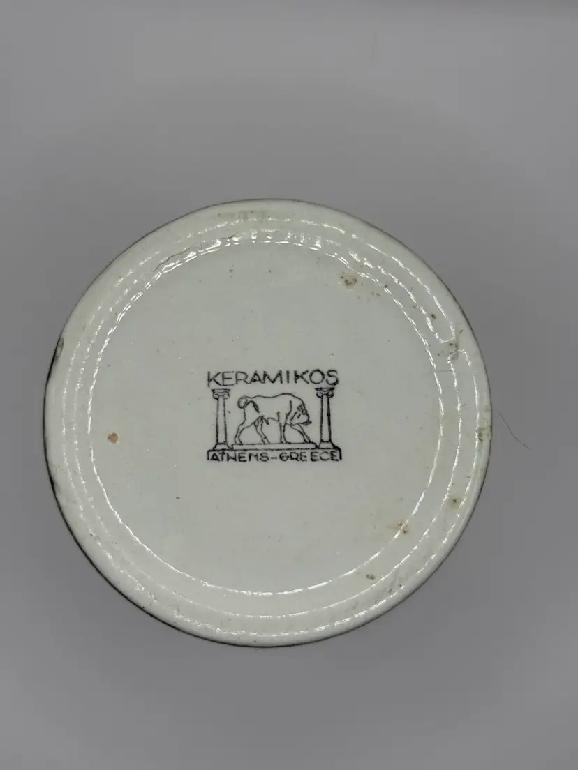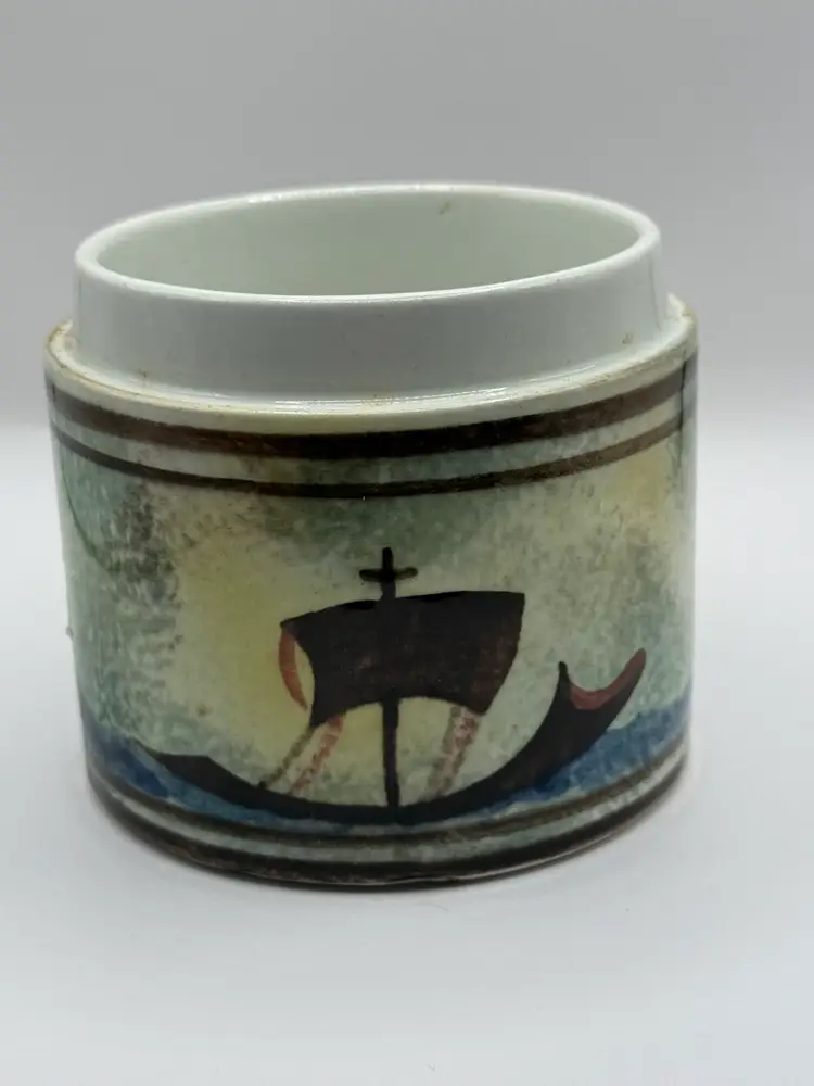 Keramikos pottery jar with lid Beautiful painting of boats on jar and vine design on lid. Unique shaped handle on lid. No cracks, chips or crazing. Approx. 4 1/2 inches including lid handle (see pic).