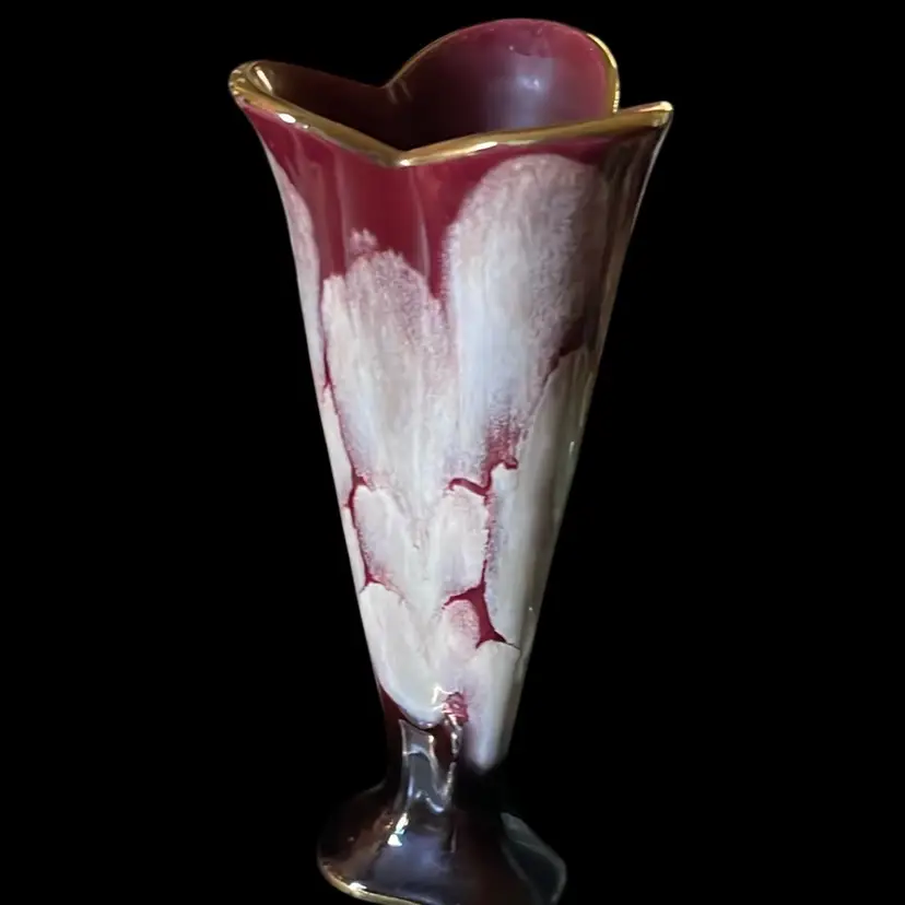 features a striking ruby-red and white fat lava or drip glaze. The vase has a flared, heart-shaped rim and a gold-toned accent along the top edge and base. The base color is a dark brown or burgundy that fades into the white and red glaze. Similar items often date from the 1940s to 1960s.