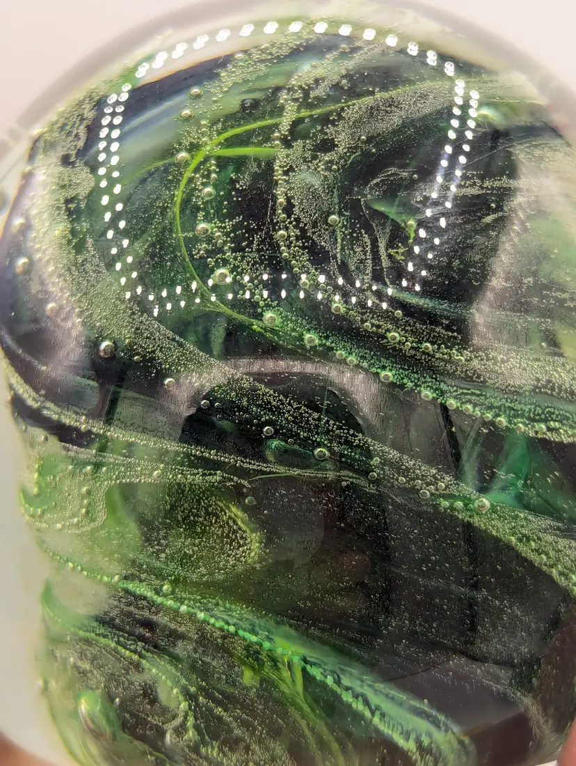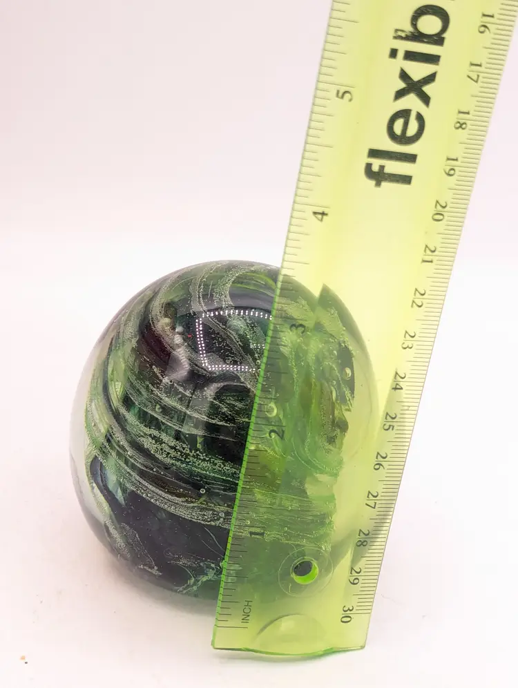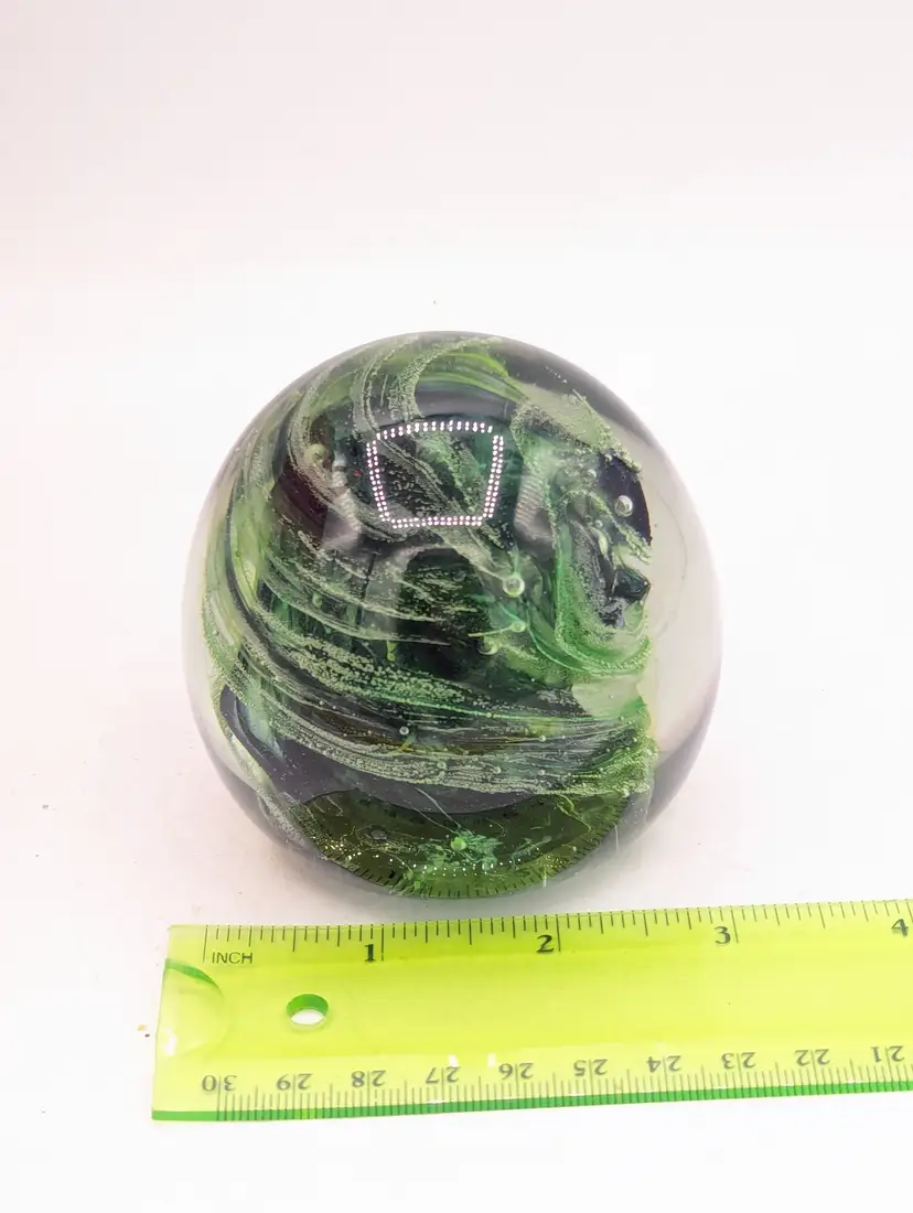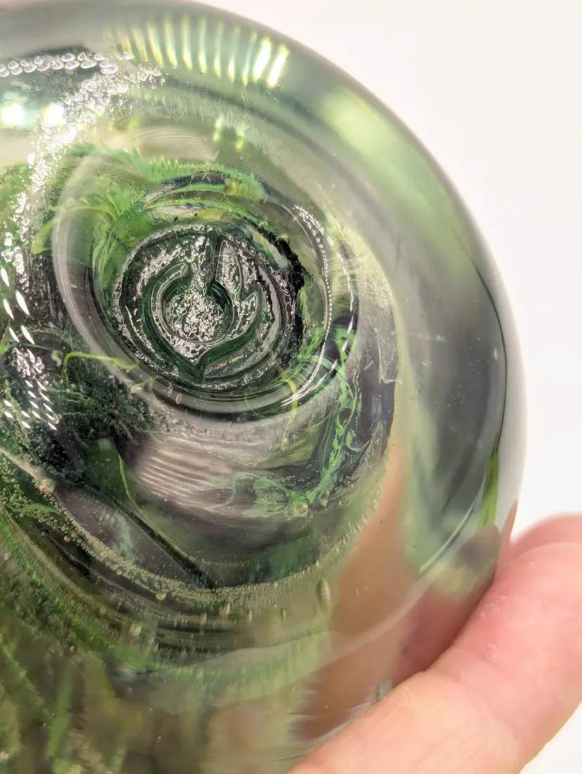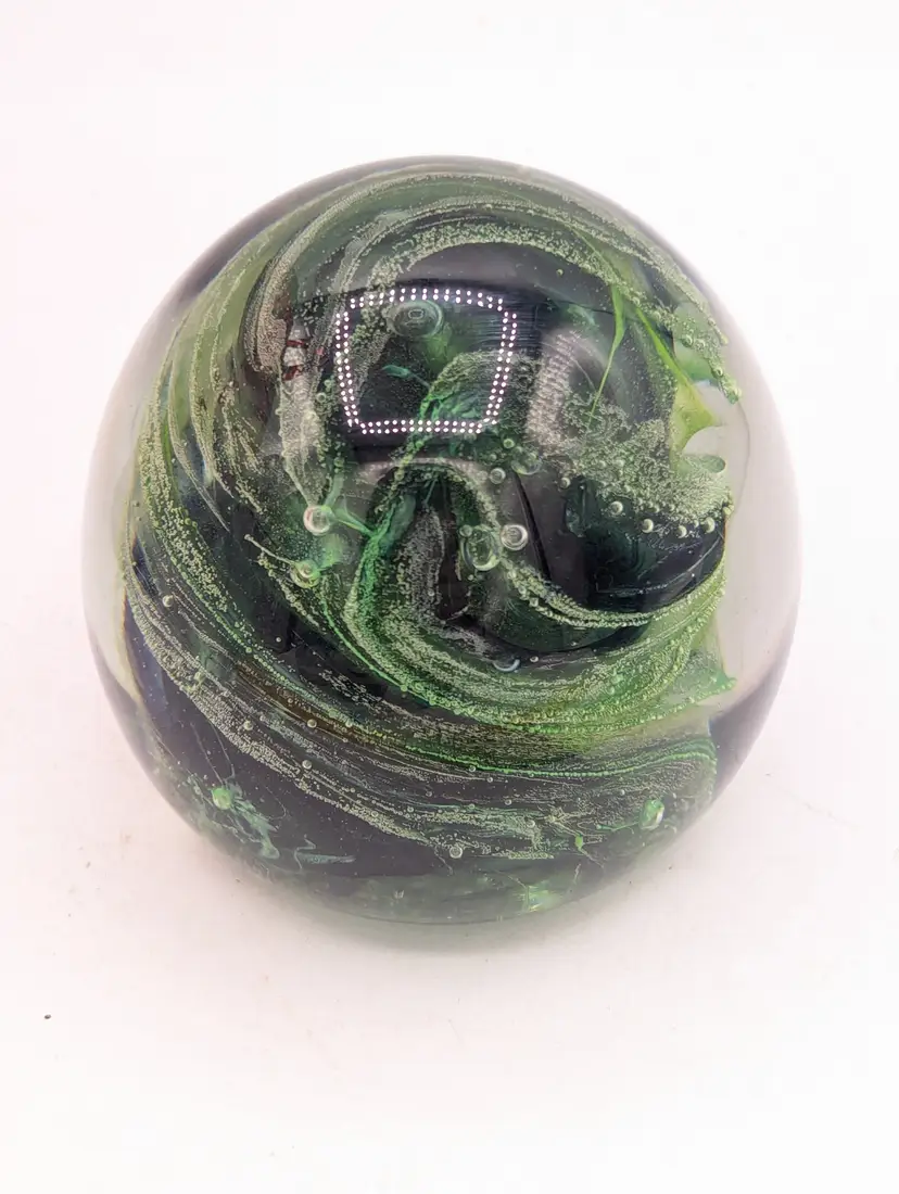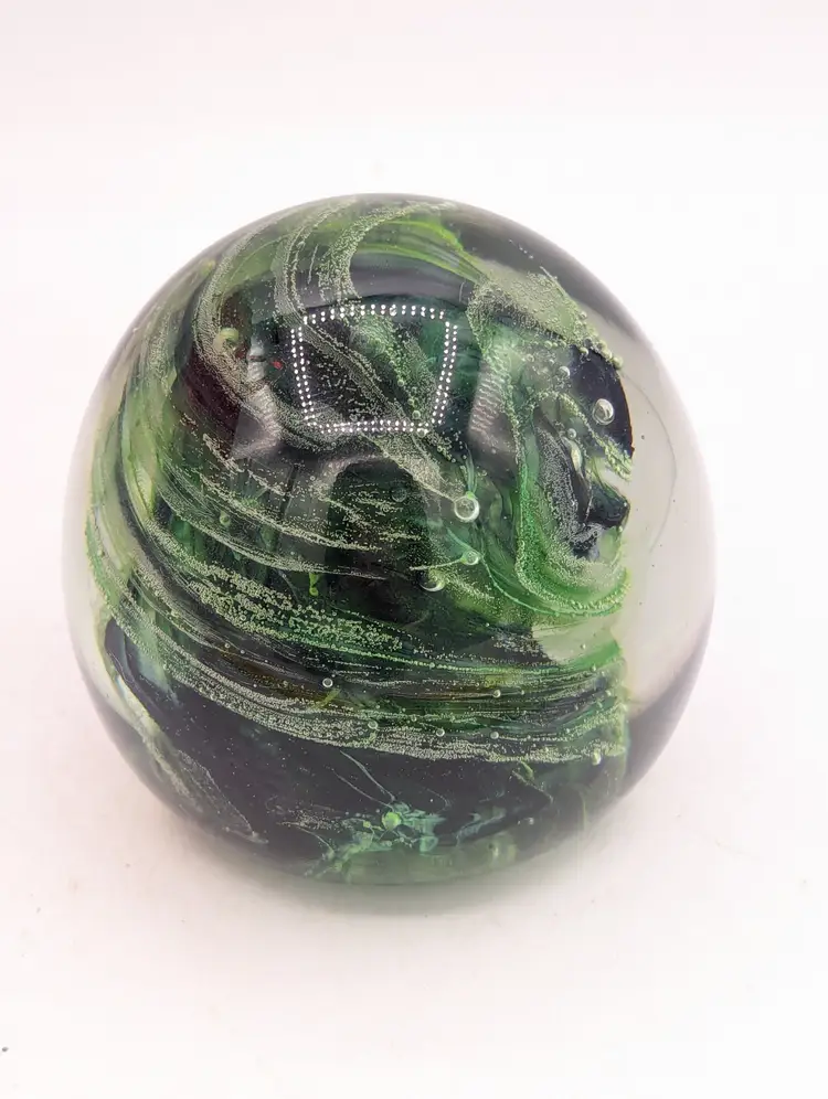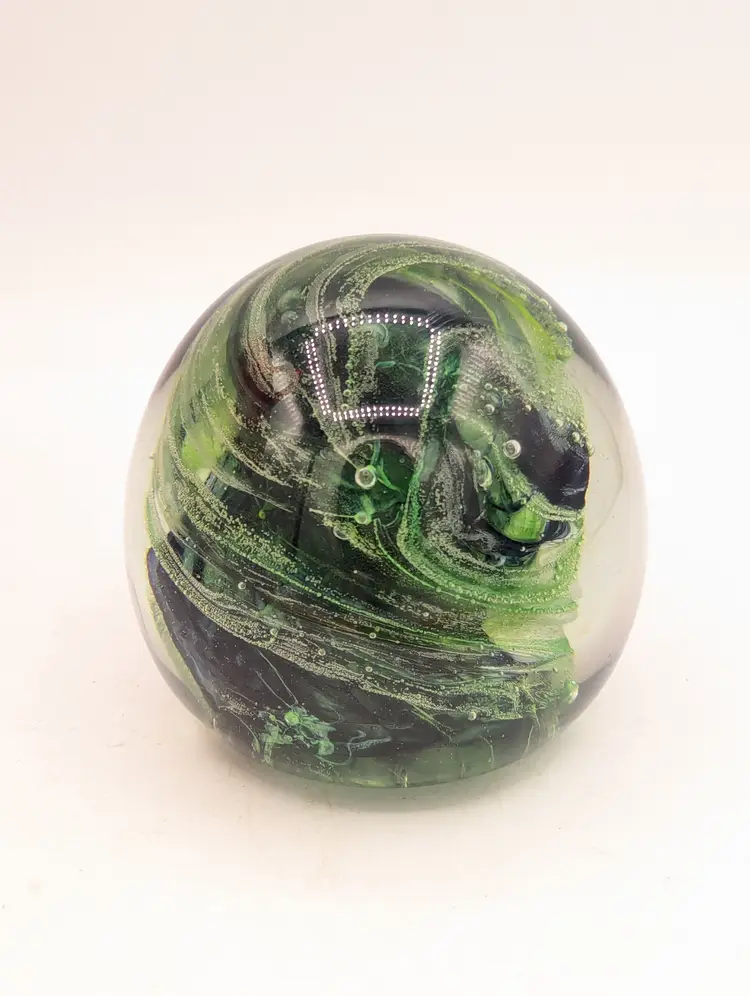 This vintage Kerry Glass Ireland paperweight features a green swirl design, made of hand-blown glass. It is considered a vintage piece. The paperweight has no chips, cracks or bruises. It is part of the Hand Blown Art Glass Paperweight product line. CH61925