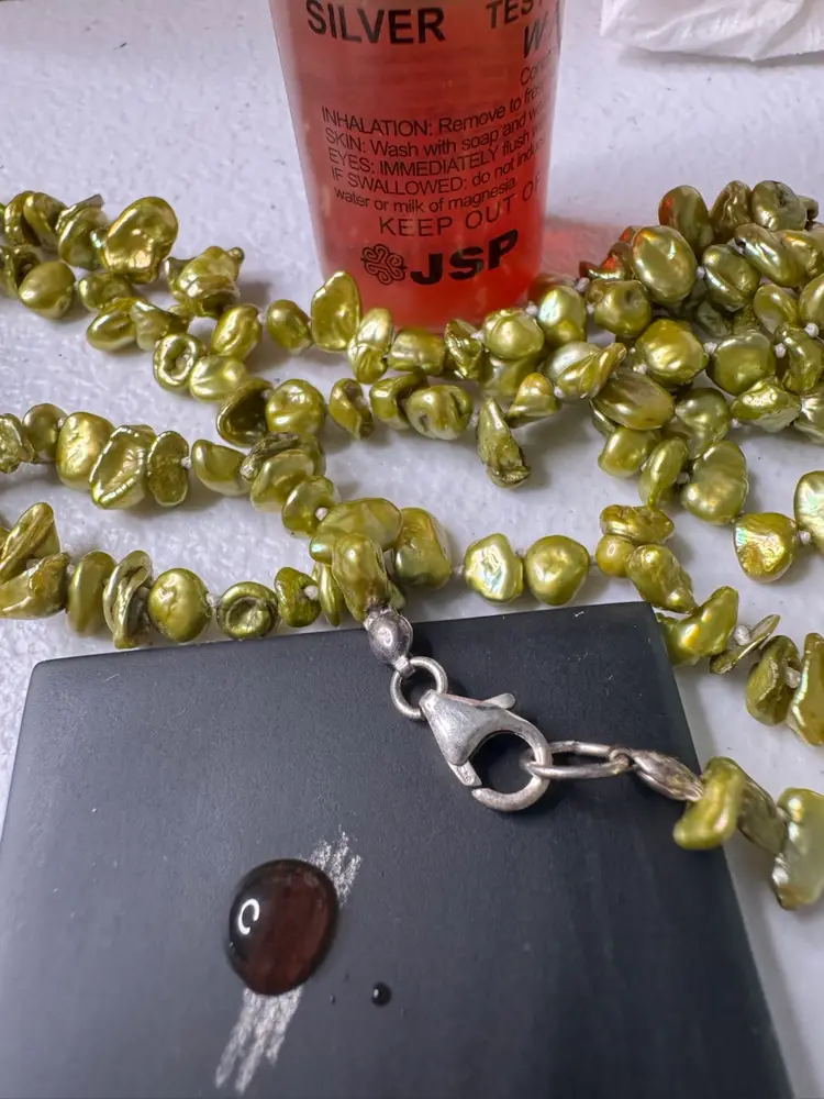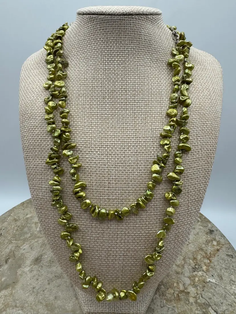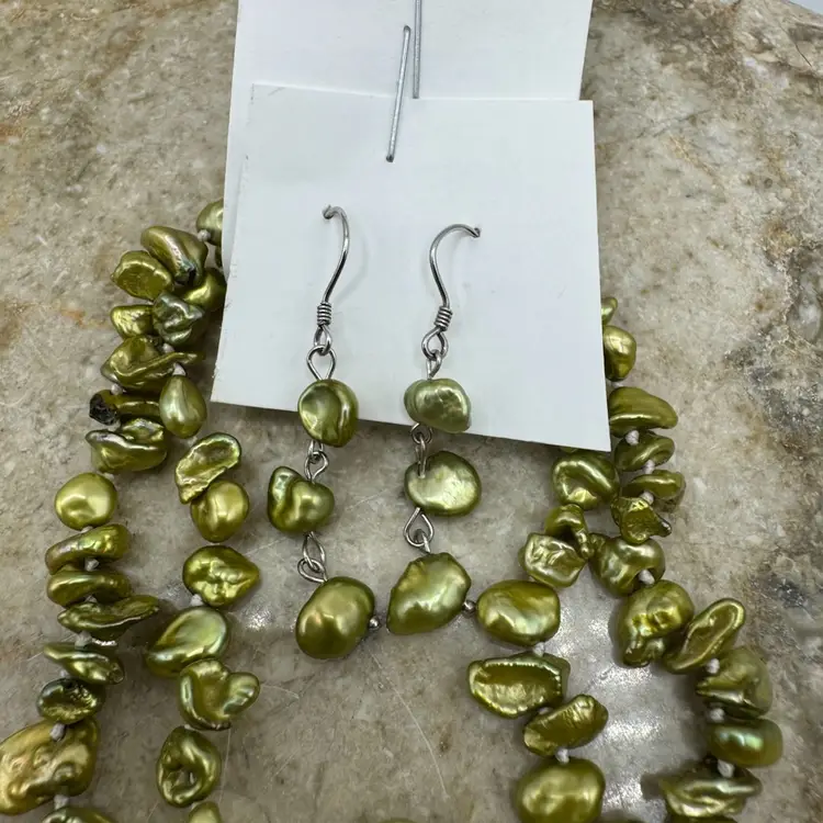 Gorgeous set, this Keshi Pistachio Pearl Necklace & Matching Earrings with 925 Sterling Silver clasp & Earrings is fantastic! Excellent condition and tested by me. Necklace measures 42” - perfect for doubling or even tripling. Earrings measure a little over 1 1/2”