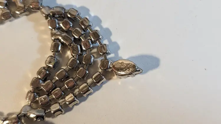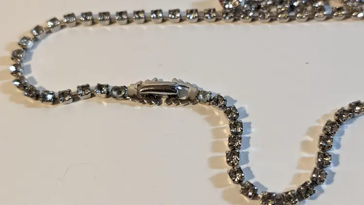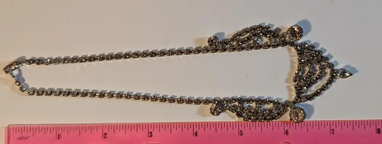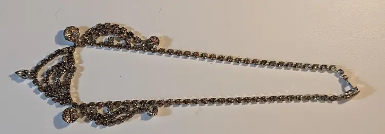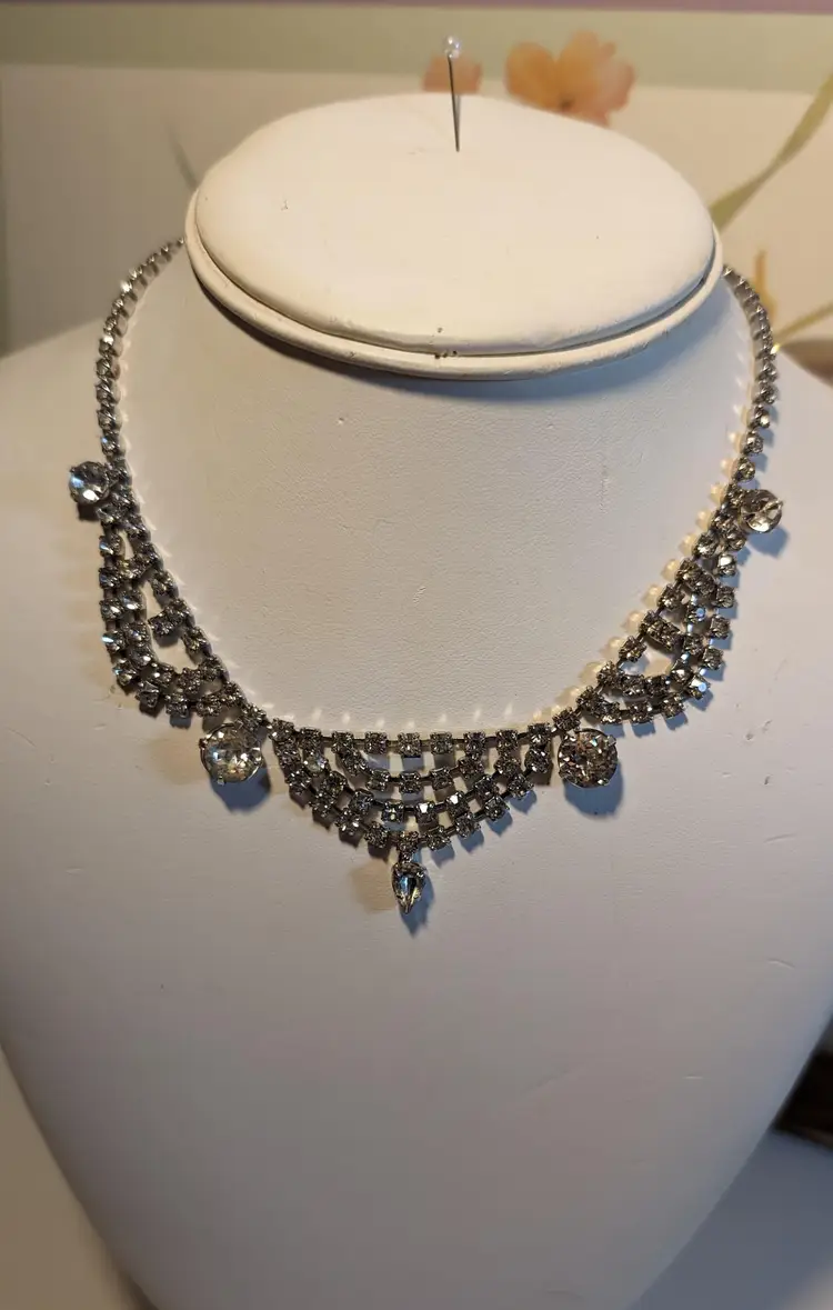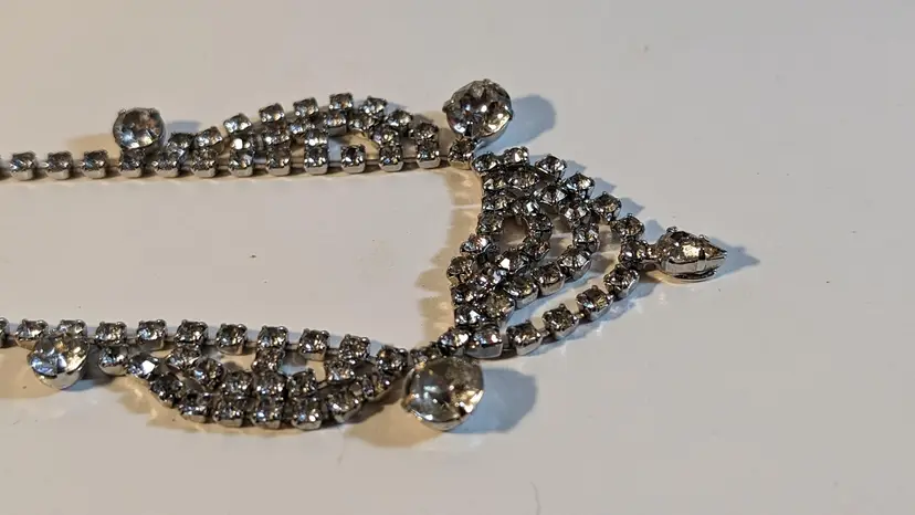 This stunning vintage bib necklace features an array of sparkling rhinestones and dangling crystals, creating a dazzling effect. Perfect for adding a touch of glamour to any outfit, whether it's for a special occasion or a night out. The intricate design and high-quality craftsmanship make this piece a timeless addition to your jewelry collection.