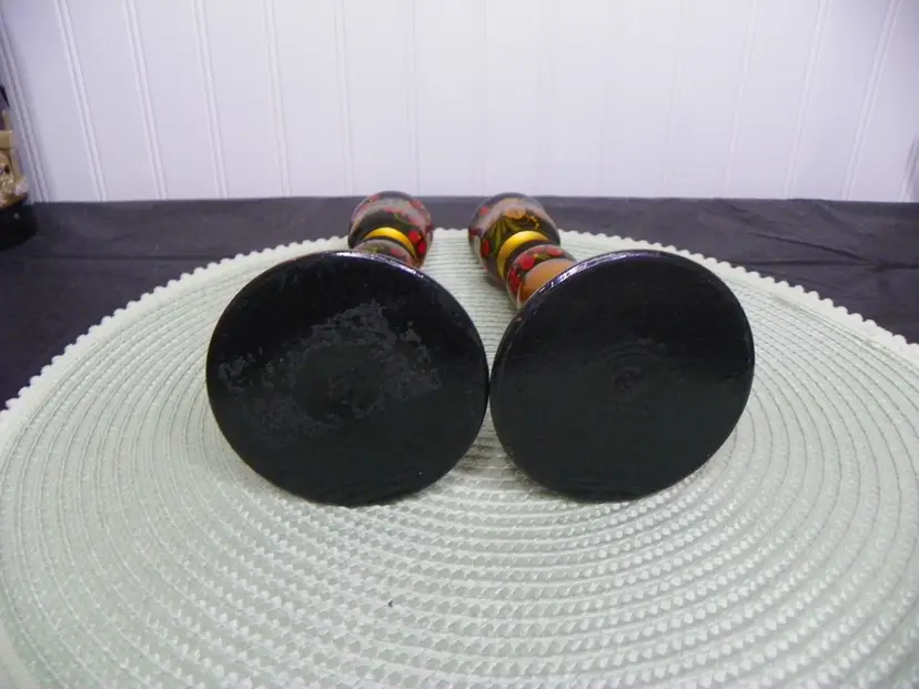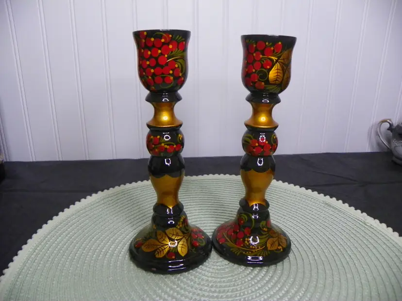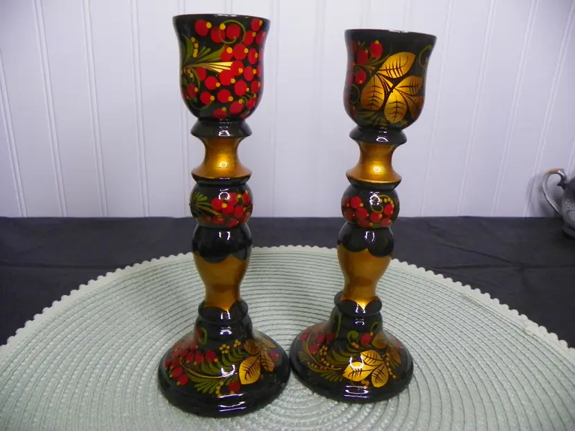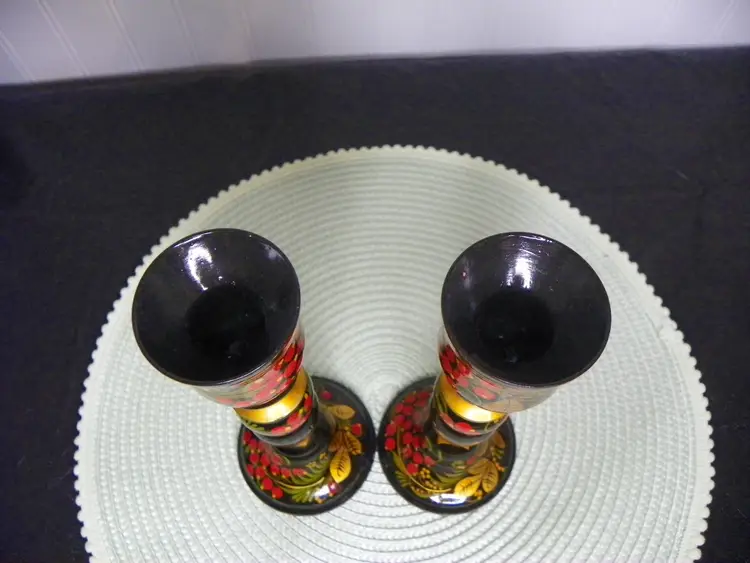 This perfect pair of wooden candle holders feature red and gold flowers, berries, and leaves on a black background.