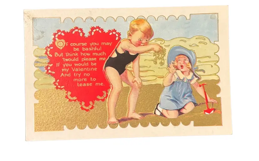 This listing is for one vintage postcard likely produced between 1938 and 1940 based on the original Martha Washington 1.5 cent stamp on the back. The front depicts a cute image of two children playfully bantering on the beach. The colors are vibrant and shimmery. It is an embossed postcard. The back features original stamp and writing, but no postmark. Overall this postcard is in great vintage condition. It does have minor staining as seen in photos. Will be shipped in top loader for extra protection.