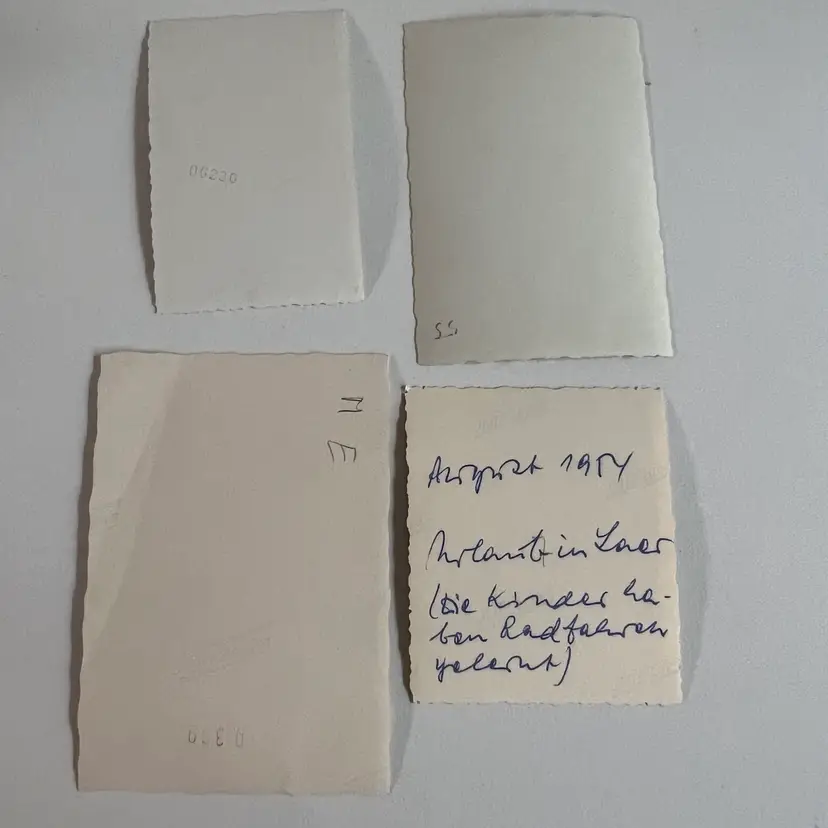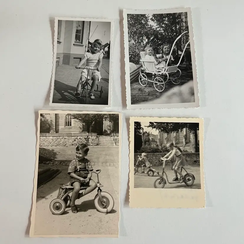 Set a four photos of children in a pram, trike and scooter. Very fun framed for a gallery wall, scrapbook, or junk journal. Largest is 4” x 2 3/4”.
