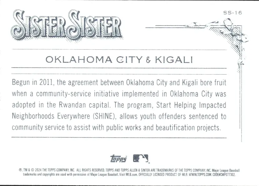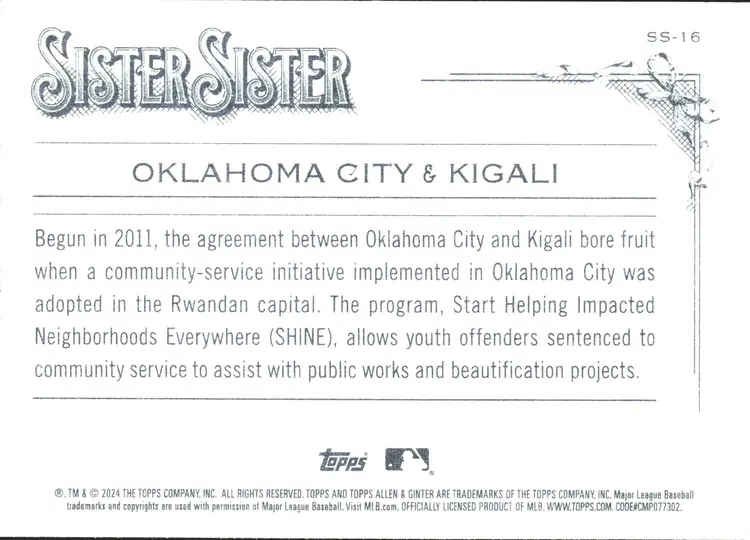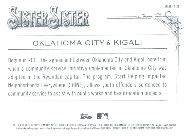 1st time buyer? Get $5 Off with code DISTRICT5 at checkout! Card as shown. All cards $20 and under ship PWE via lettertrackpro [https://www.letter-track.com/registerap.asp?AFID=8757] Sport: Baseball Set: 2024 Allen & Ginter Card Name: Kigali, Rwanda / Oklahoma City, United States Card Number: SS-16 Player/Athlete: Kigali, Rwanda / Oklahoma City, United States