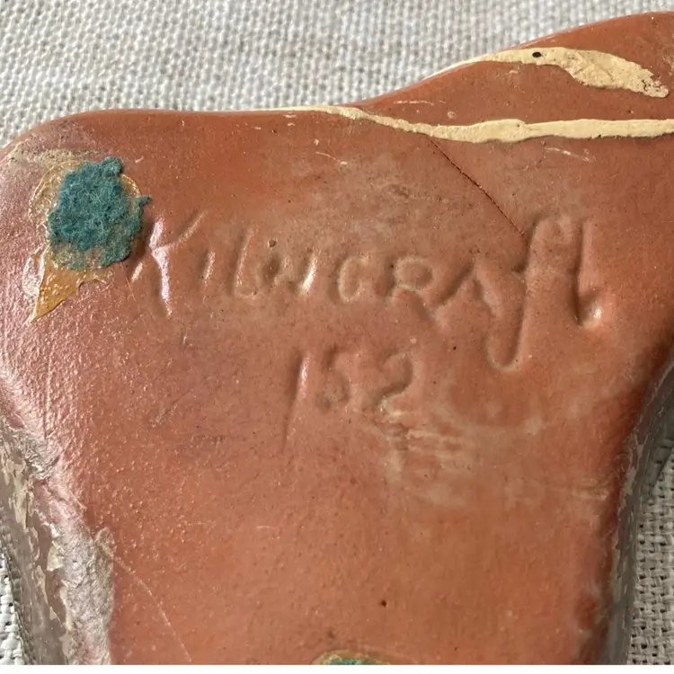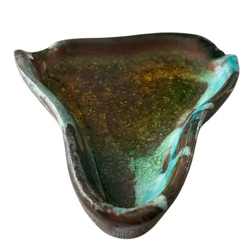 Sparkly browns and greens 1” x 4” x4” pottery trinket dish or ashtray signed Kilncraft 152