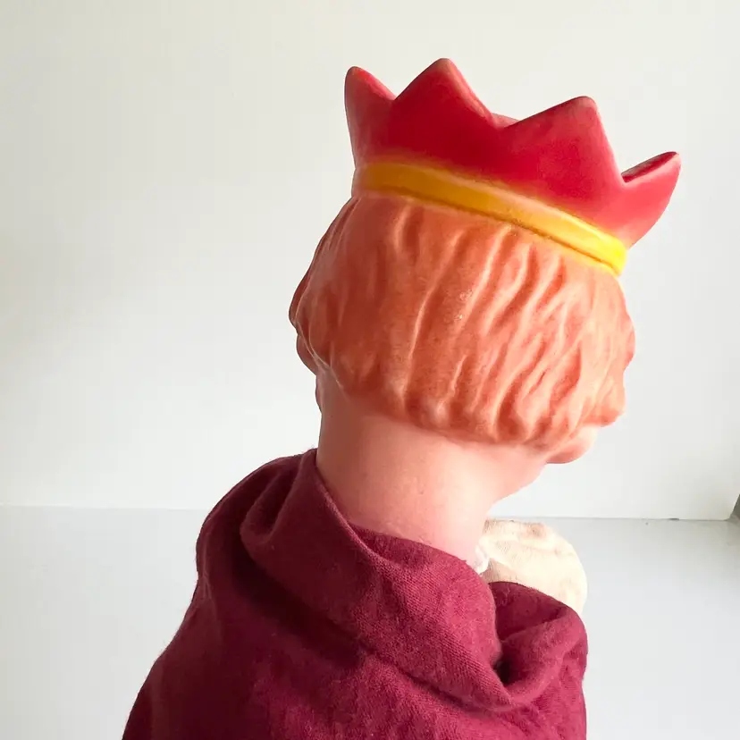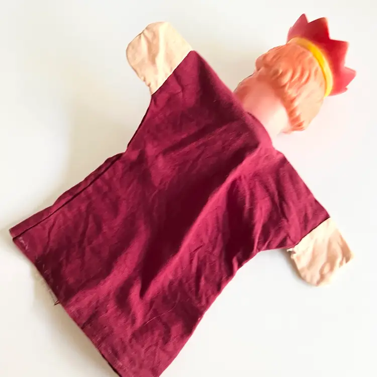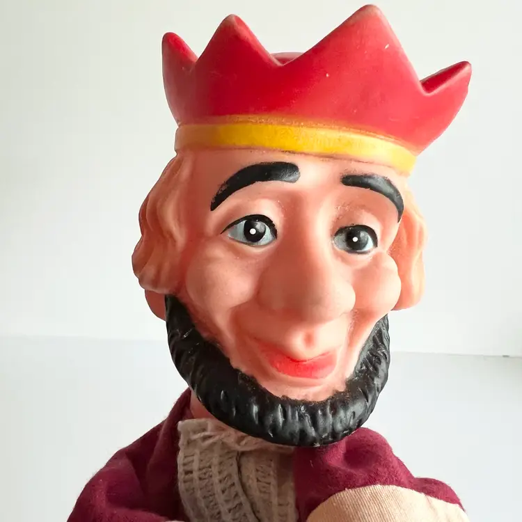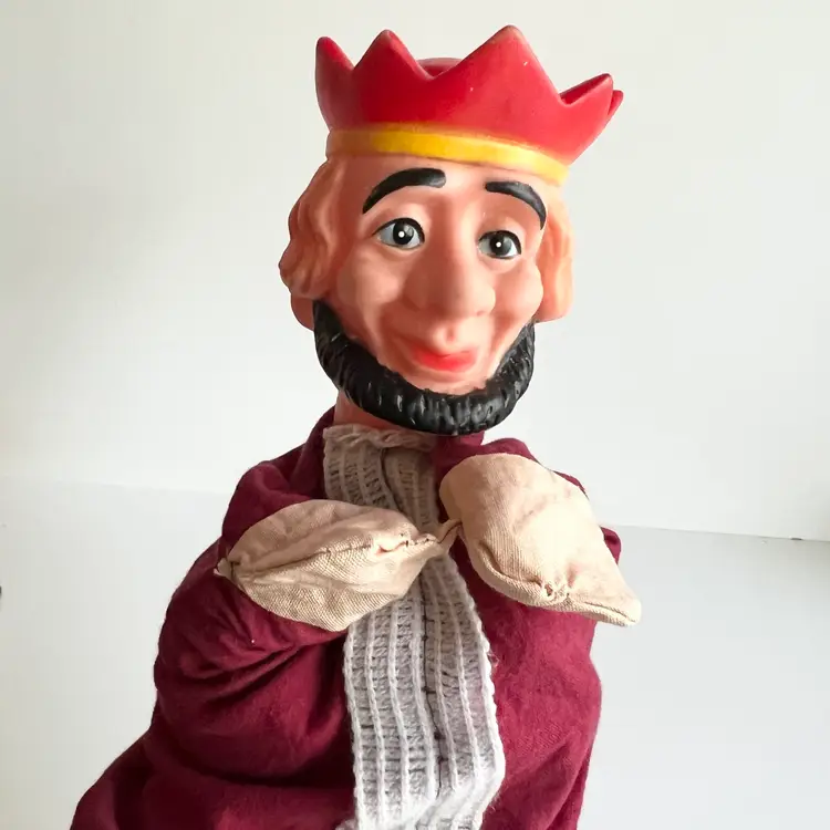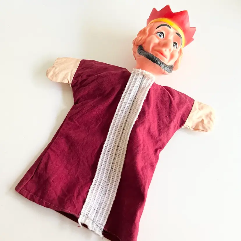 Is it just me or does this puppet remind you of Mr. Rogers neighborhood? The king to your queen. Have fun playing puppeteer with this vintage hand puppet. Great white elephant gift! 11 inches long by 8 inches wide, with his arms, stretched out. In good condition no rips or stains. Ships from Canada.
