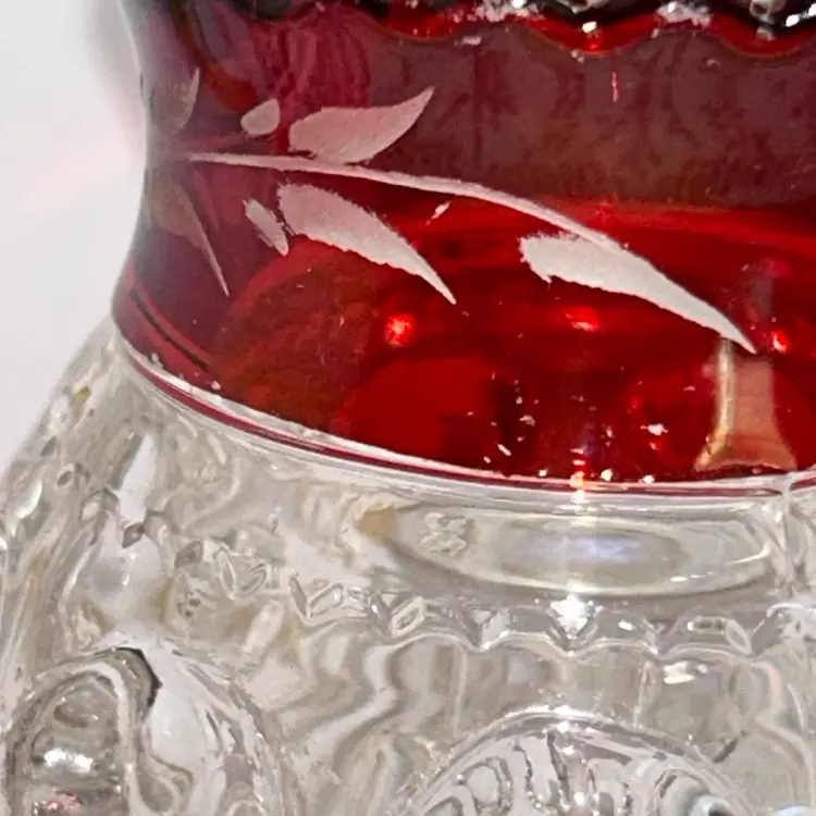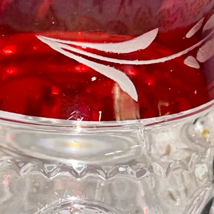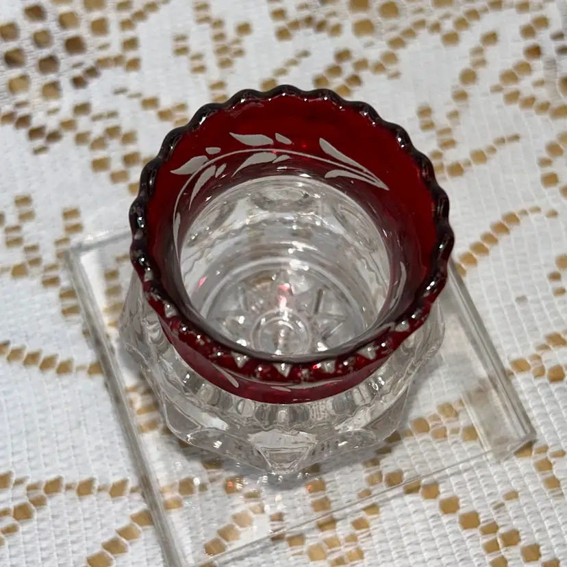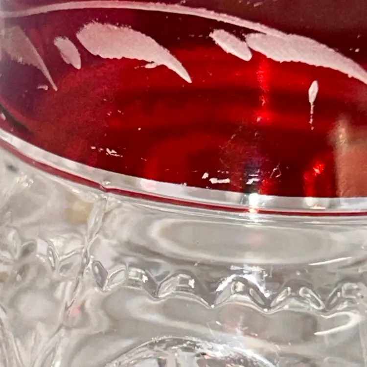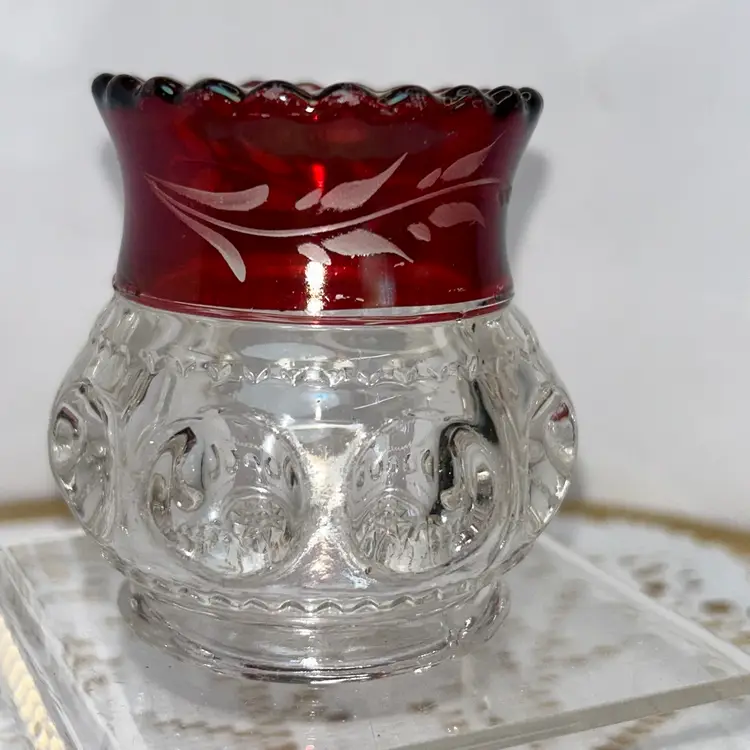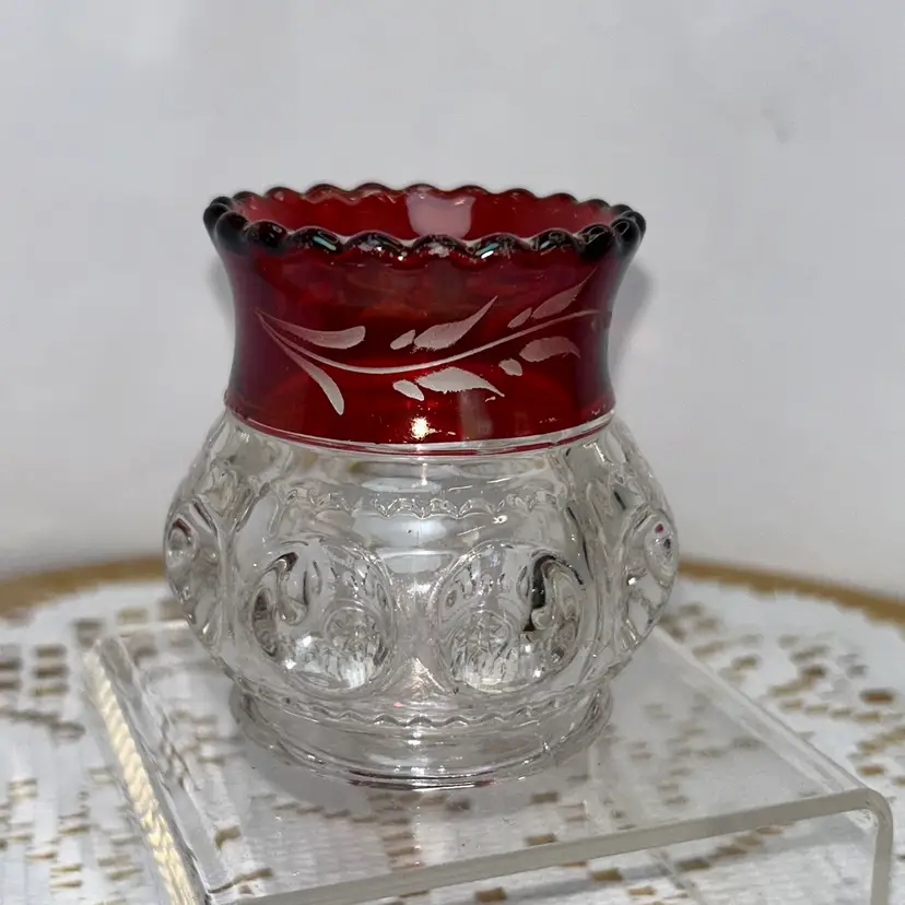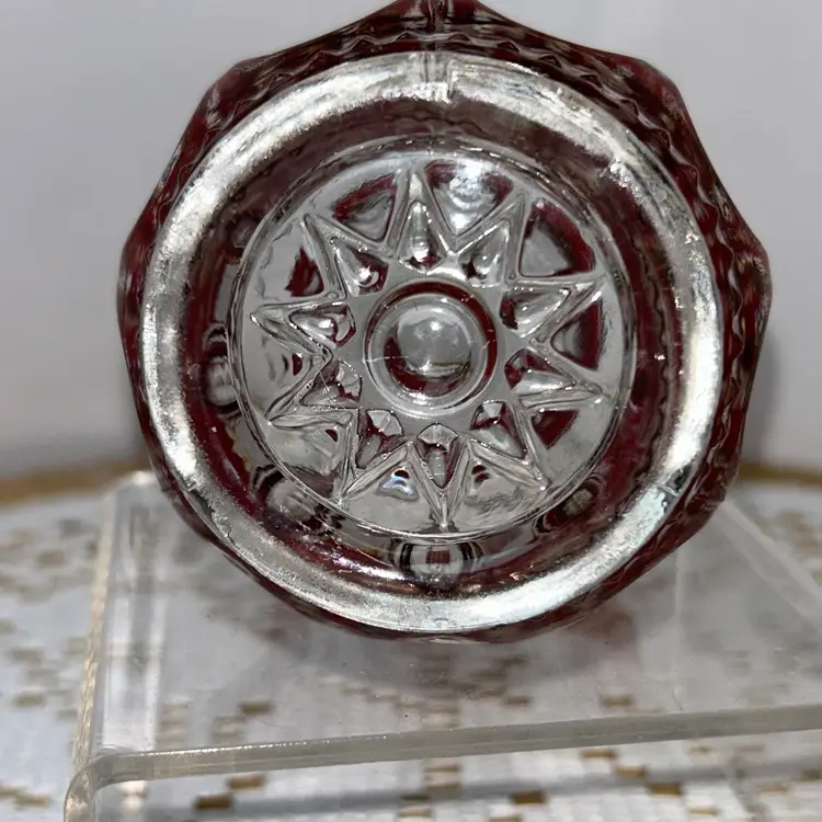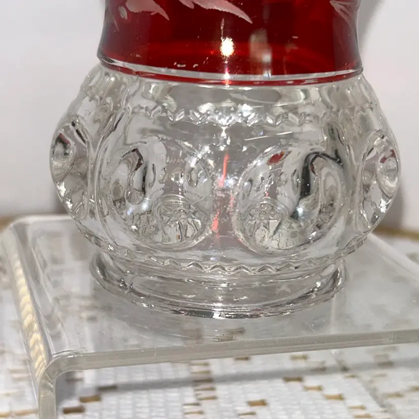 Excellent condition. Very tiny places where flash color is worn. No chips or cracks. 2.75” tall x 2” diameter across top. Circumference through the thumbprint design is 8”. Scalloped top edge, star embossed on bottom.