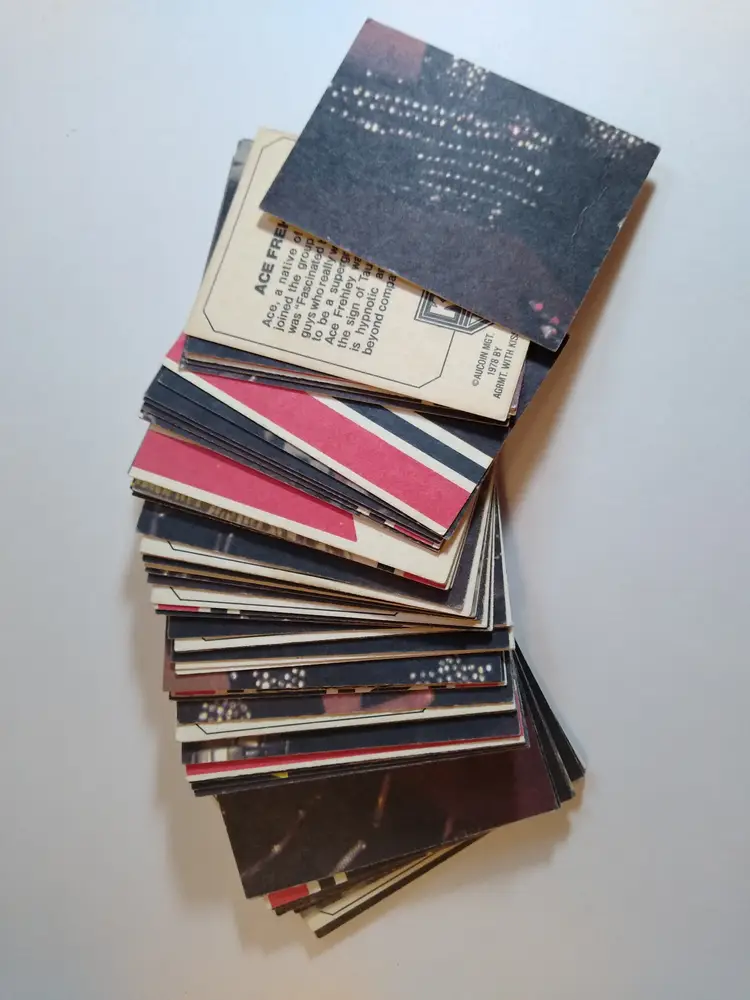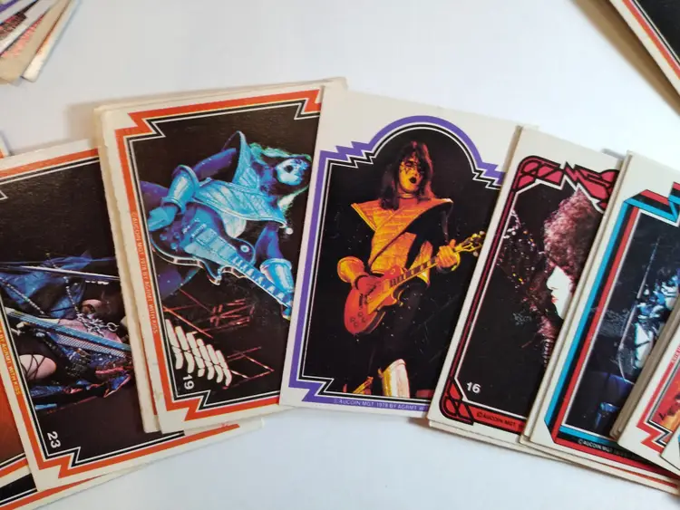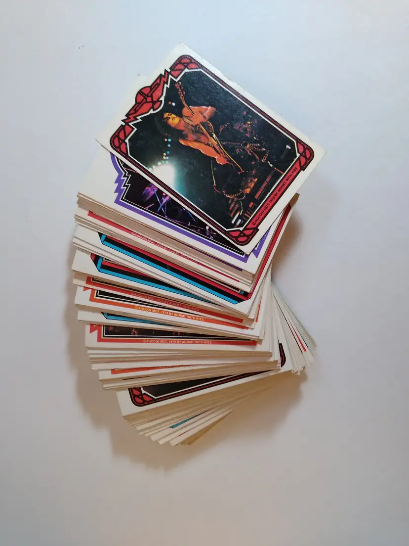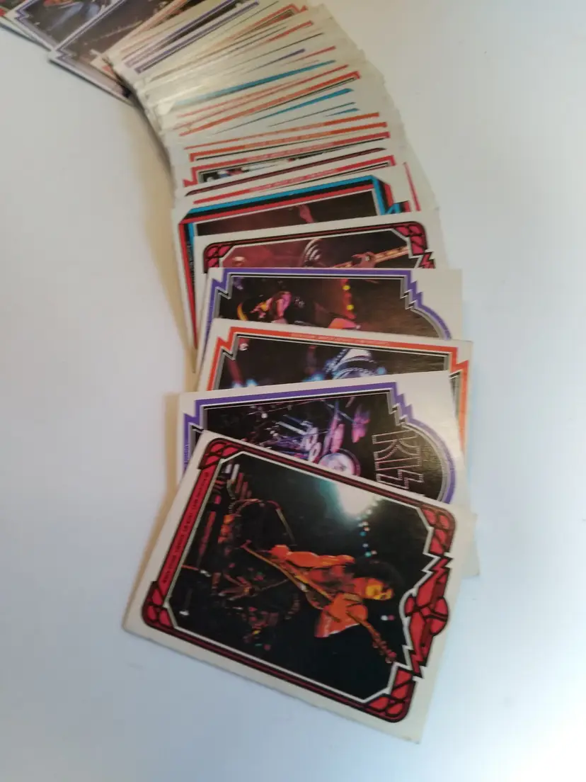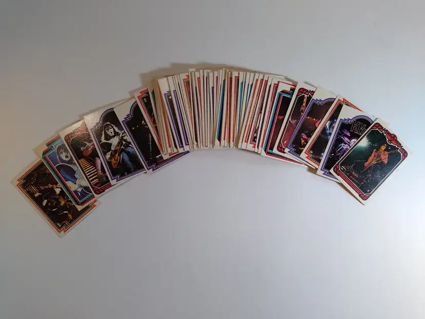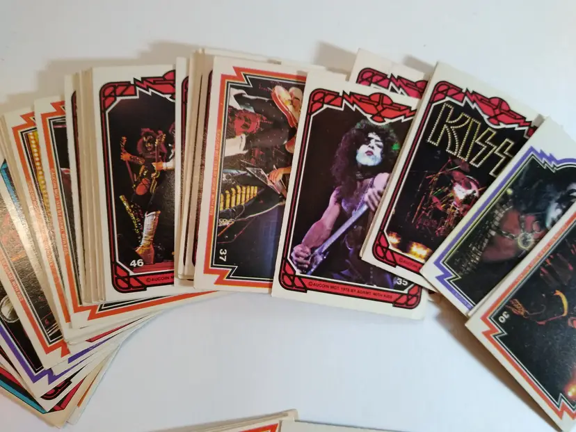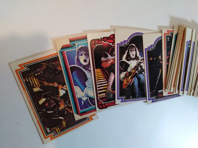 This is a complete set of 66 original Kiss 1978 Series 1 non-sport trading cards. The cards are printed on card stock and feature various images of the iconic rock band Kiss in performance and posed shots. Each card is numbered, with the set ranging from card number 1 to 66 as indicated on the cards. The front of each card displays colorful borders and photography of band members in their signature makeup and stage outfits. The back of the cards includes band member bios and additional imagery.