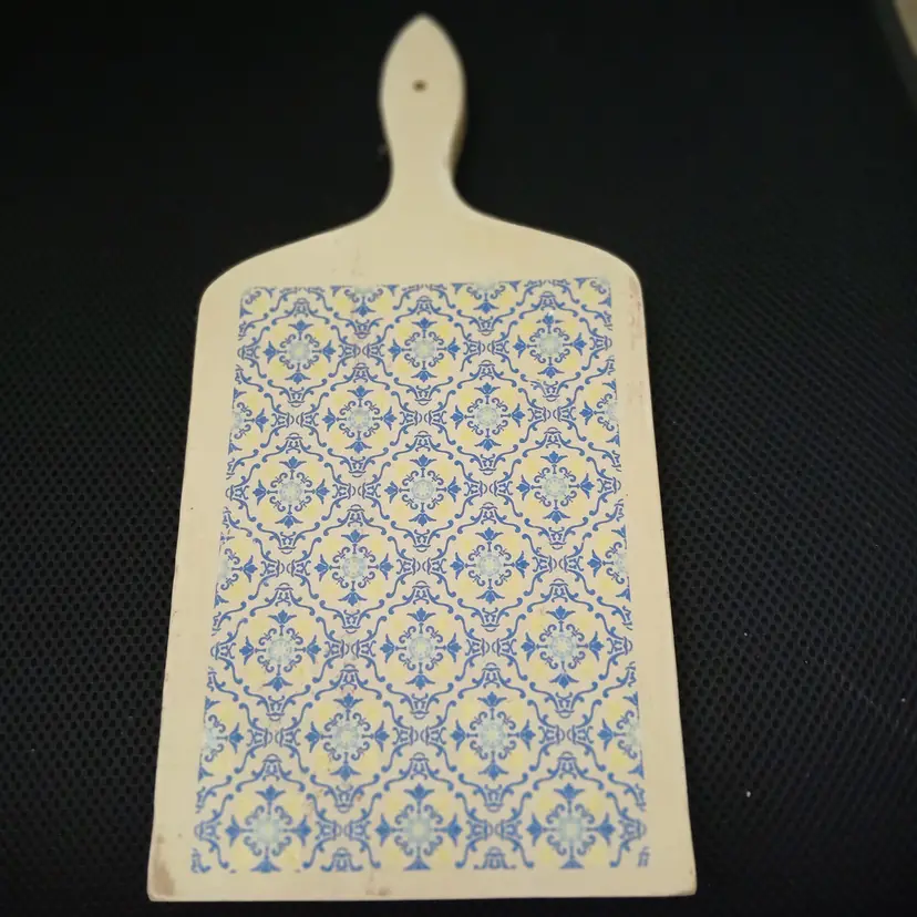 Standard size cutting board, 14" H x 7" W x 6/8" D with handle - painted in a light yellow with decor transfer on both sides, versatile styling capabilities, white was sealant. NOT for food use, not for dishwasher - clean with damp cloth if necessary - for decor purposes only.