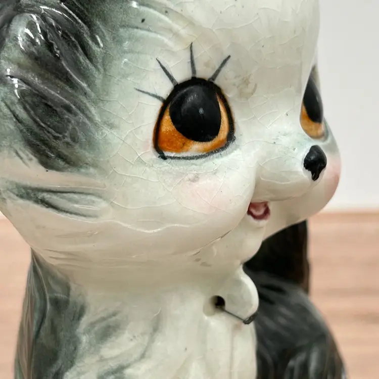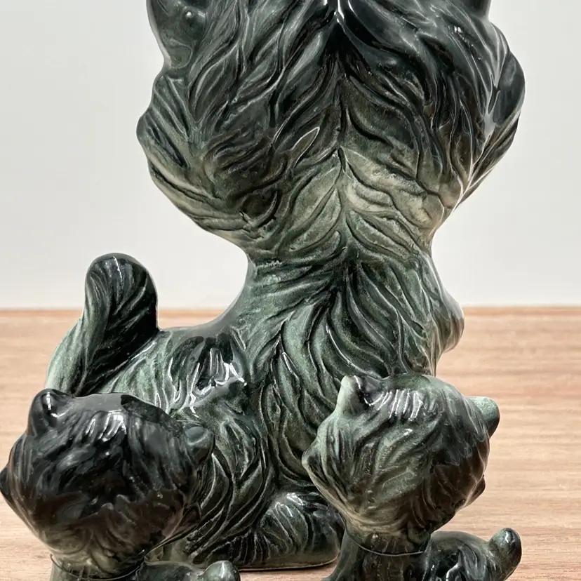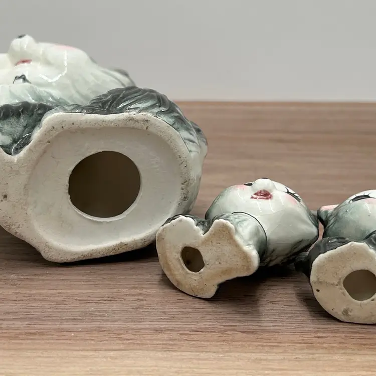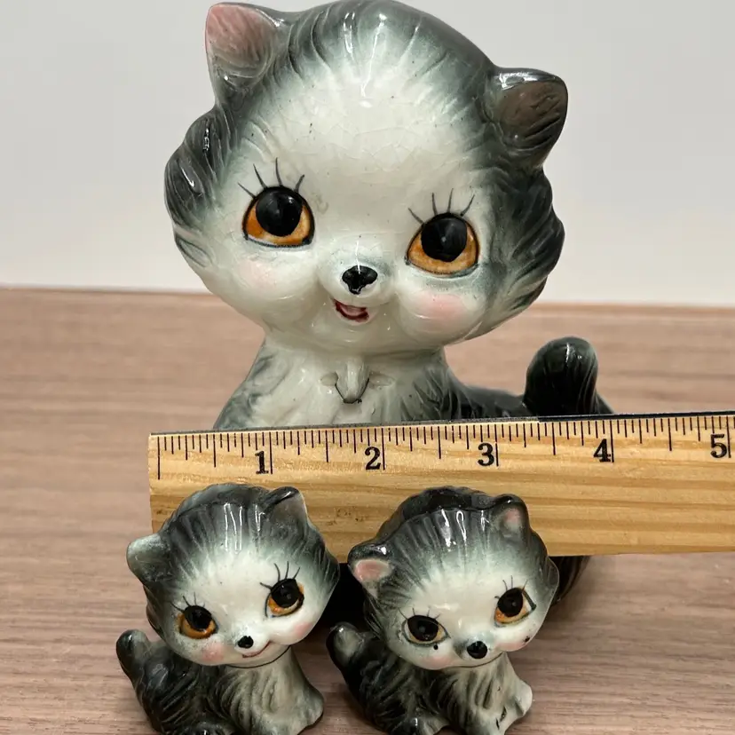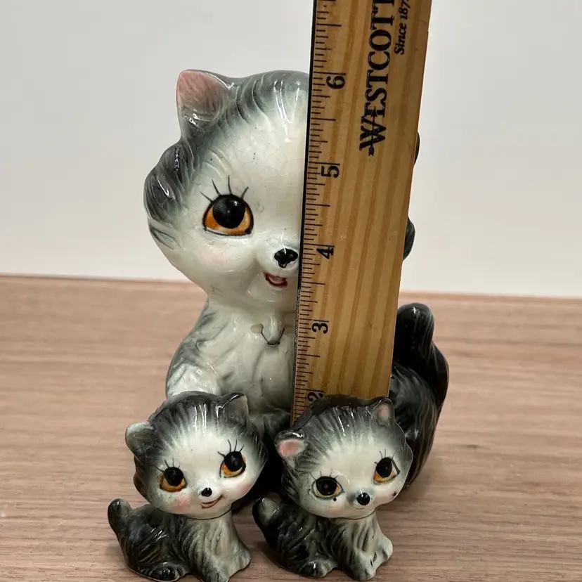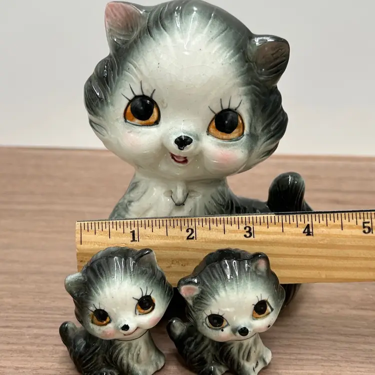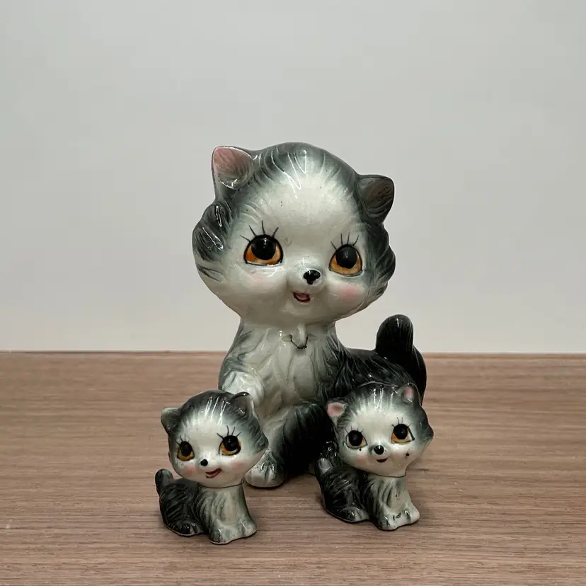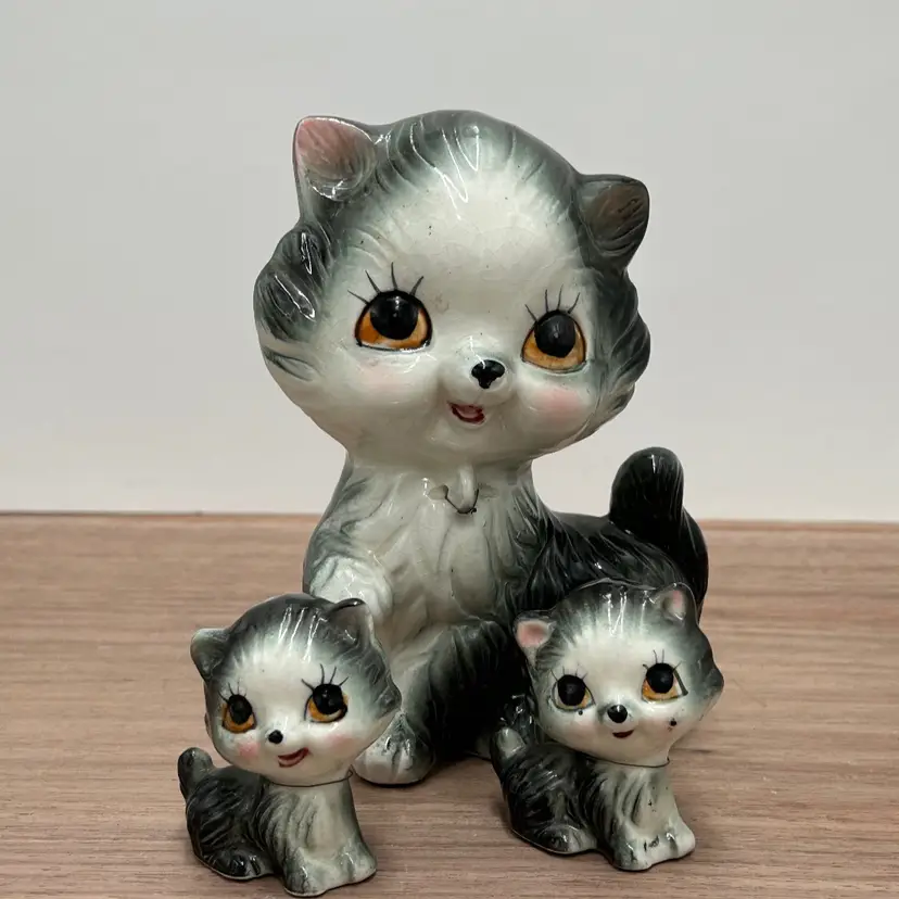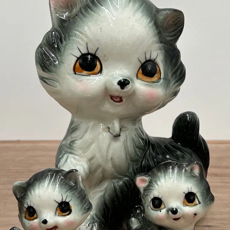 These are the sweetest family of cats we have found and I’m not sure how you will be able to resist those faces either. This is a gray ceramic cat family that at one time was chained together, but seems to have broken out of those chains. There are no markings or stickers on the pieces to say who the maker was, but they are vintage and in very good condition. There is some crazing to the glaze but there are no chips or cracks. The mom does have a small issue with her glaze near her eye and both mom and children have leftovers from their chains attached to them. Mom is about 6 inches tall and 4 inches wide. The babies are 2 inches tall and about 1 ½ inches wide.