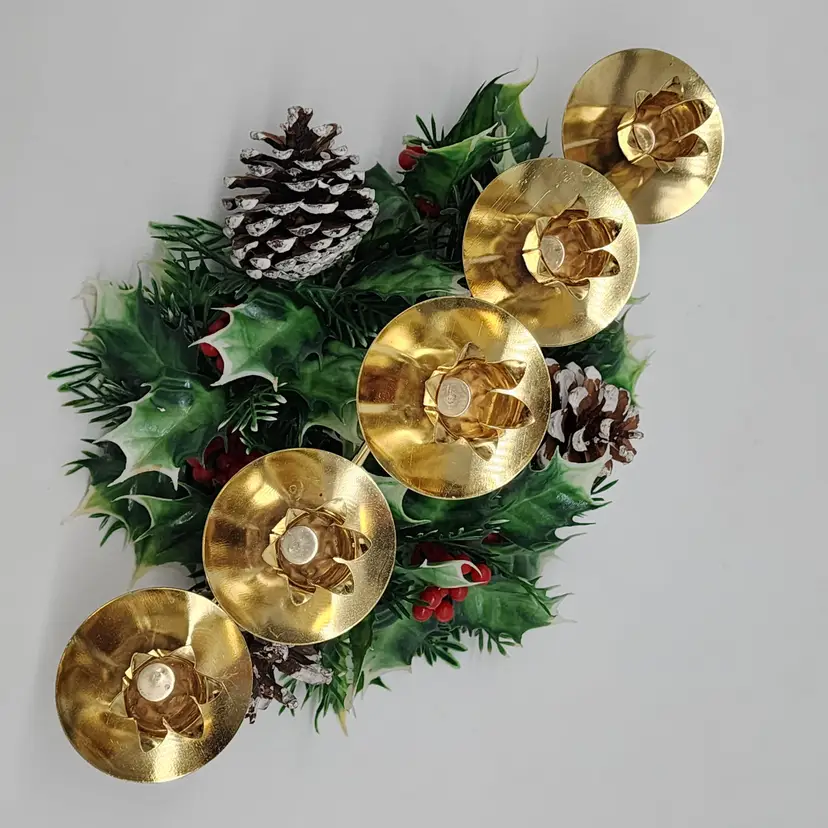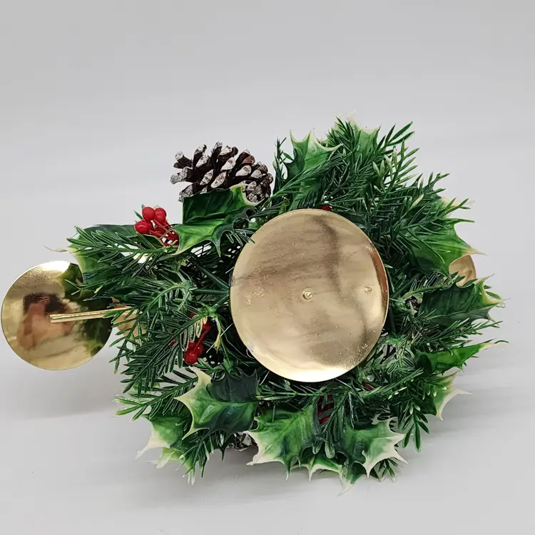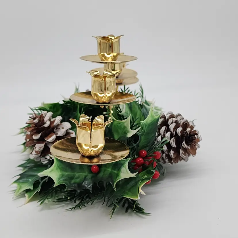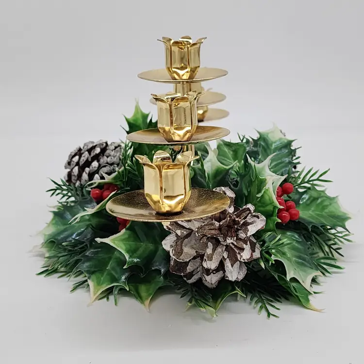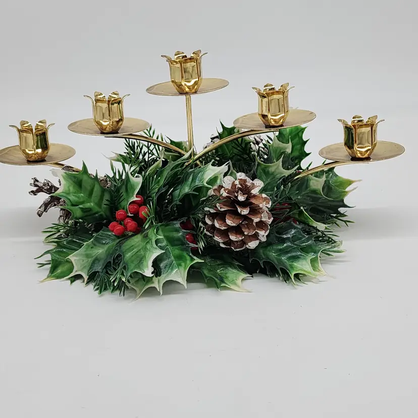 Illuminate your holiday table with this vintage Kitschy Candelabra Candle Centerpiece. Adorned with Christmas berries, pine cones, and poinsettias, it's the perfect addition to your festive decor. 12" Wide • Vintage style candelabra • Decorated with Christmas berries • Features pine cones • Adorned with poinsettias • Perfect for holiday table