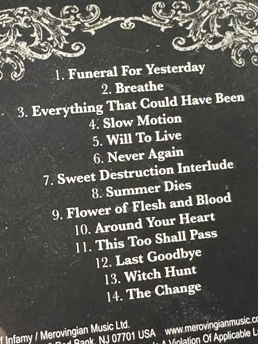 Includes notable tracks such as: • “Funeral for Yesterday” • “Breathe” • “Slow Motion” • “Sweet Destruction Interlude” • “Witch Hunt”