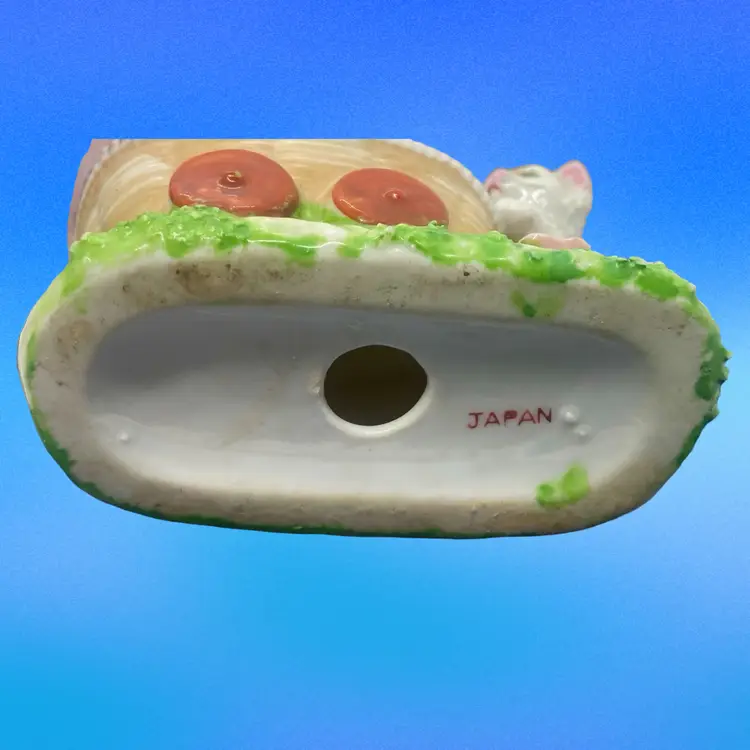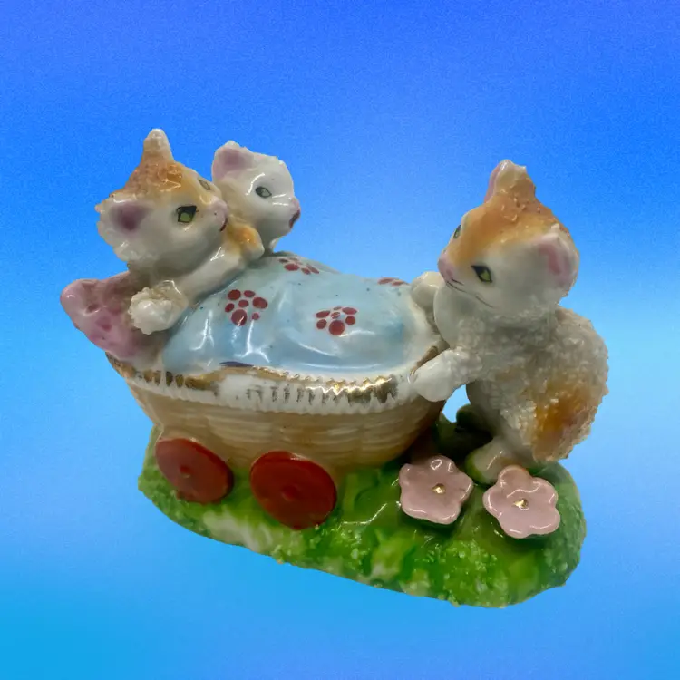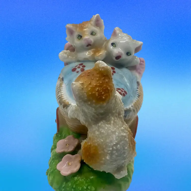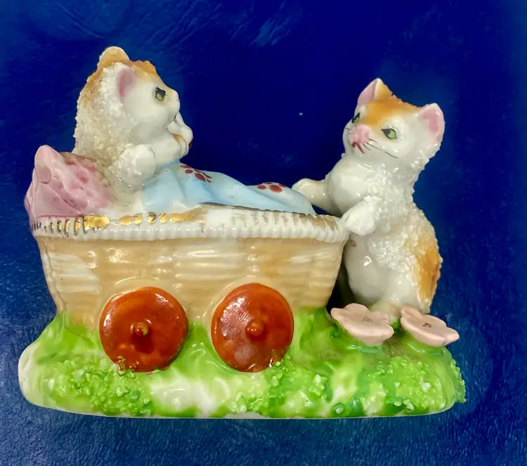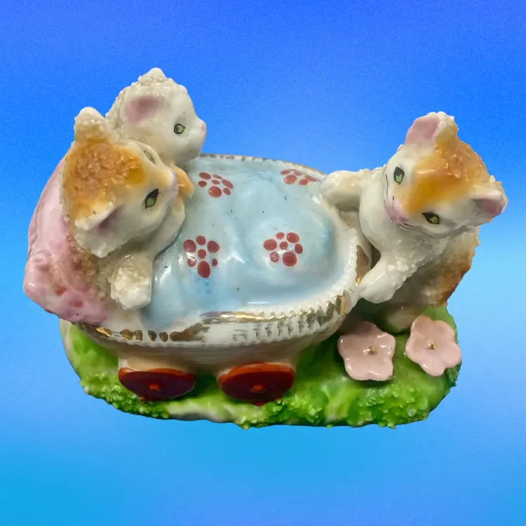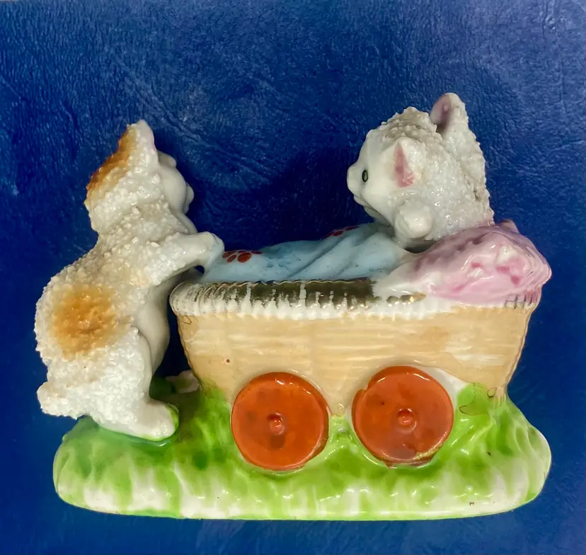 Kittens out for a stroll with momma cat. Such a cute vintage figurine. This is a sweet figurine in excellent condition with no chips or cracks. The fur and grass have a sandy texture. It is marked “Japan” in red ink on the bottom. The figurine is approximately 2.5” tall and 3.5” long.
