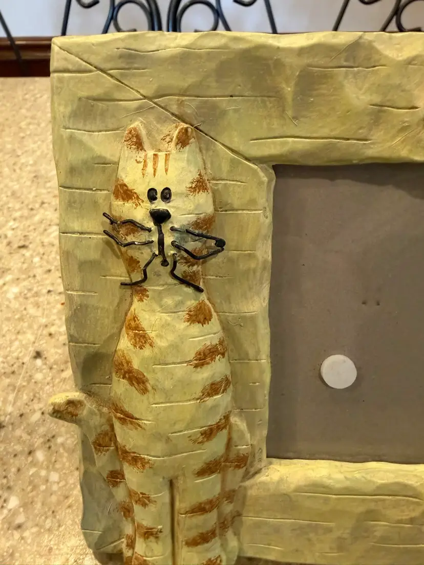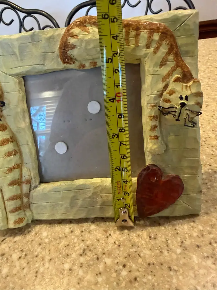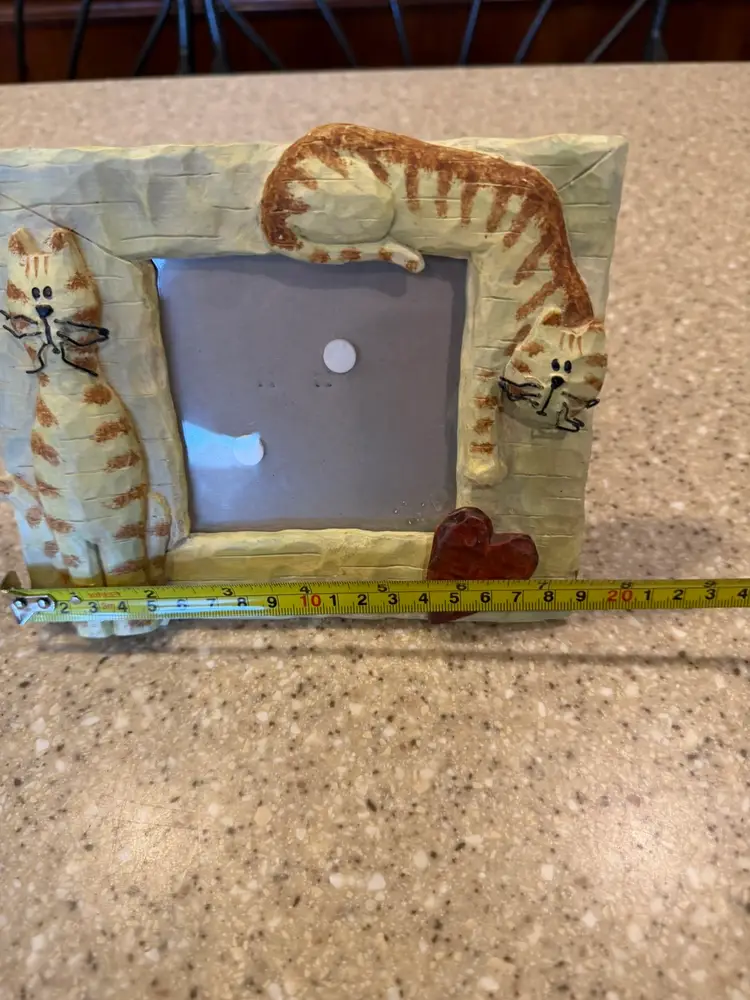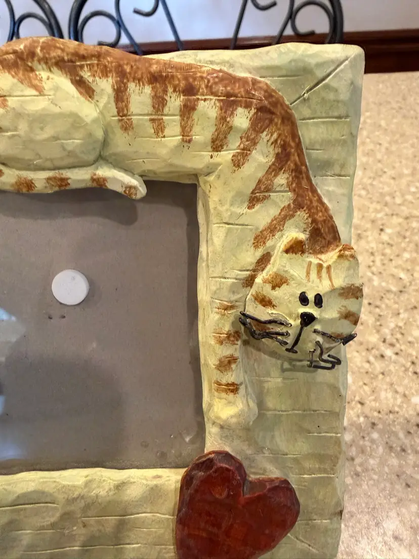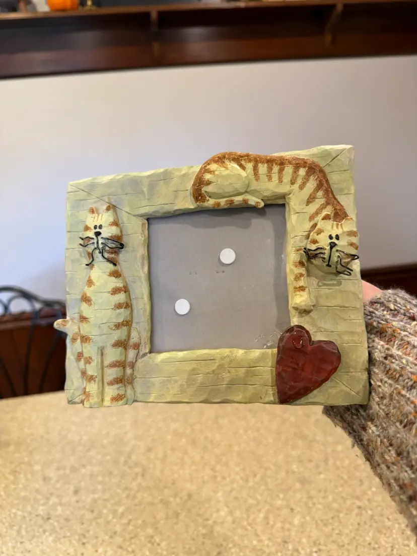 This is a Connoisseur brand cat-themed picture frame. The frame is a "Quirky Kitty Cats Big Heart Standing Resin Picture Frame" and holds a 4x4 inch photo. Cross posted.