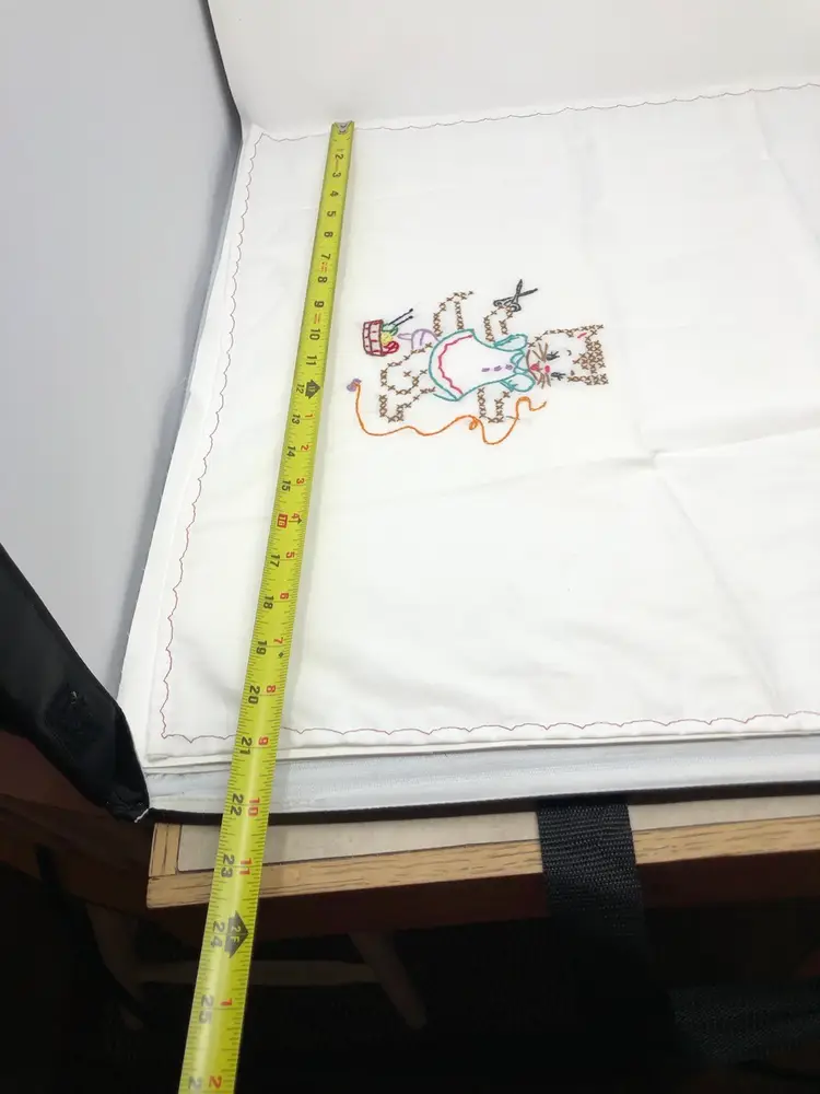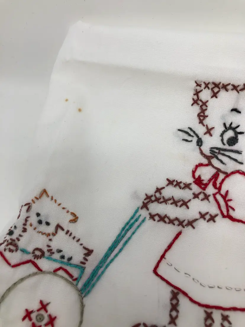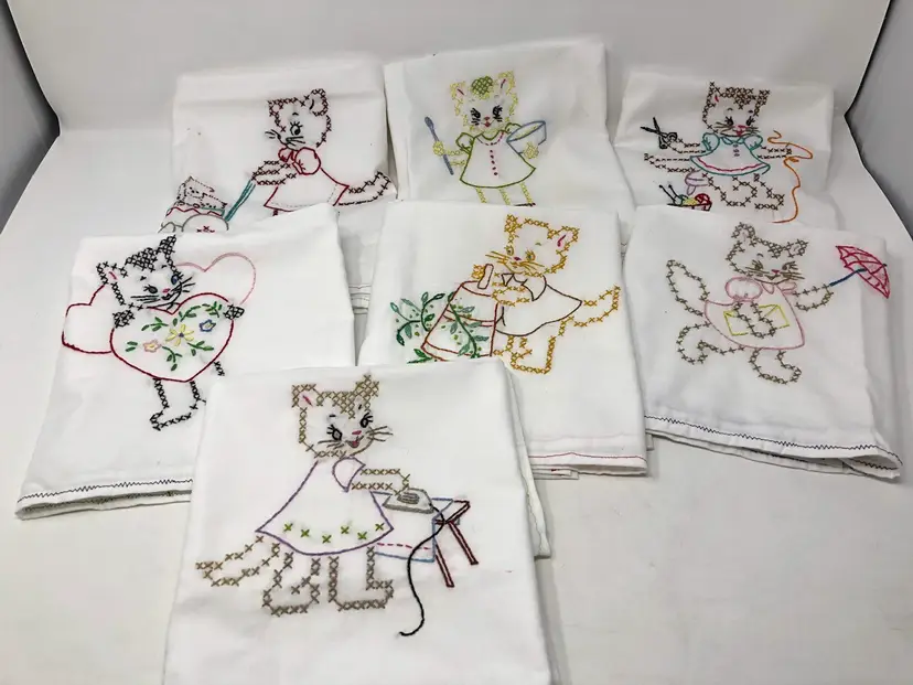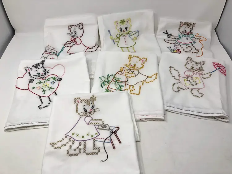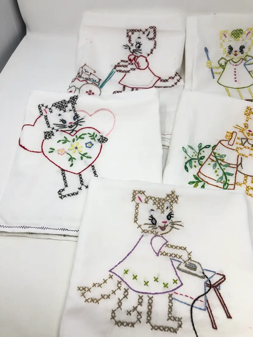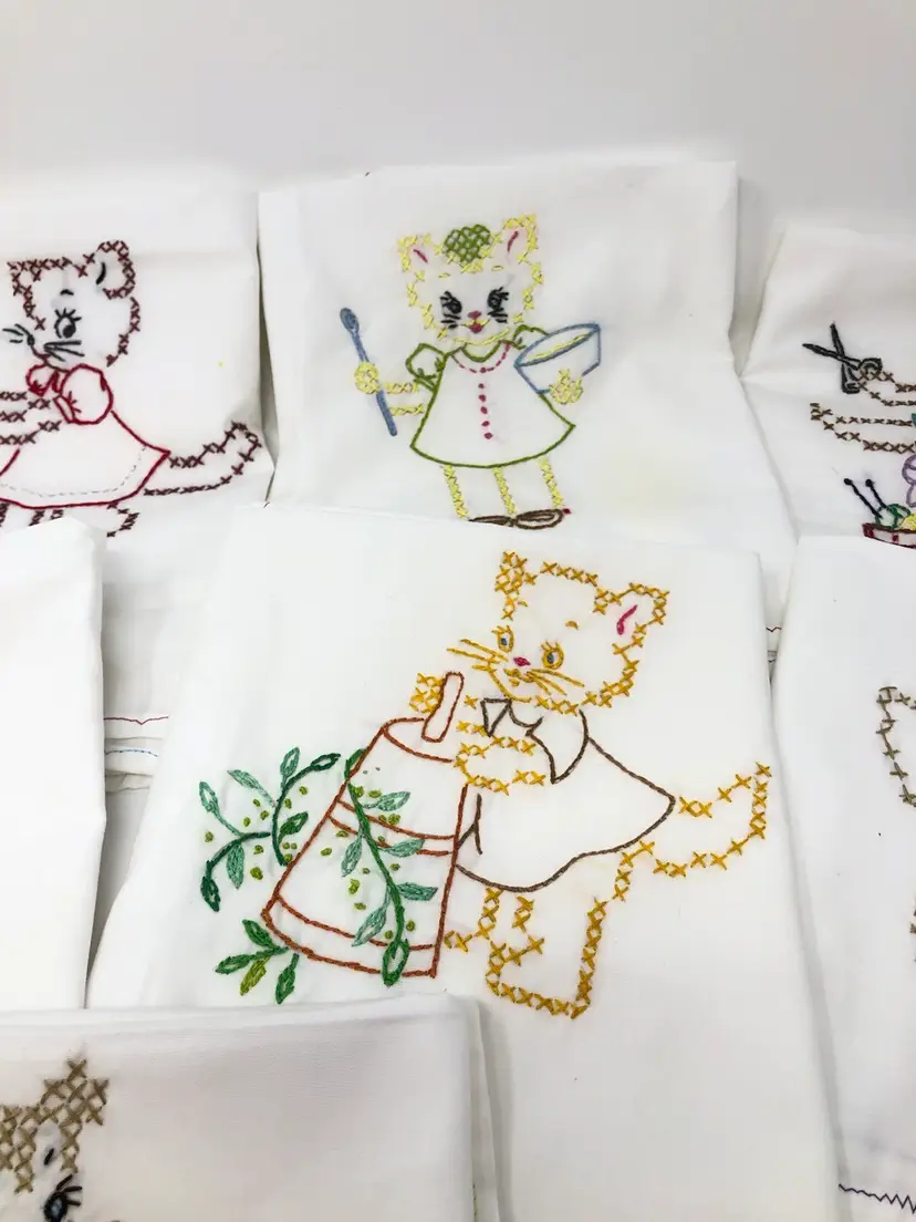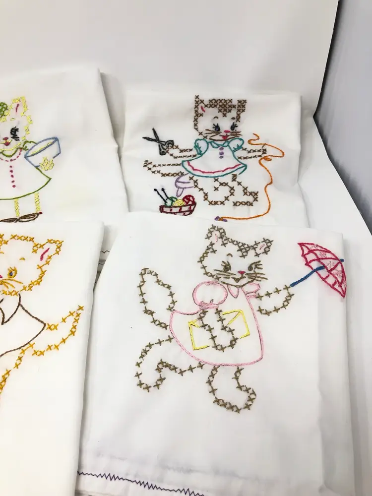 Hand stitched flour sack tea towels featuring kitty cats at work and play. A few spots as shown in photos, most like new. 29" x 21"