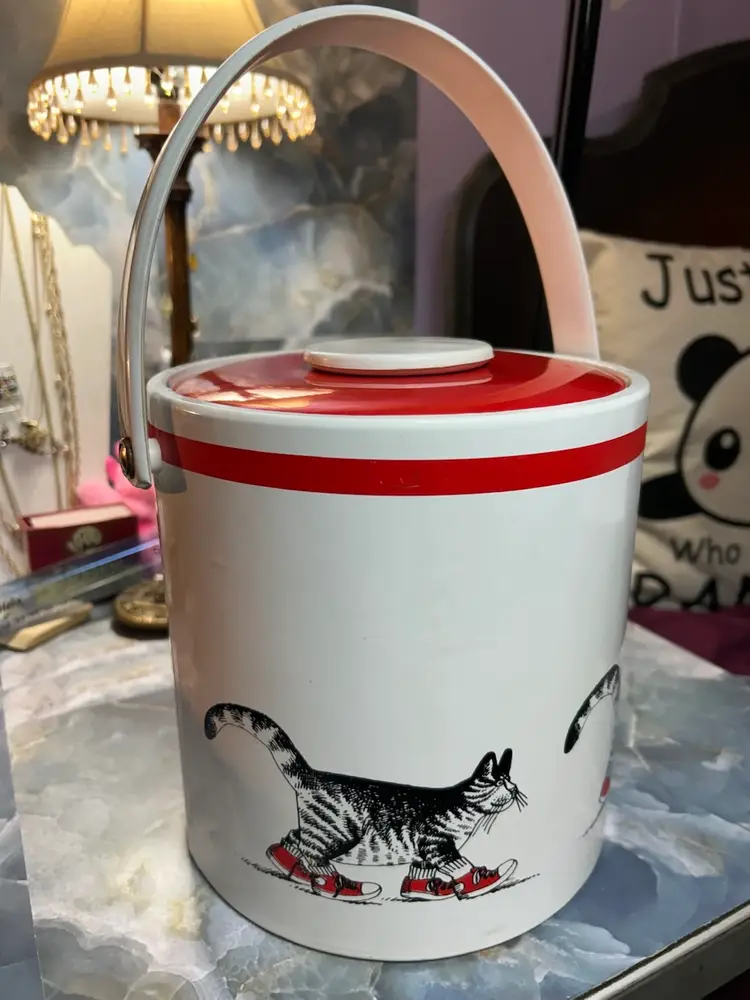 This is a vintage B. Kliban Cat vinyl ice bucket by Sigma Tastesetter. It was produced in the 1980s. In very good vintage used condition. Some scuffs are present due to age and use.