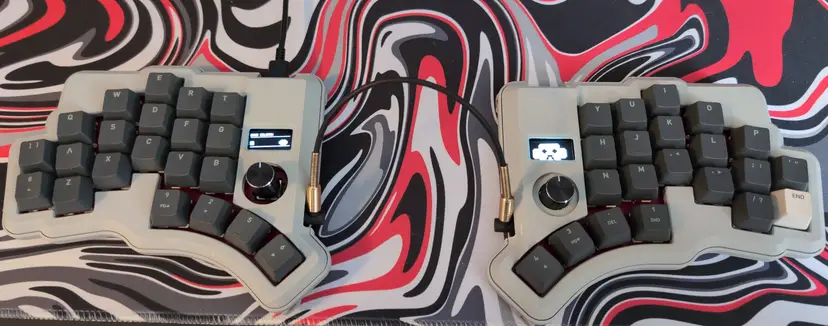 One of the first boards I made, case print quality is a little rough but has feet and is magnetized. Works beautifully with default QMK firmware currently. Keychron browns and amazon keycaps included.