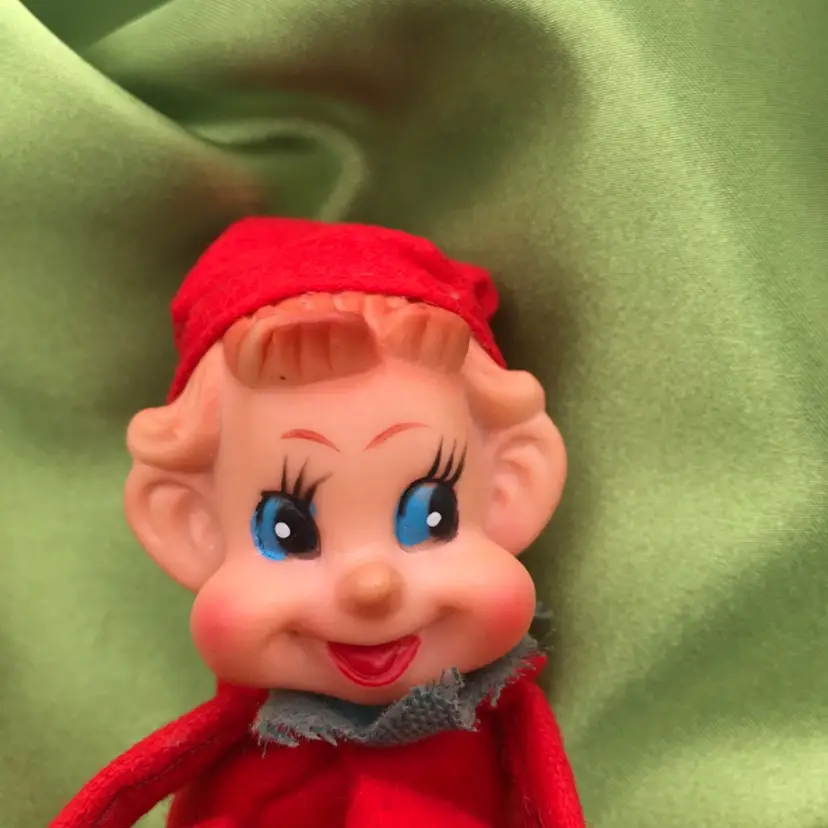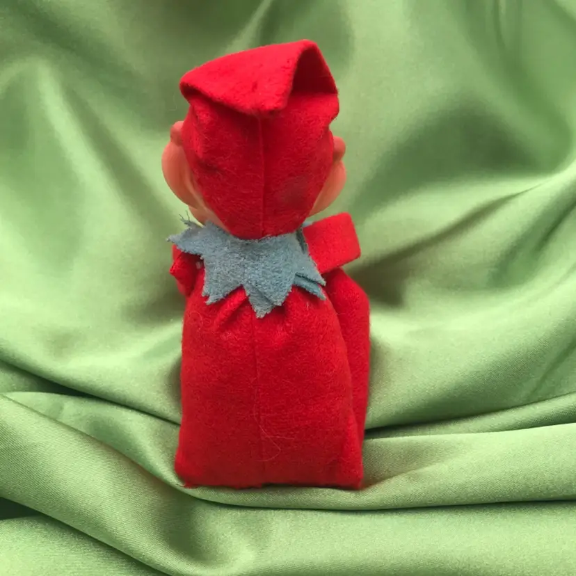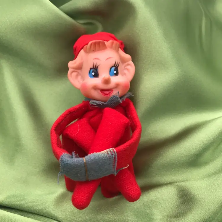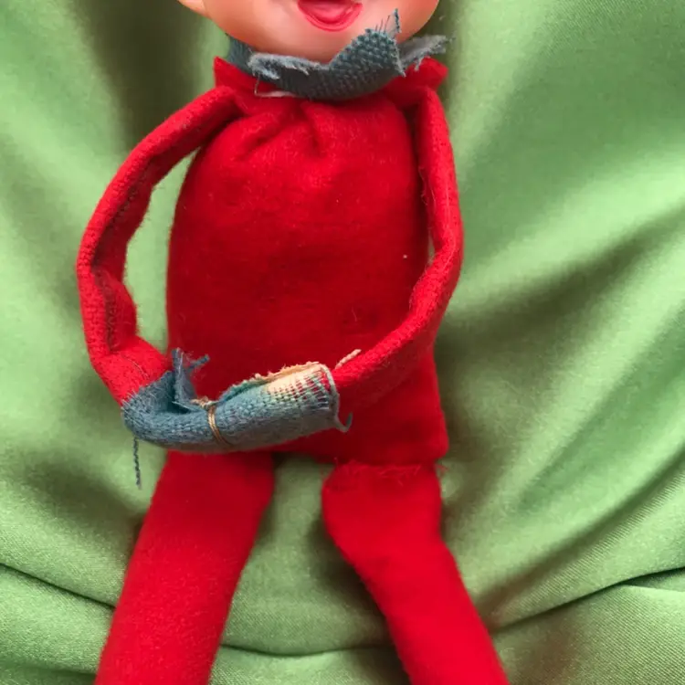 Christmas Knee Hugger in red. Plastic face. Length 8” long, 4.5” hugging knees. Some wear to where hands meet and top of leg has been repaired. Cute face with no damage.