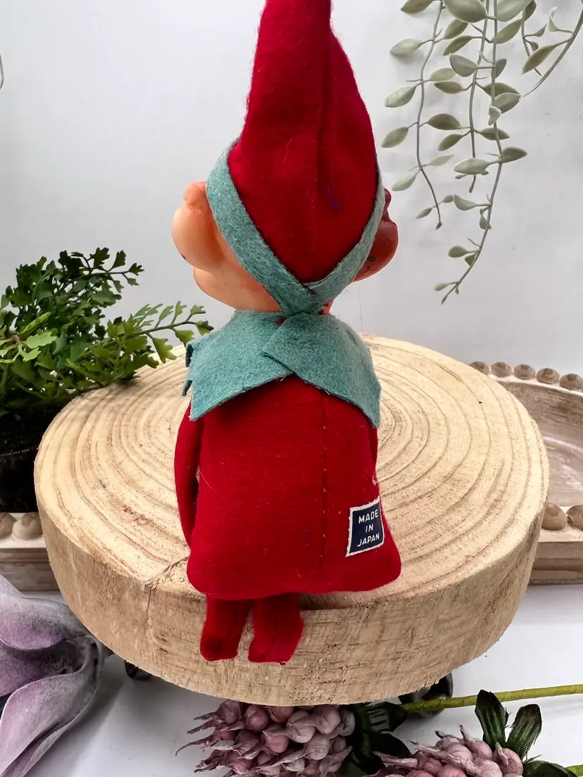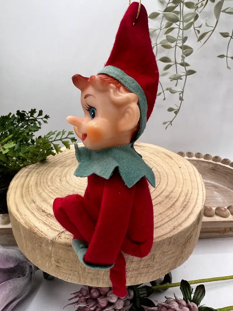 Adorable vintage Christmas ornament elf in a red suit. Minimal signs of Sun fading. 5.5” tall with its original sticker.