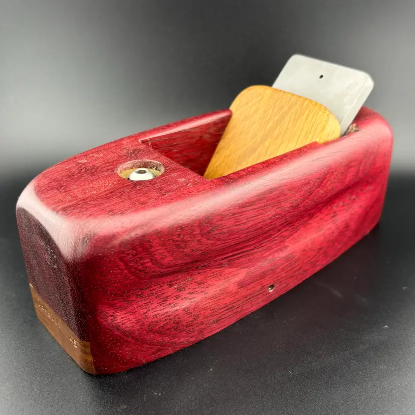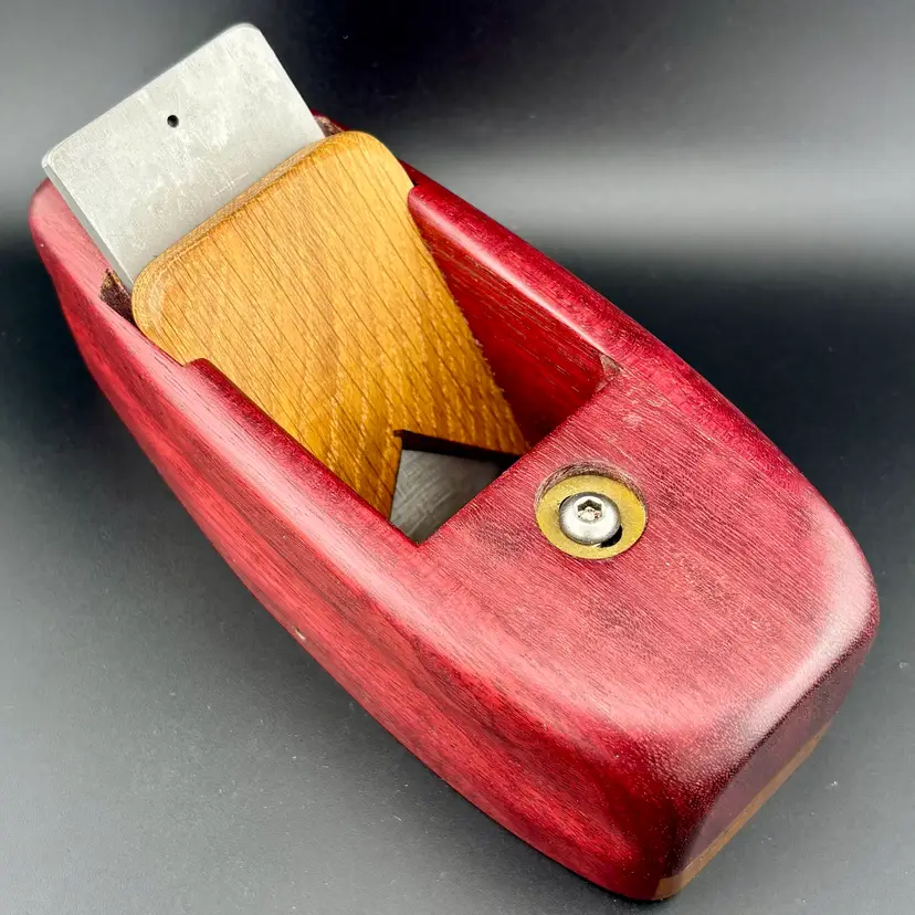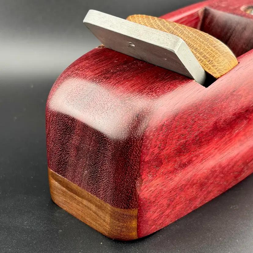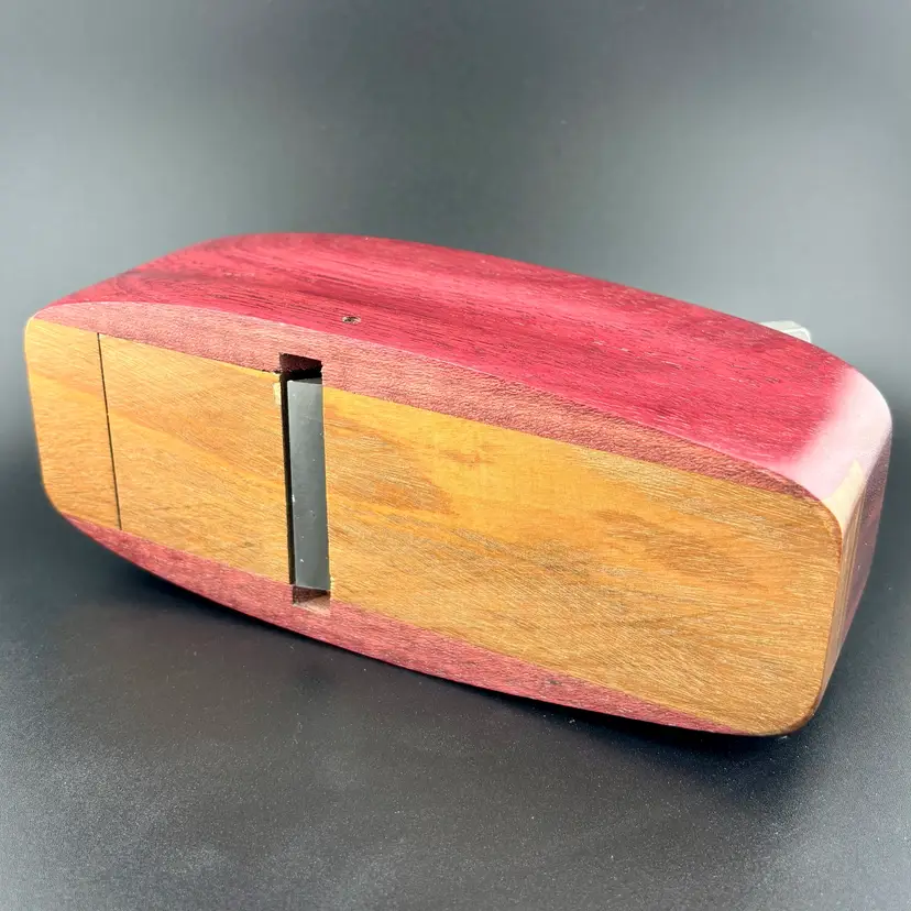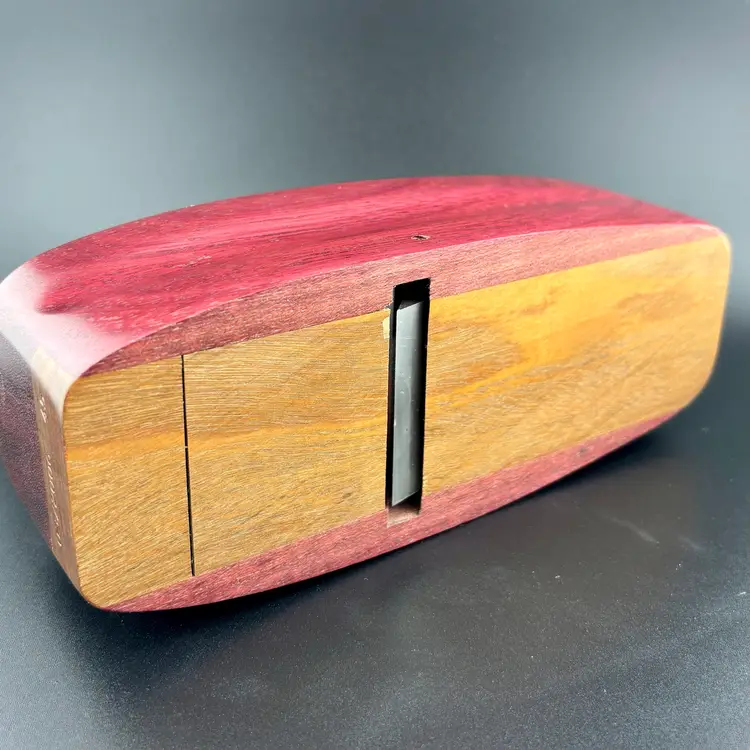 Created by Steve Knight of Knight Toolworks in March, 2006. The plane is made from Purpleheart for the main body, with Ipe for the sole and wedge. Features include a 45 degree bed angle, hex wrench adjustable mouth, integrated lateral blade positioning screws, and literally the thickest blade (1/4") I've ever seen on a plane. It measures 7-1/2 inches long by 3 inches wide, with a 2 inch wide blade. The blade is shaving sharp, and the only flaw I see is a tiny chip out of the Ipe near the mouth (see pictures).