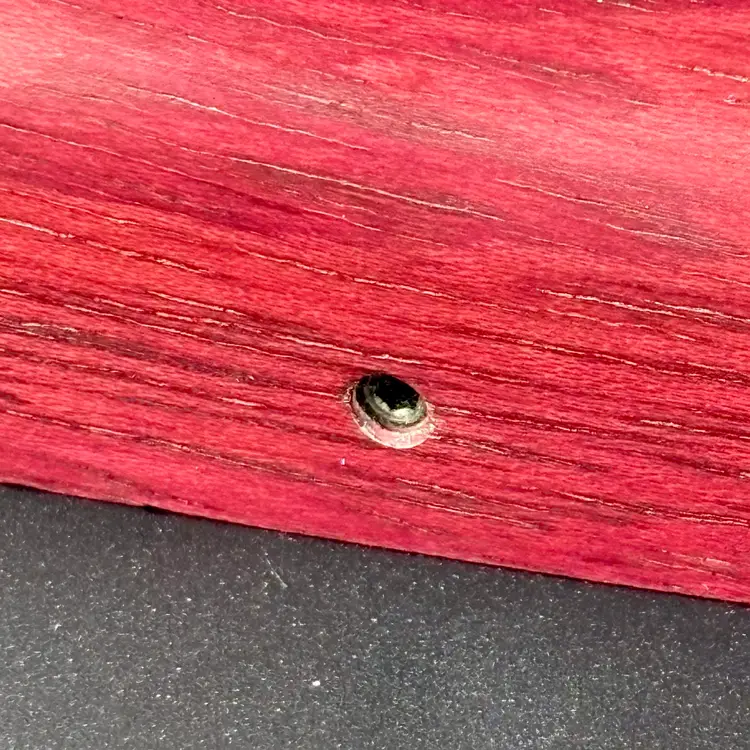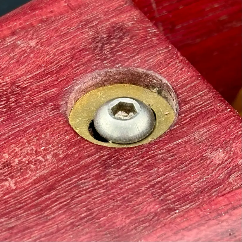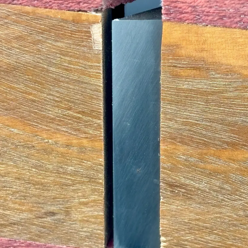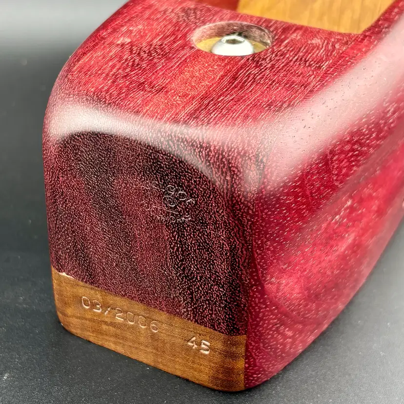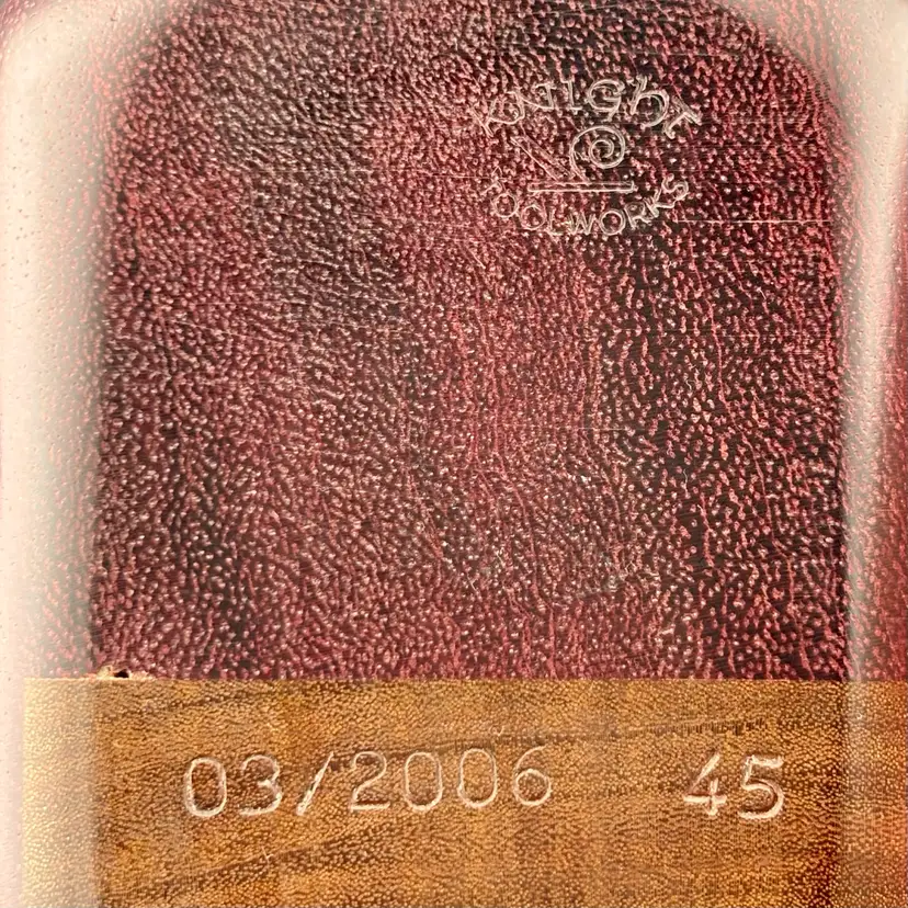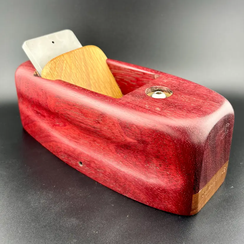 Created by Steve Knight of Knight Toolworks in March, 2006. The plane is made from Purpleheart for the main body, with Ipe for the sole and wedge. Features include a 45 degree bed angle, hex wrench adjustable mouth, integrated lateral blade positioning screws, and literally the thickest blade (1/4") I've ever seen on a plane. It measures 7-1/2 inches long by 3 inches wide, with a 2 inch wide blade. The blade is shaving sharp, and the only flaw I see is a tiny chip out of the Ipe near the mouth (see pictures).