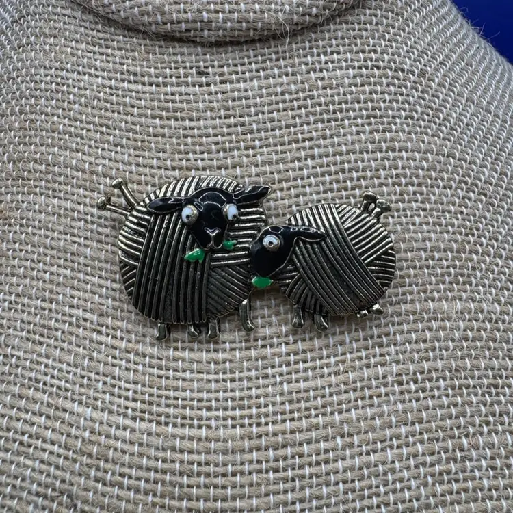 Sheep brooch Featuring sheep as balls of yarn with needles as tails Gold tone Measures 1 3/4 inch by 1 inch Perfect for any knitter