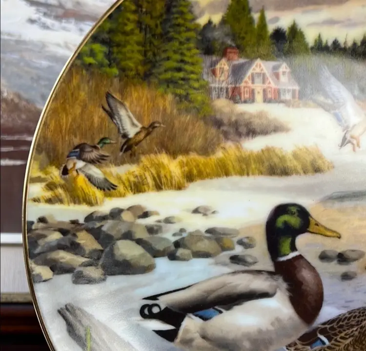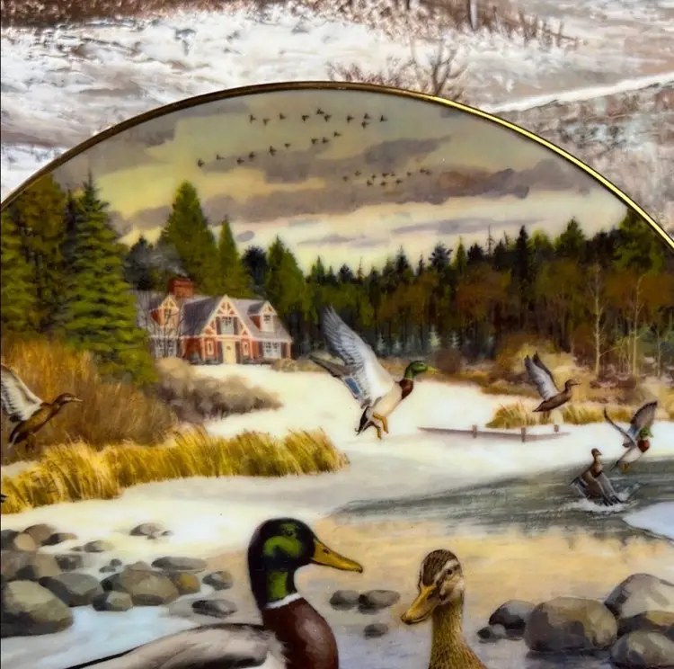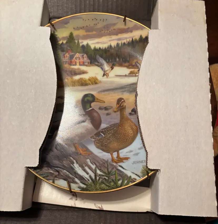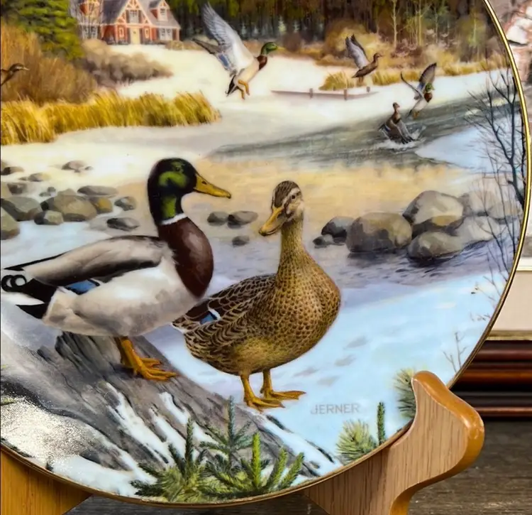 Beautiful Edwin M Knowles collector's plate titled "The Mallard" by Bart Jerner. This plate is the second issue in the Living room With Nature Jerner's Ducks collection, sponsored by The Wildlife Society. It's in great condition and comes with the original box.