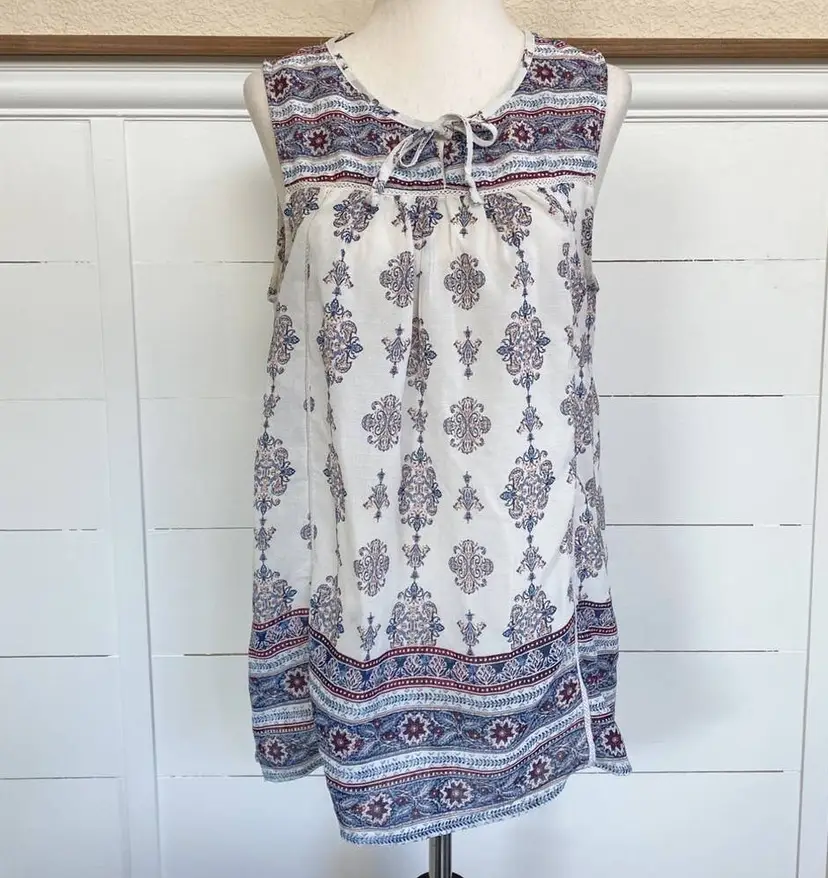 Sleeveless top with boho accents, tie-neck front, crocheted lace accents. Super cute for Summer, picnics, 4th of July parties, etc.