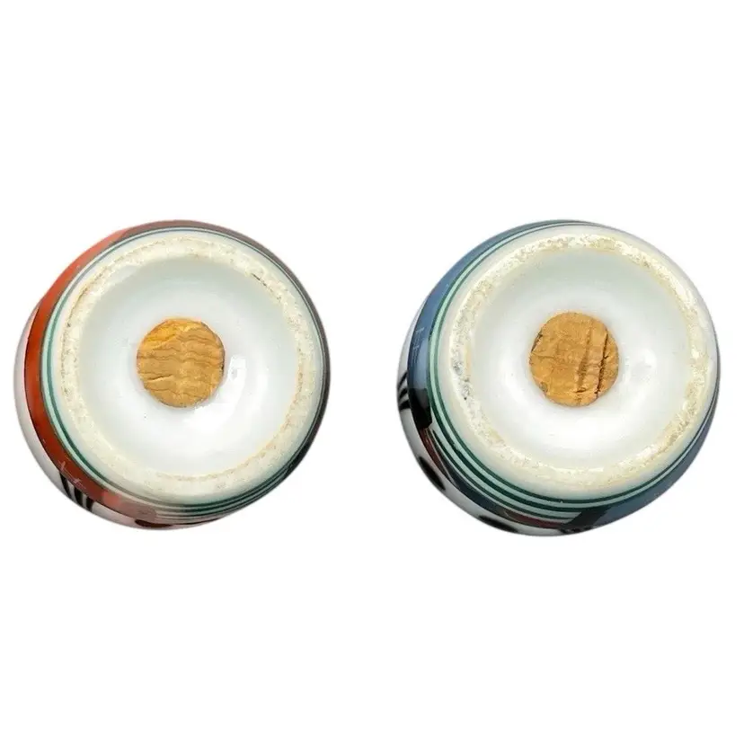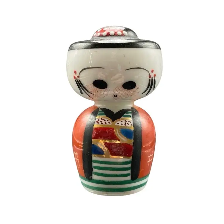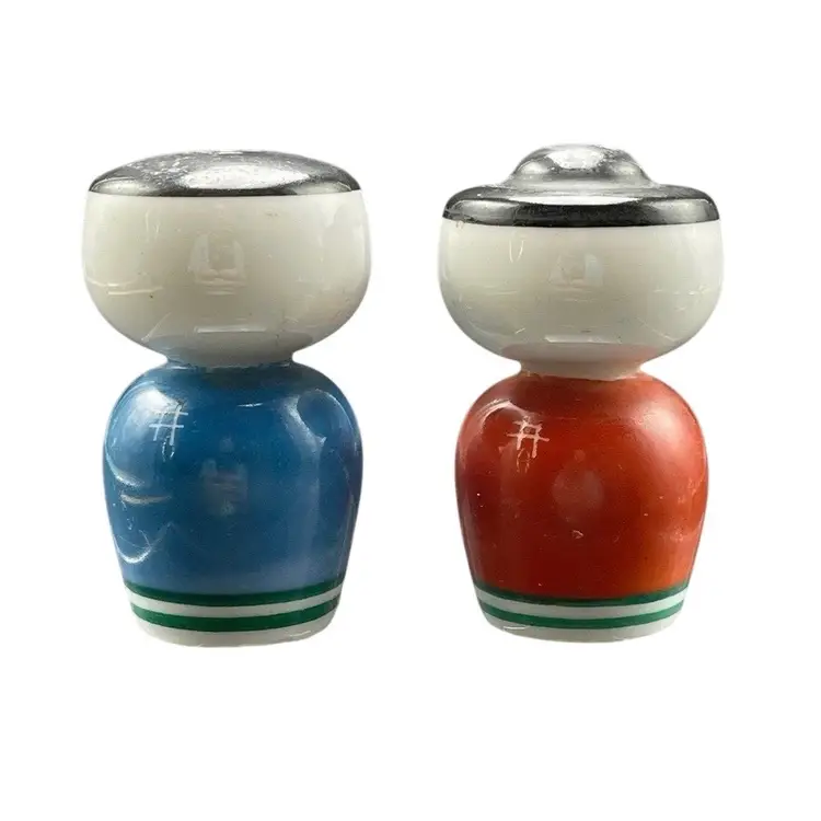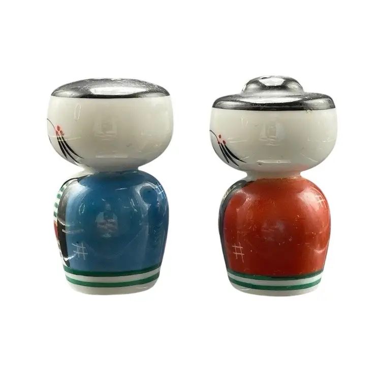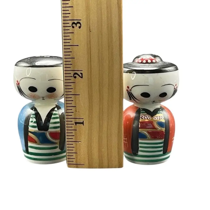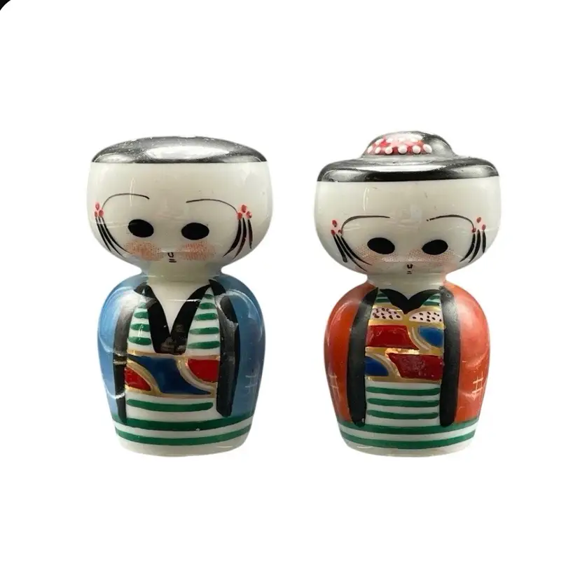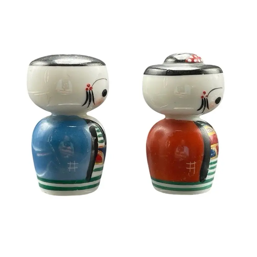 This is a set of 2 ceramic Kokeshi Doll salt and pepper shakers with their original corks. Each measure approximately 2.25" tall. No chips or cracks.