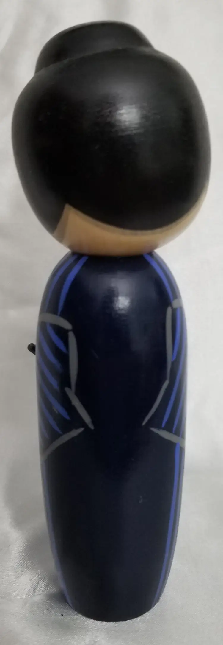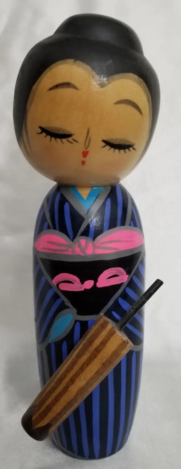 This listing features a 7 1/2" tall Kokeshi Japanese Wooden Doll dressed in a black kimono with blue stripes, carrying an umbrella. I encourage potential buyers to view the accompanying images for a detailed look at the product and invite any questions about the item. The doll is a charming representation of traditional Japanese craftsmanship and a delightful addition to any collection or as a decorative piece. Thank you for visiting my shop.