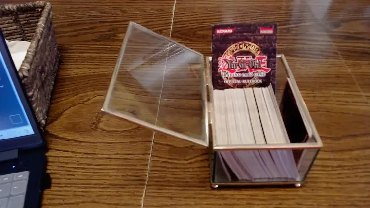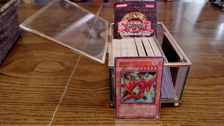 I do not know anything about these cards except that they were collected and used in a card playing game. There are 73 cards total, 51 Tan Cards, 44 Rust Cards, 61 Green Cards, 16 Cranberry Cards, 1 Blue card, and 2 Purple cards. Each card has a Mythical figure on it and numbers of points awarded in the game. There is a Version 5 Official Rule book with the set. All the cards are in a Glass box with 4 feet. Cards are in good used condition.