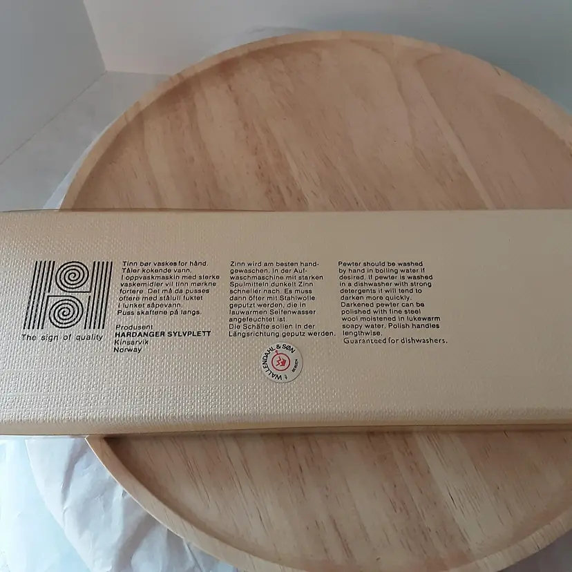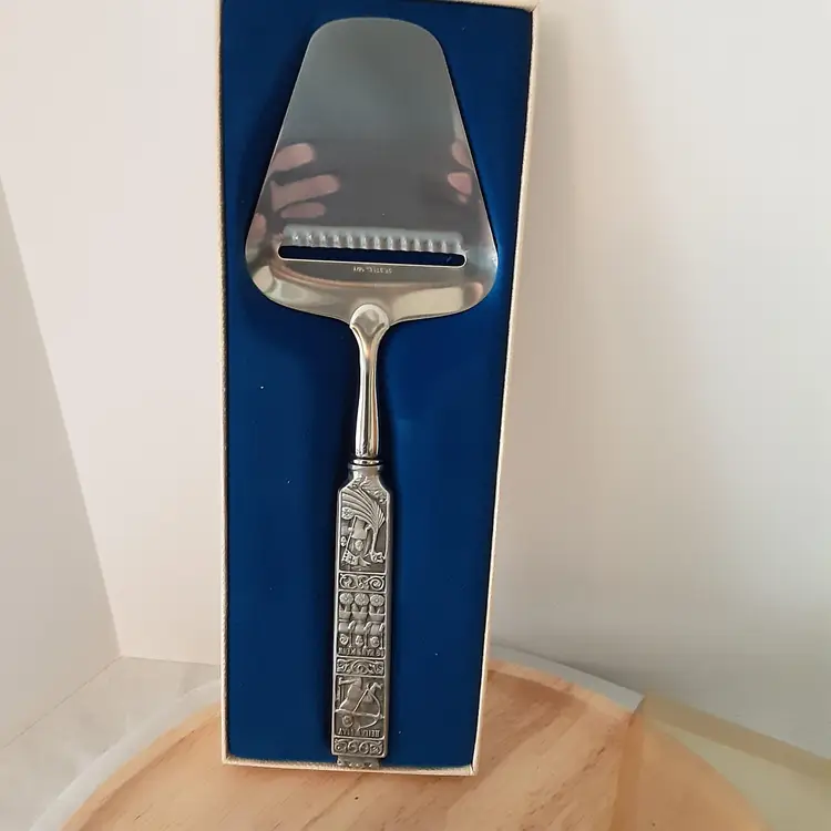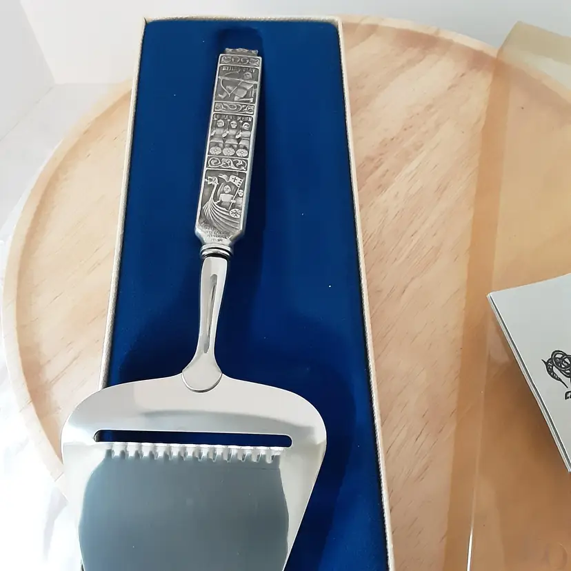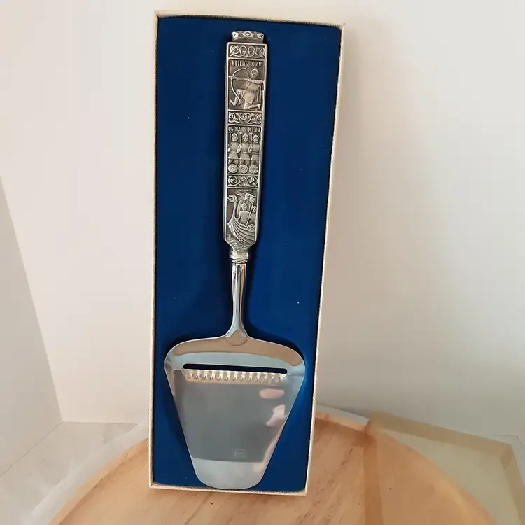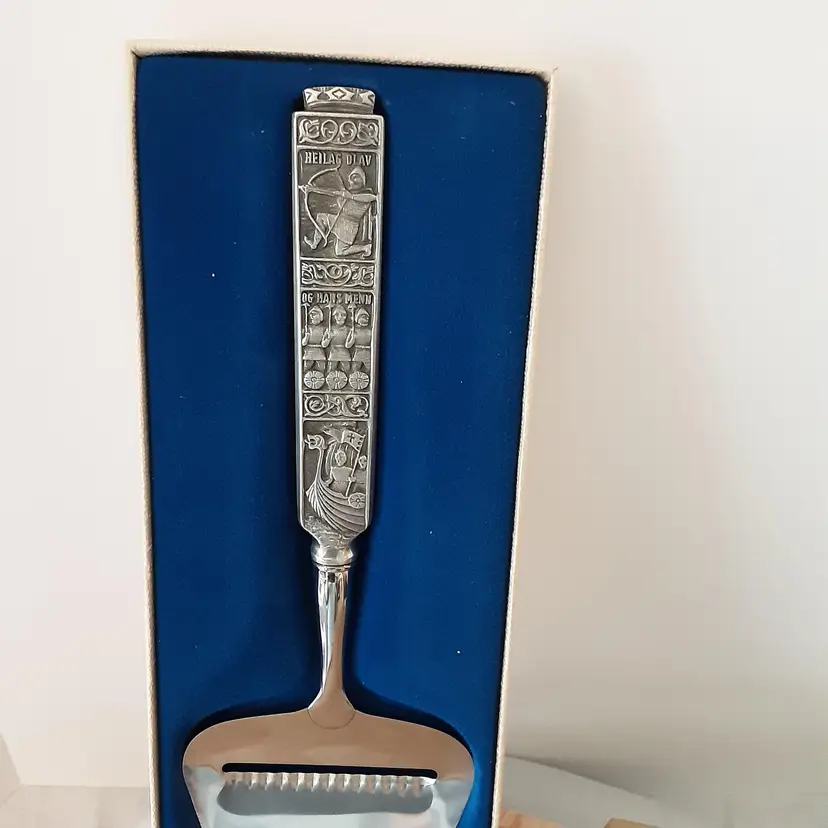 Terrific Pewter cheese slicer. Amazing handle w/Norwegian depictions. Comes in original box.