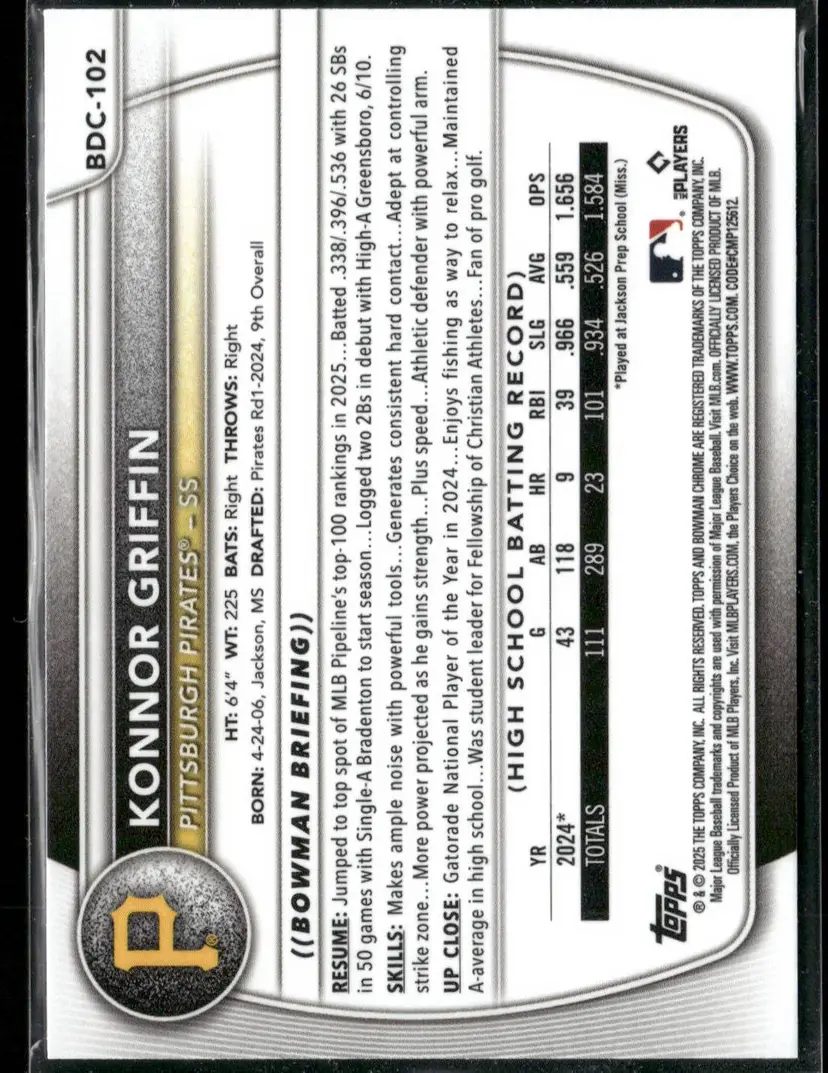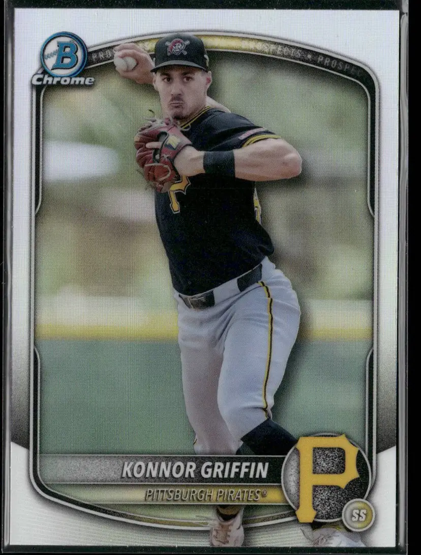 Check out this Konnor Griffin card from the 2025 Bowman Chrome Prospects series. A must-have for any Pirates fan or card collector.