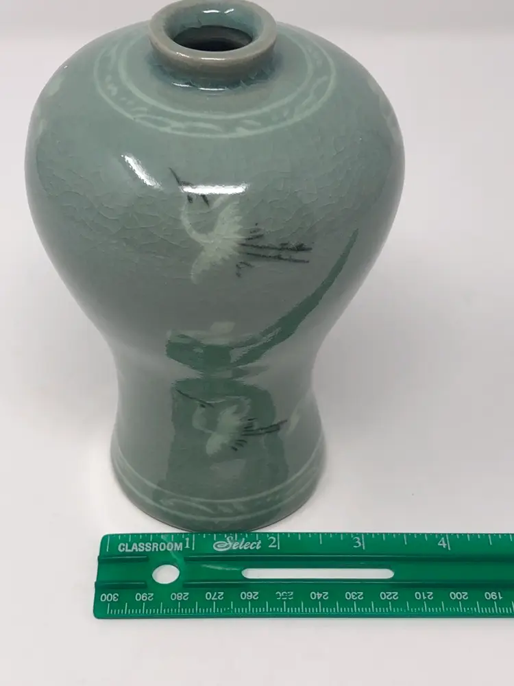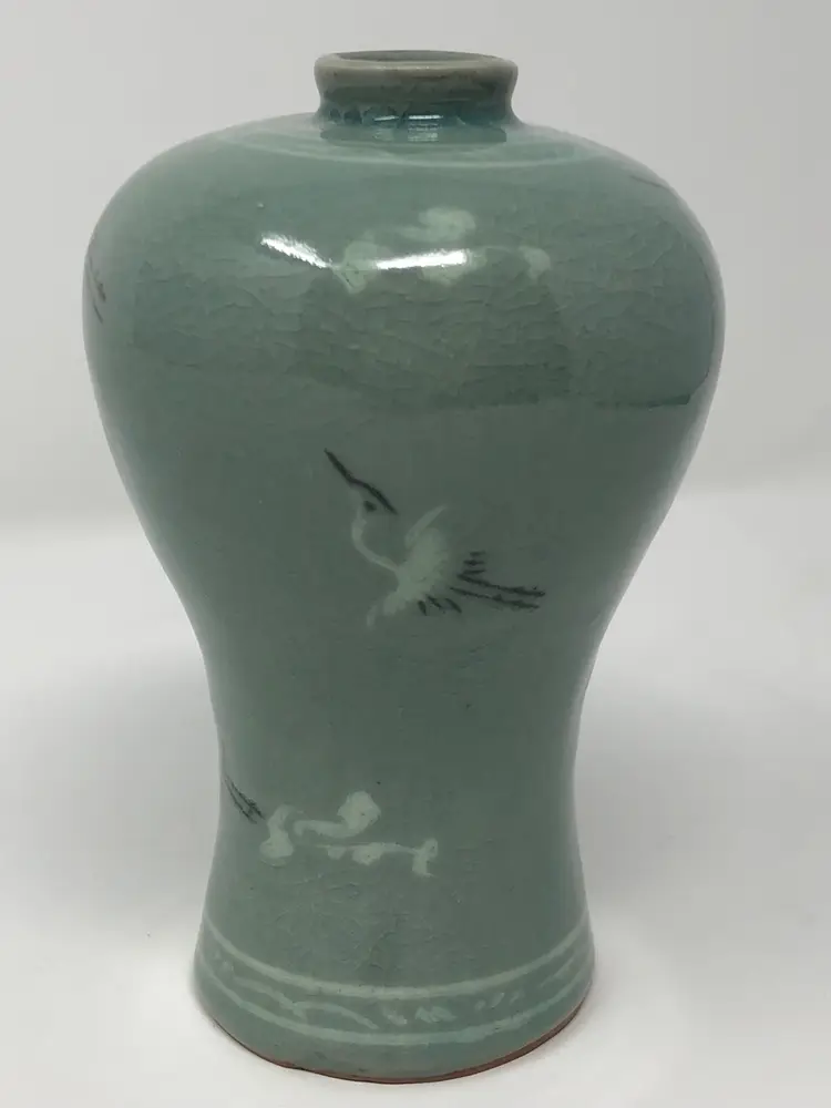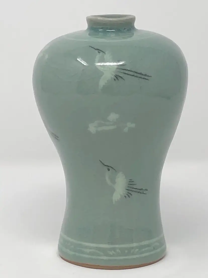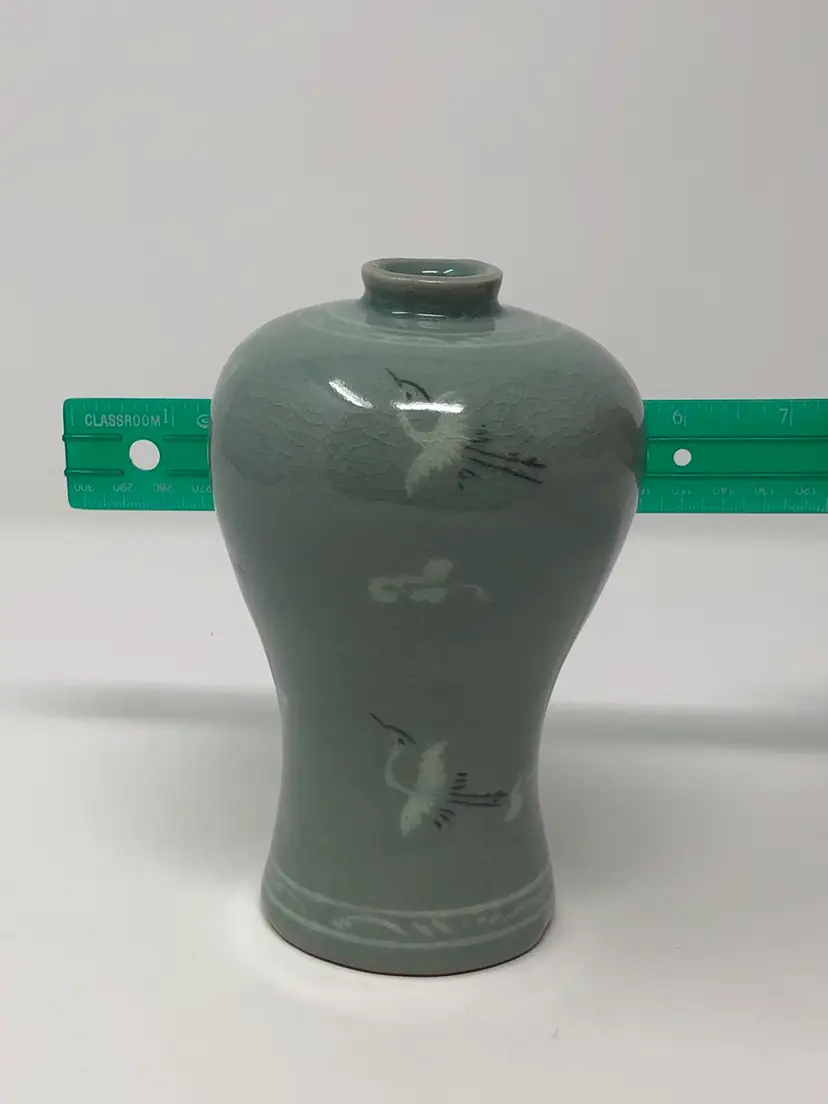 So special! Part of a beautiful collection gathered during world travels, this vase stands almost 6” tall. Sometimes referred to as ‘Meiping’ or ‘plum vase’ for holding long branches of blooming flowers. Features cranes flying in the clouds, and light rings around the small opening of the vase and around the base. Crazing and condition as shown in photos as well as maker’s mark