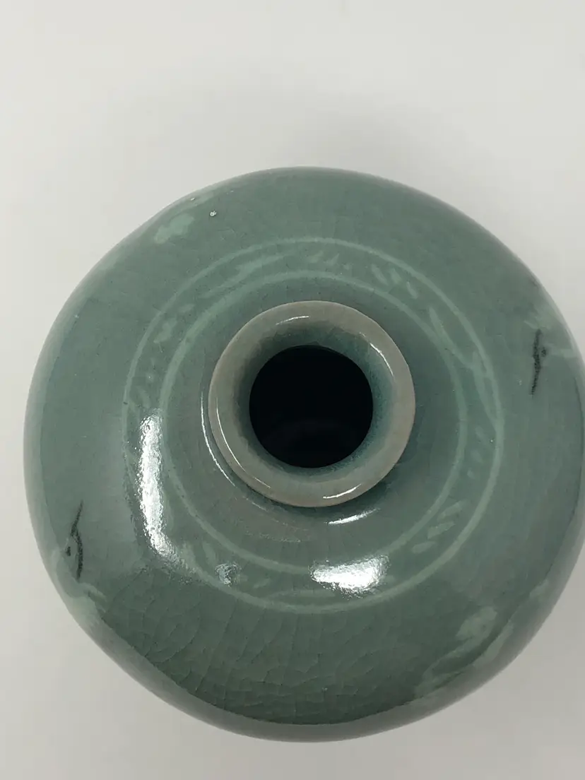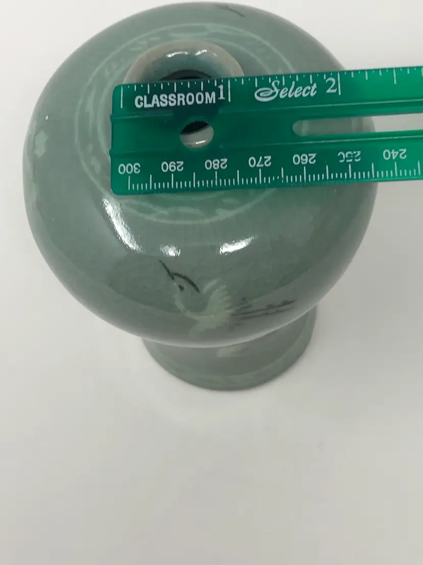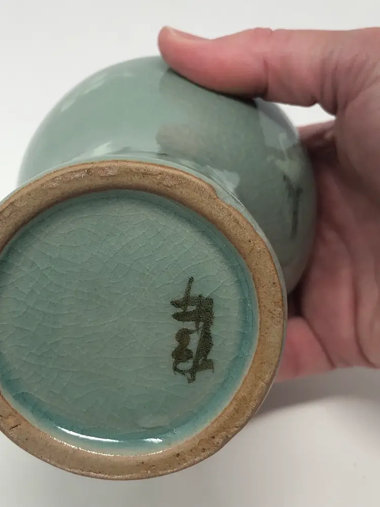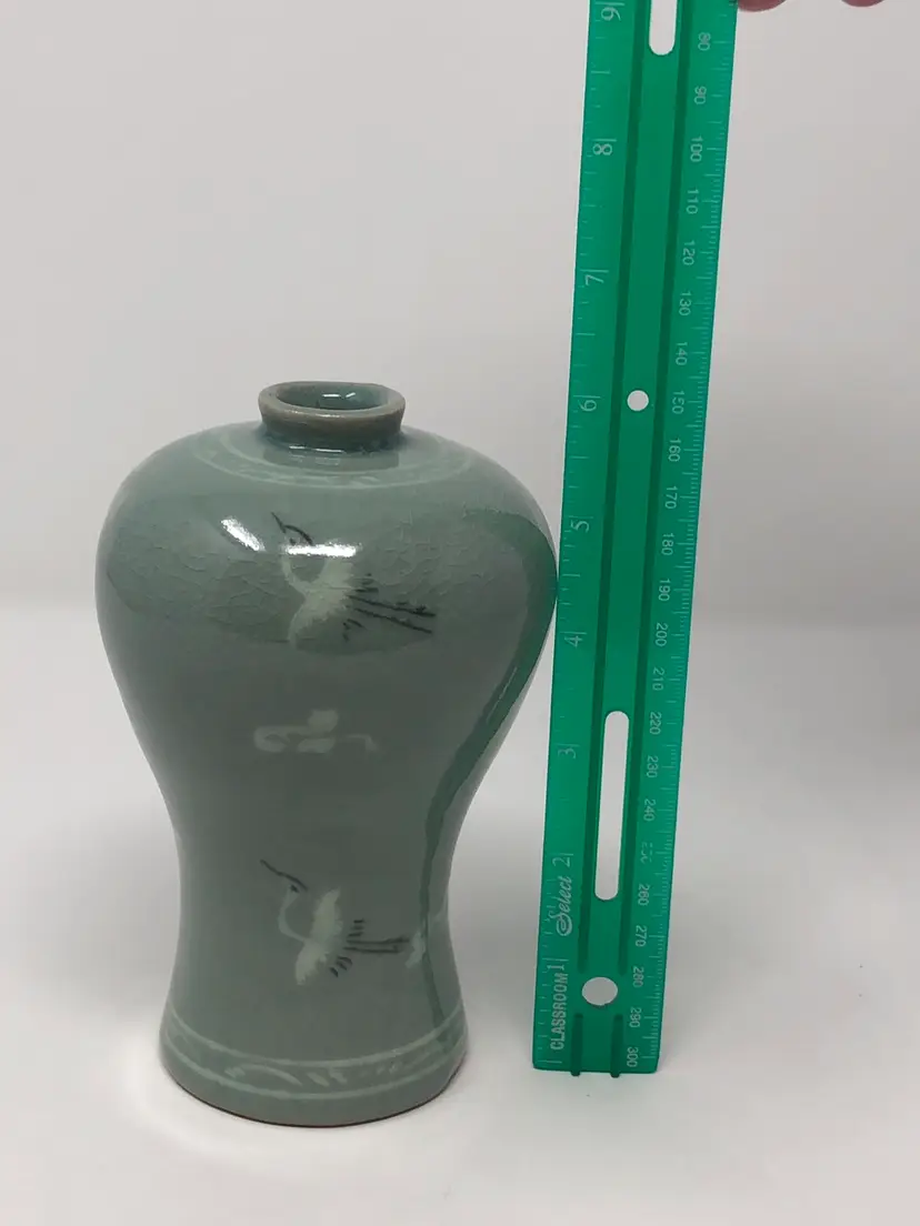 So special! Part of a beautiful collection gathered during world travels, this vase stands almost 6” tall. Sometimes referred to as ‘Meiping’ or ‘plum vase’ for holding long branches of blooming flowers. Features cranes flying in the clouds, and light rings around the small opening of the vase and around the base. Crazing and condition as shown in photos as well as maker’s mark