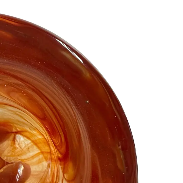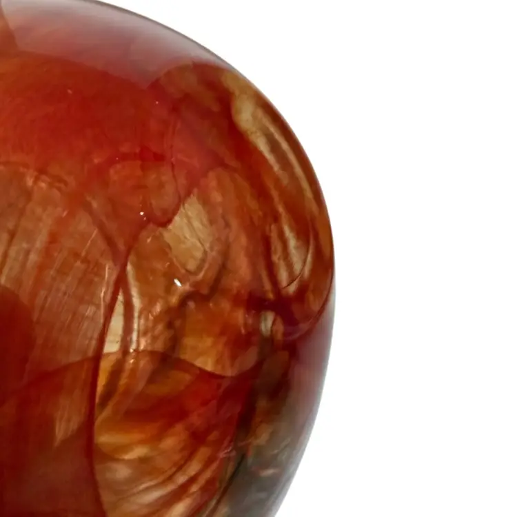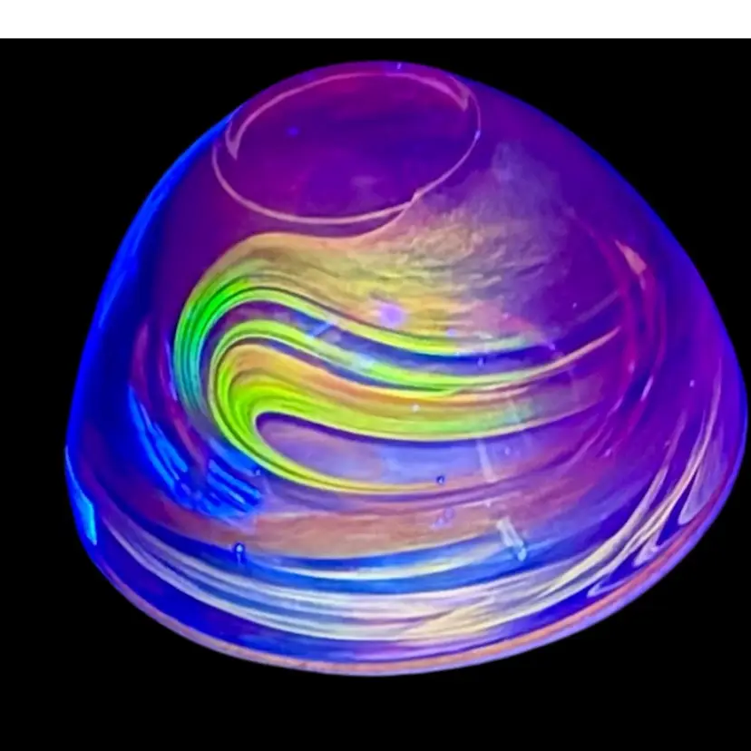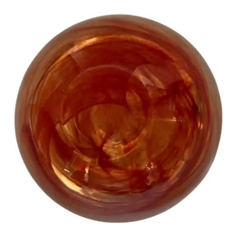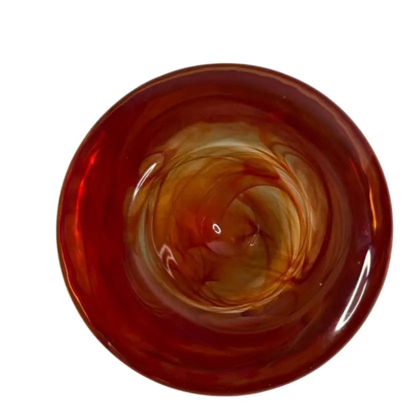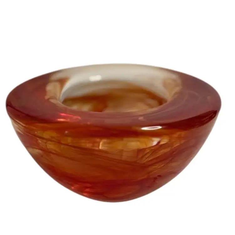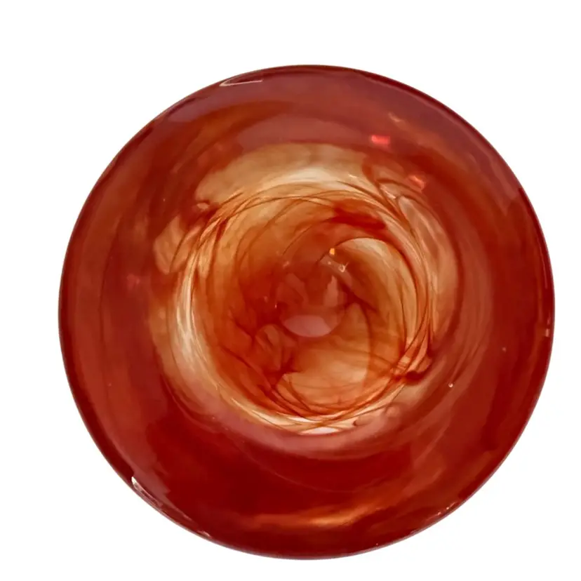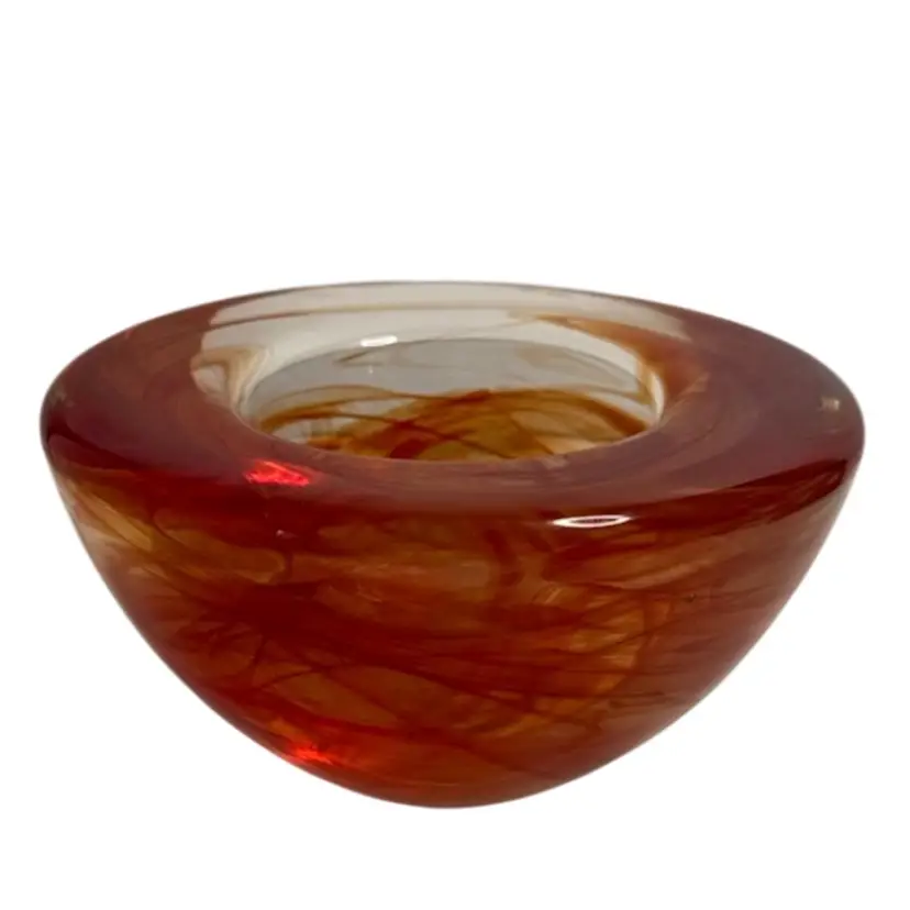 Add a touch of modern elegance to your home decor with this Kosta Boda Anna Ehrner Atoll candle holder. The hand-blown glass holder features a vibrant red color with a swirl pattern that adds an artistic touch to any room. The candle holder is suitable for votive candles or tea lights. The glossy finish and abstract design make it a unique and stylish choice for any home. Glows with 365 UV Light.