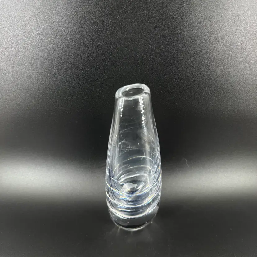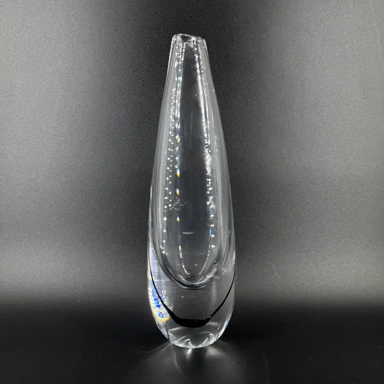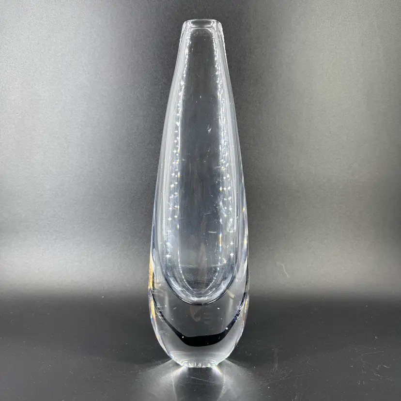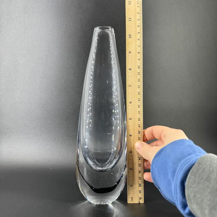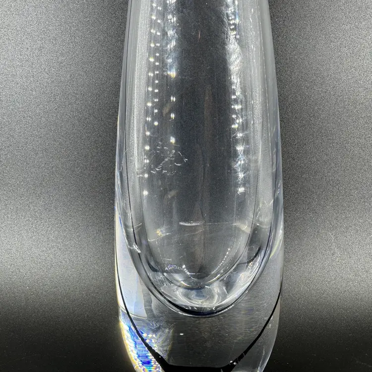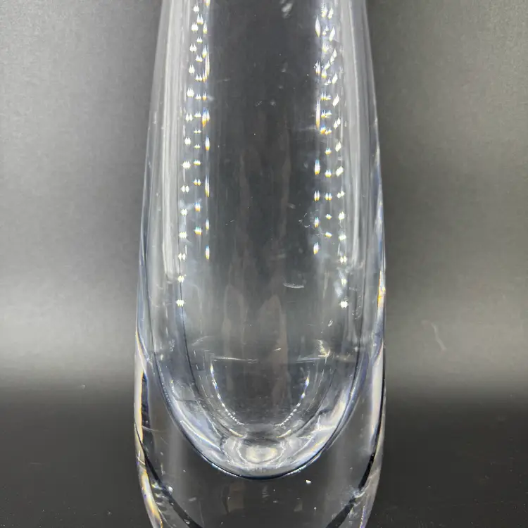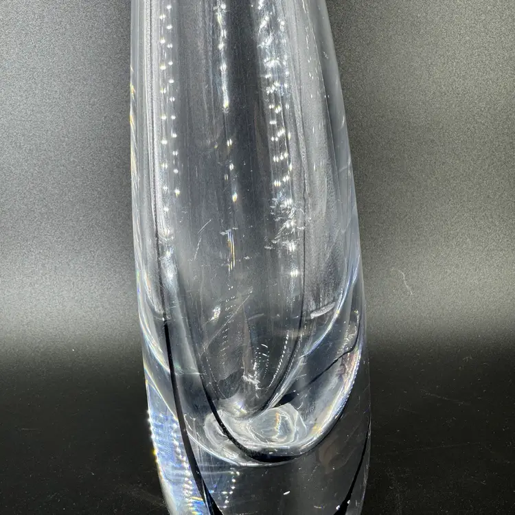 This beautiful Kosta Boda Clear Purple Amethyst Ribbon Vicke Lindstrand Vase does have some hard water stains but has been cleaned to get the hard water removed. The height is approximately 11”. There are scuffs and some scratches also there are no chips or cracks. It is signed on the bottom.