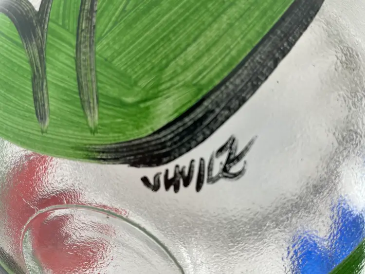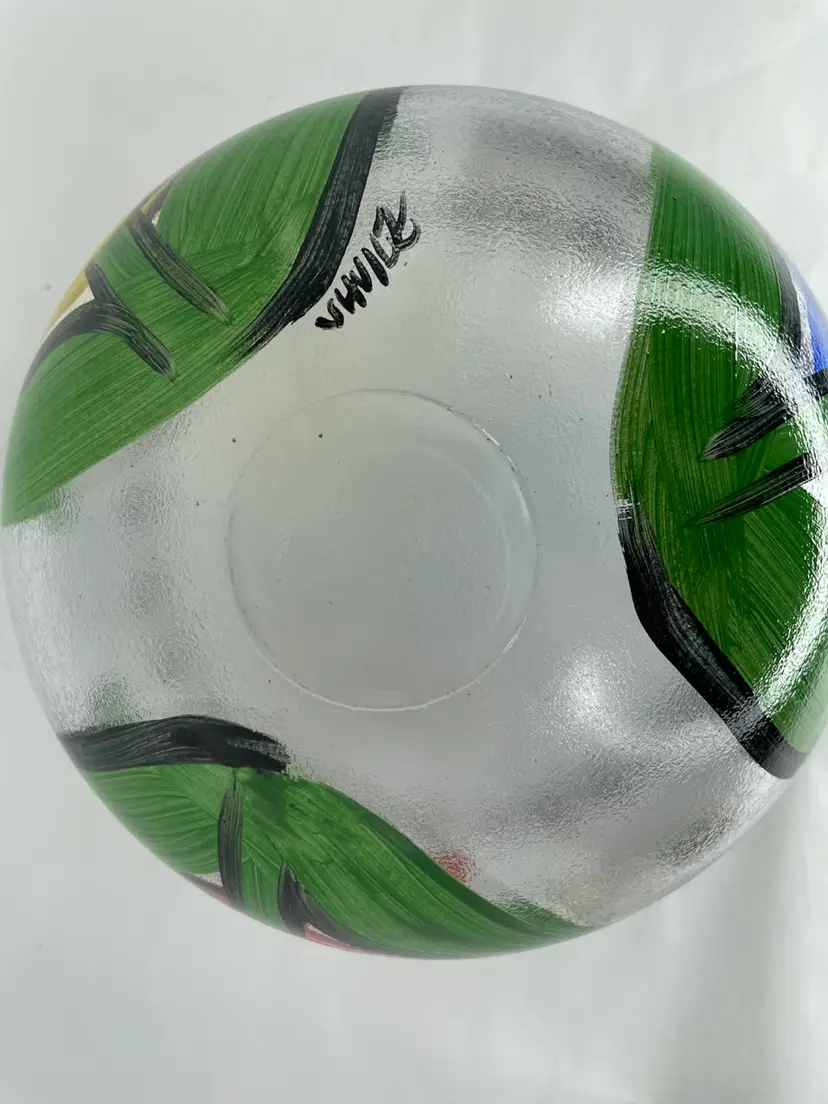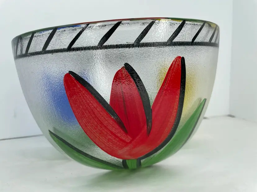 The clear bowl with red, yellow & blue tulips is made of high-quality glass and is suitable for hand wash only. It is an original piece, signed by the artist, and is a must-have for any collector of decorative cookware, dinnerware, and serveware. Don't miss your chance to own this beautiful Kosta Boda glass bowl, perfect for displaying flowers or as a standalone piece of art.