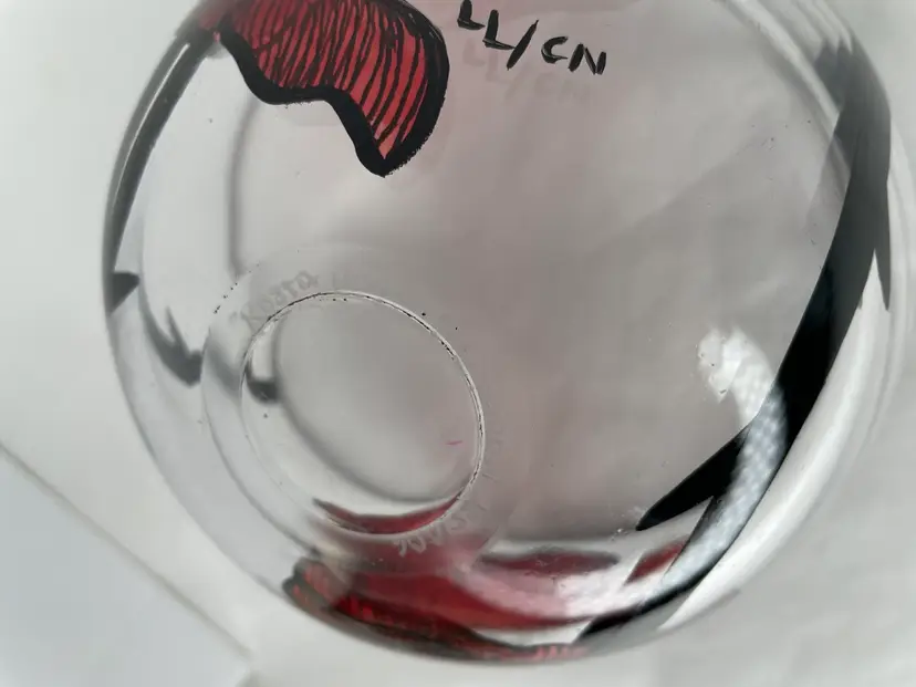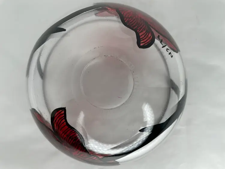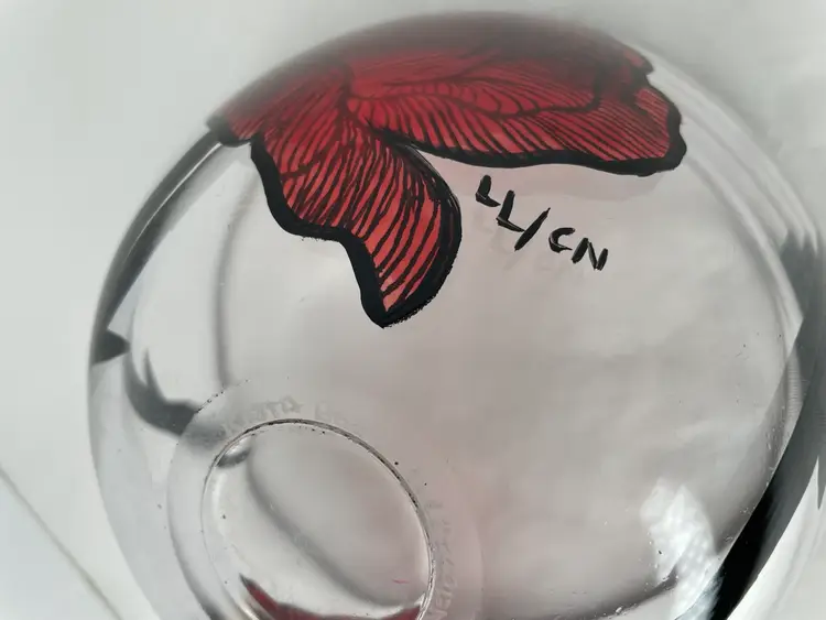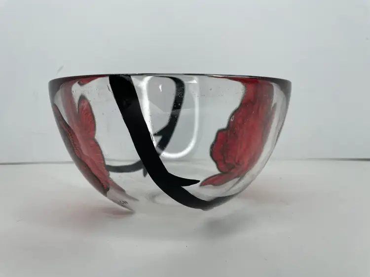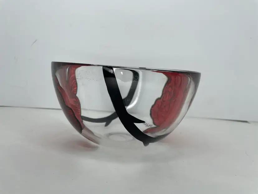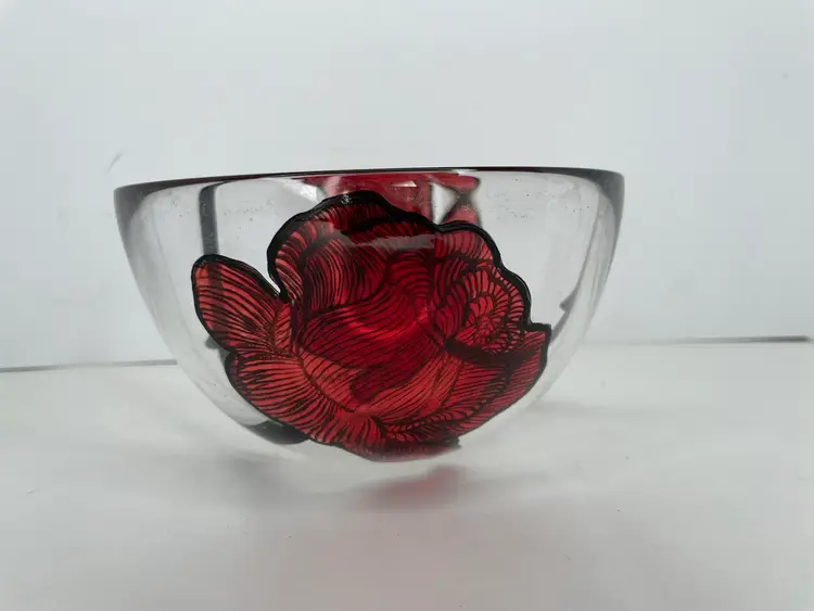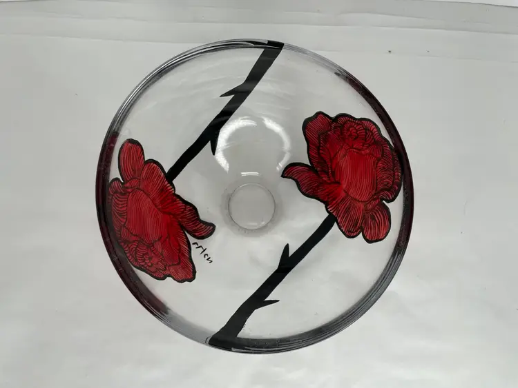 Add a touch of Scandinavian artistry to your home with this stunning Kosta Boda glass bowl, featuring the iconic Rose Tattoo pattern. Designed by master glass artist Ludwig Lofgren & painted by Carina Niklasson, this bowl is a true work of art, hand painted with exquisite detail. Measuring 6 inches in diameter and 3 3/8 inches in height, this round decorative bowl is perfect for all occasions.