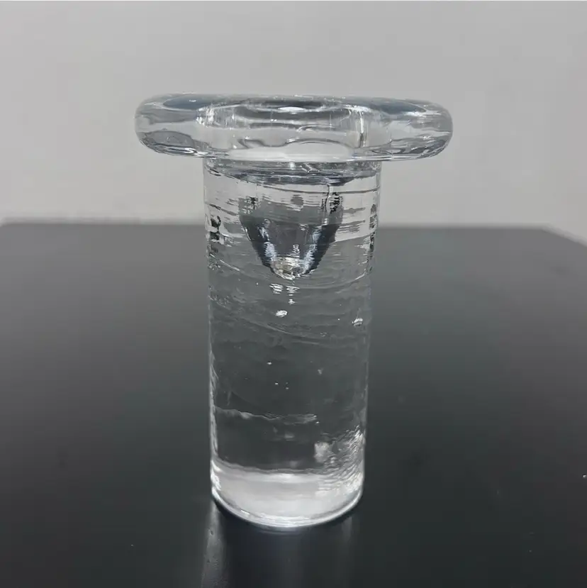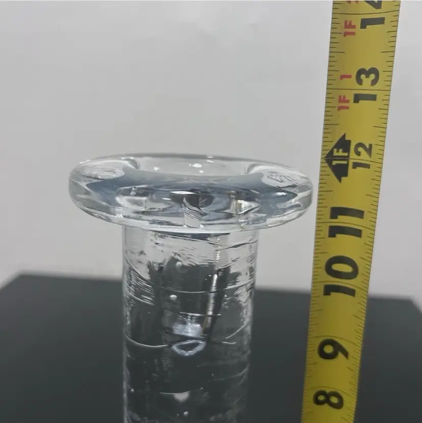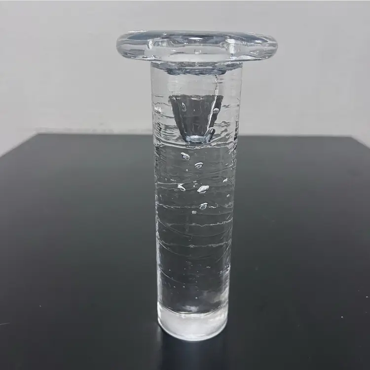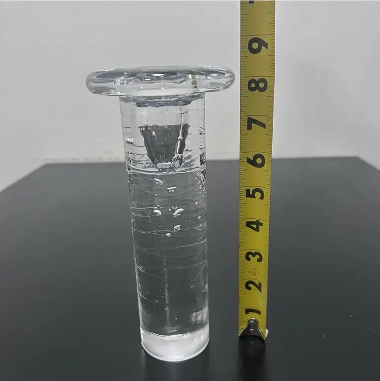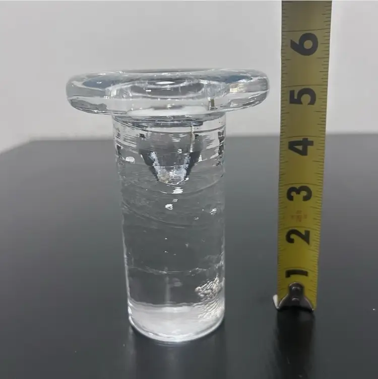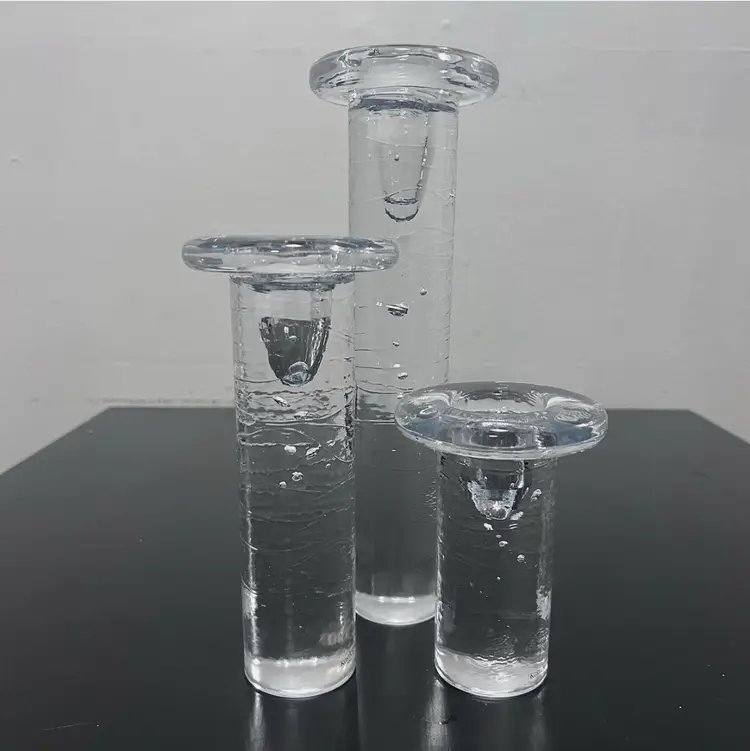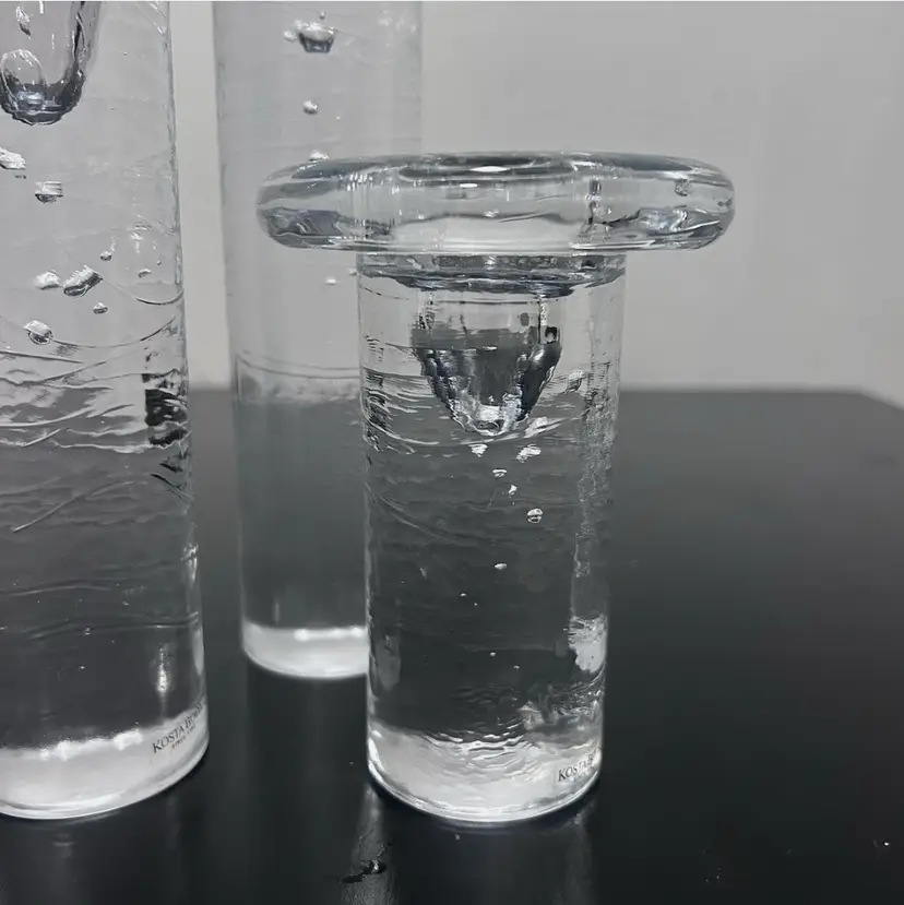 Set of 3 vintage Kosta Boda Sweden art glass candle holders. Each features the classic controlled bubble design (Bullicante technique), showcasing Kosta Boda’s Scandinavian modern craftsmanship. Heavy, clear glass construction with a wide flat rim to securely hold candles.
