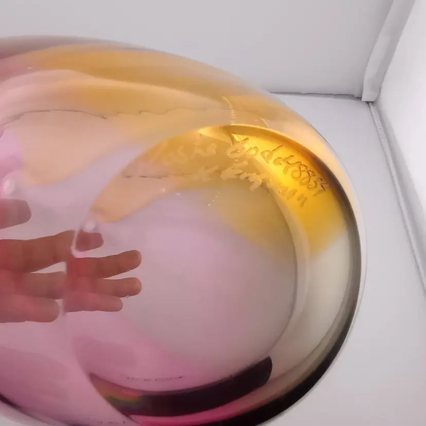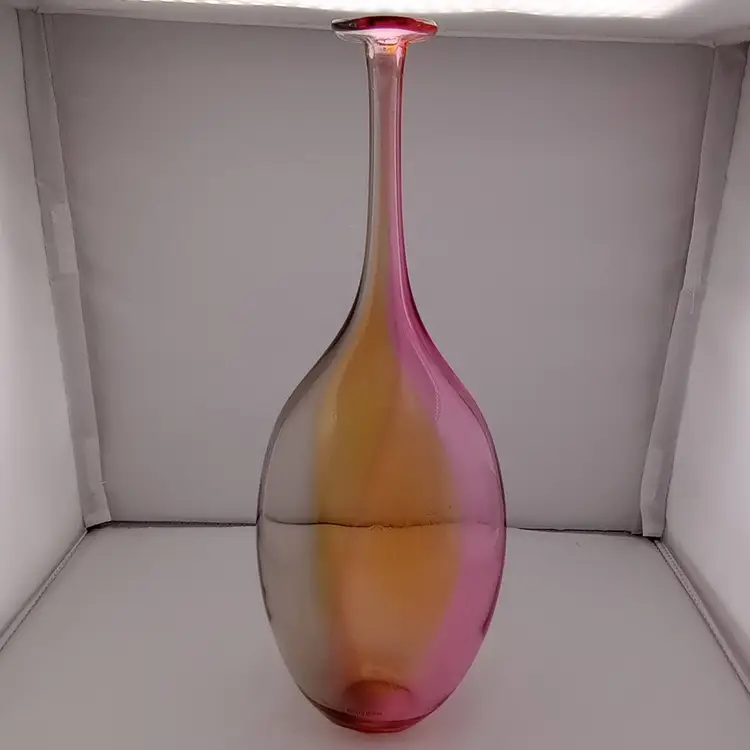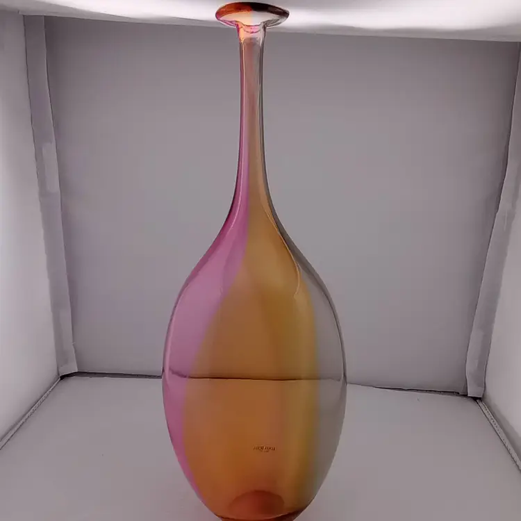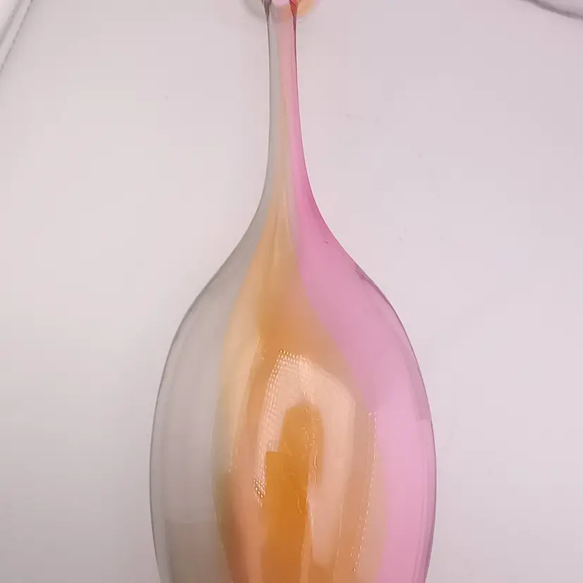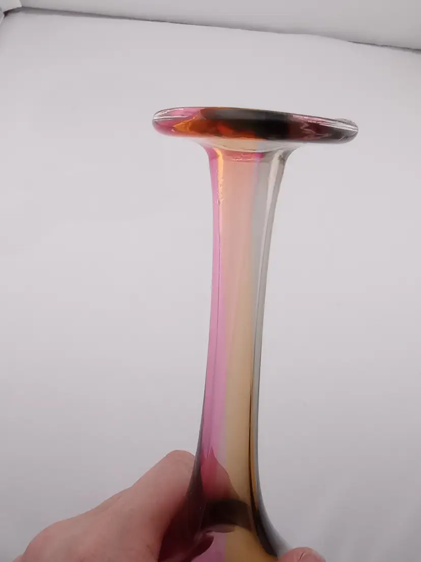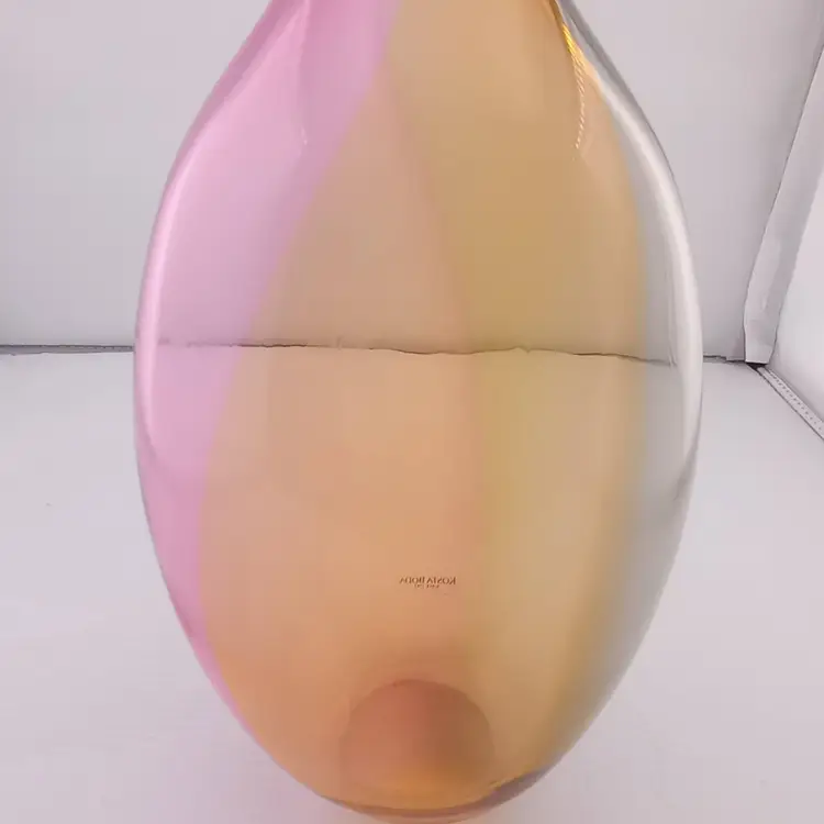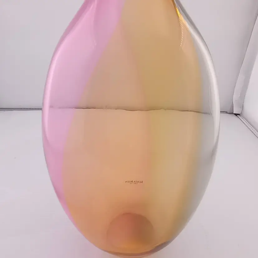 This is a gorgeous piece of Kosta Boda art glass, design #48839, signed by artist Kjell Engman. It is in excellent condition with no chips or cracks and the original sticker. It is pink, amber, and blue, 14.5" tall, and just stunning in person.