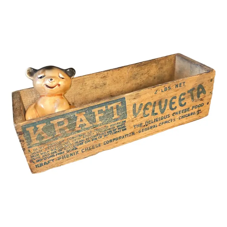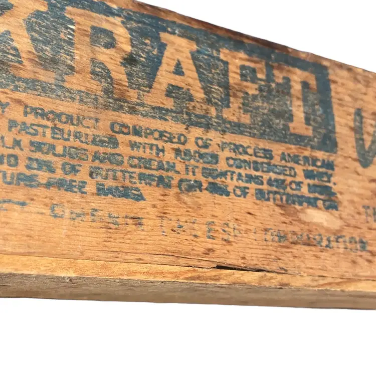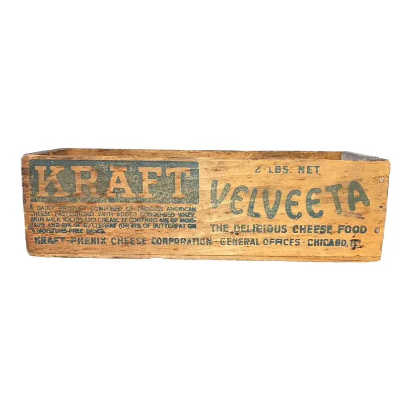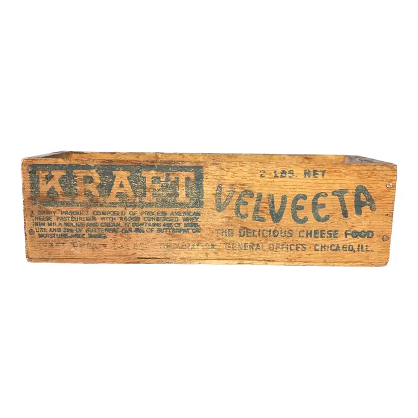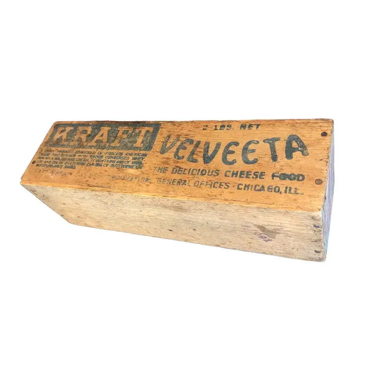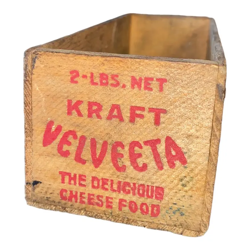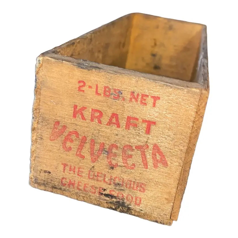 •wooden box that a 2lb block of Kraft Velveeta was sold in during the 1940s/50s. •very good vintage condition except small split one side (pictured)
