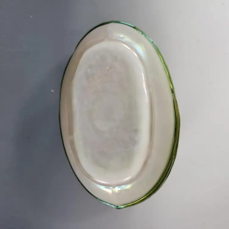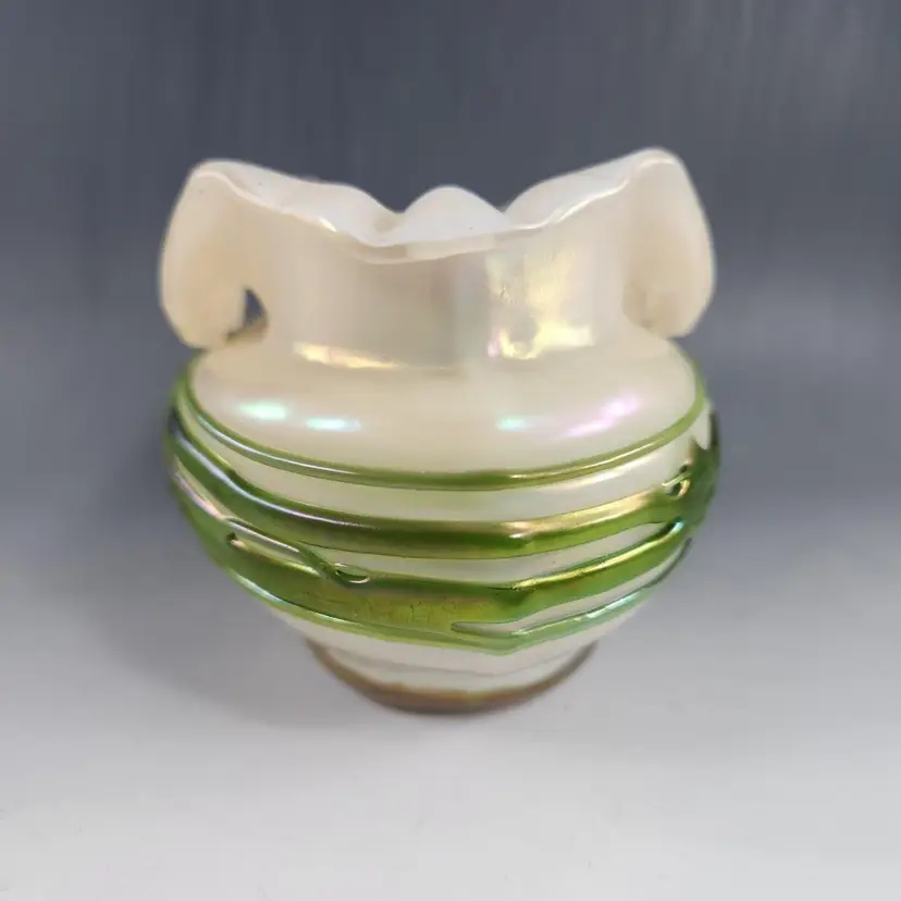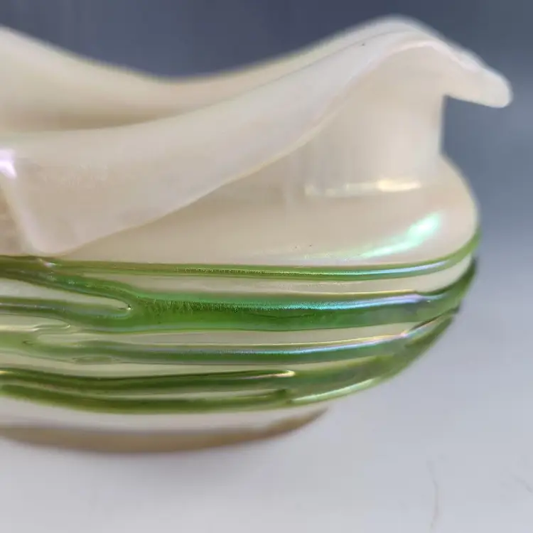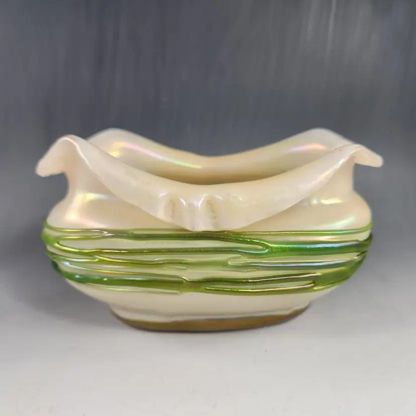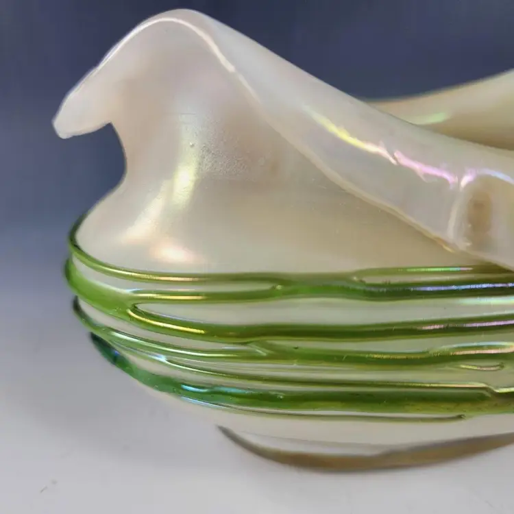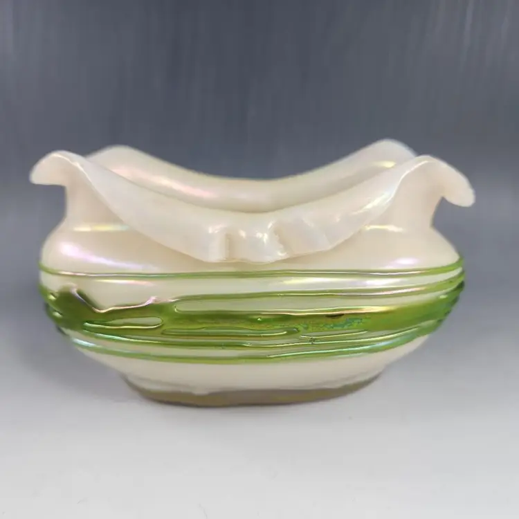 Beautiful Kralik art glass bowl from the Art Nouveau period (based on my research about 1904.) This is from their corded series. Blown glass with a polished pontil. The body of the glass looks like a natural pearl, it is cream colored with a pearlized iridescent exterior wrapped in emerald green threading with a crimped rim. This is the oval form from the series which is less common than the round.